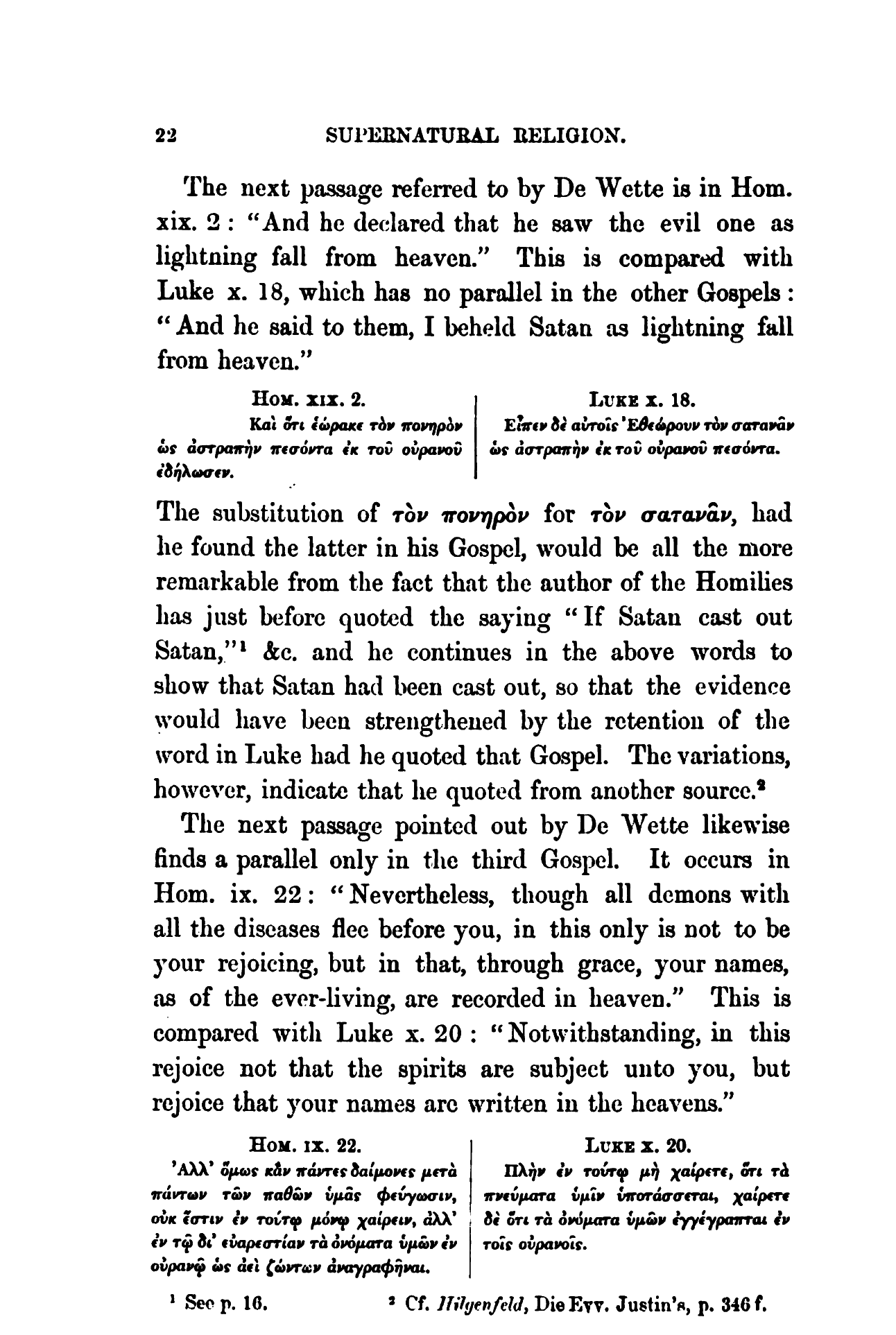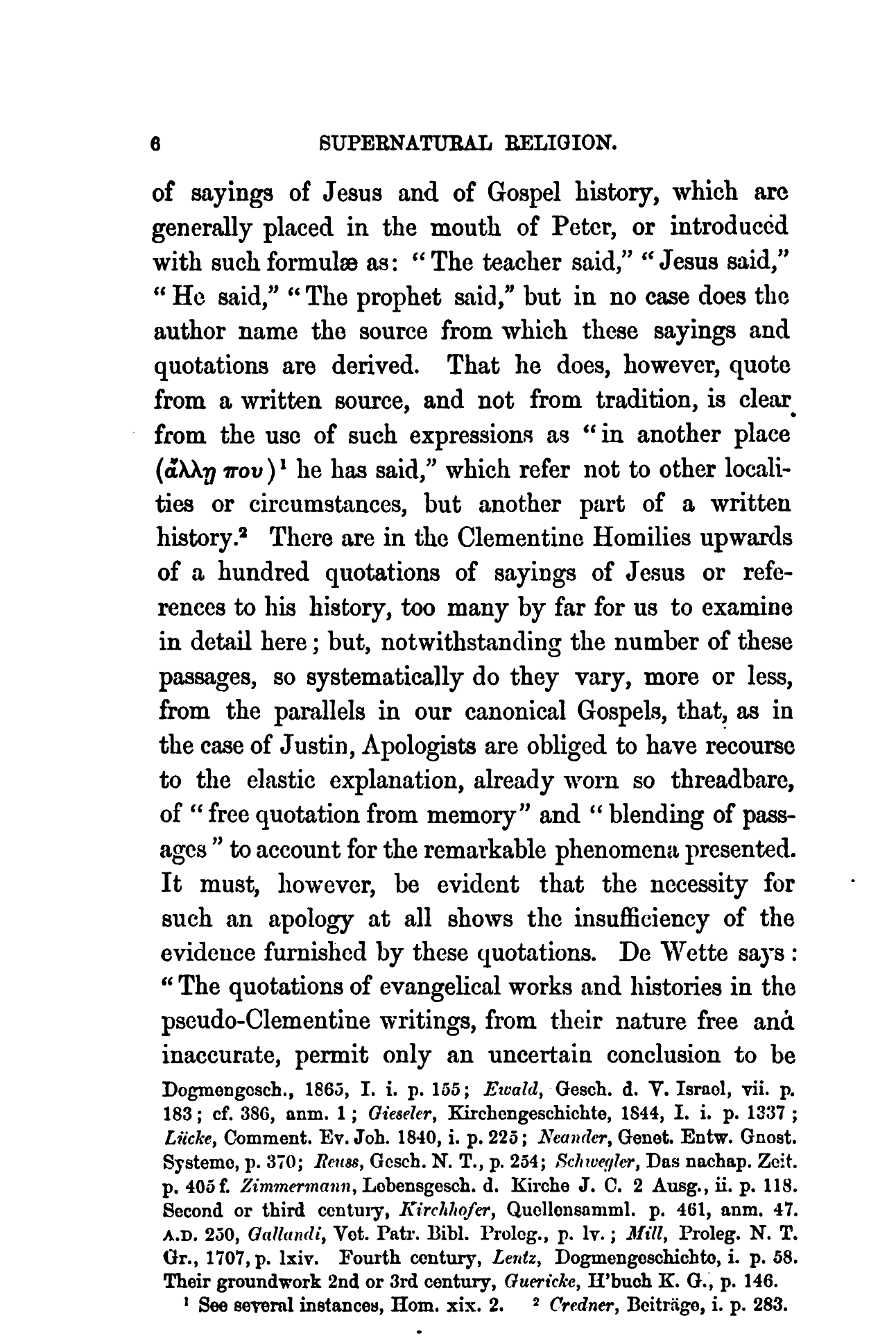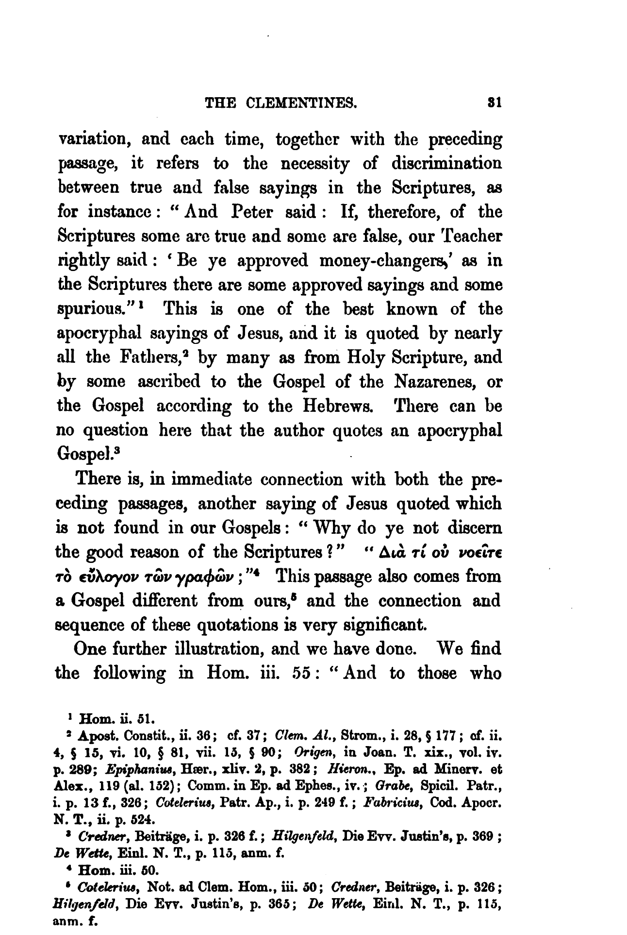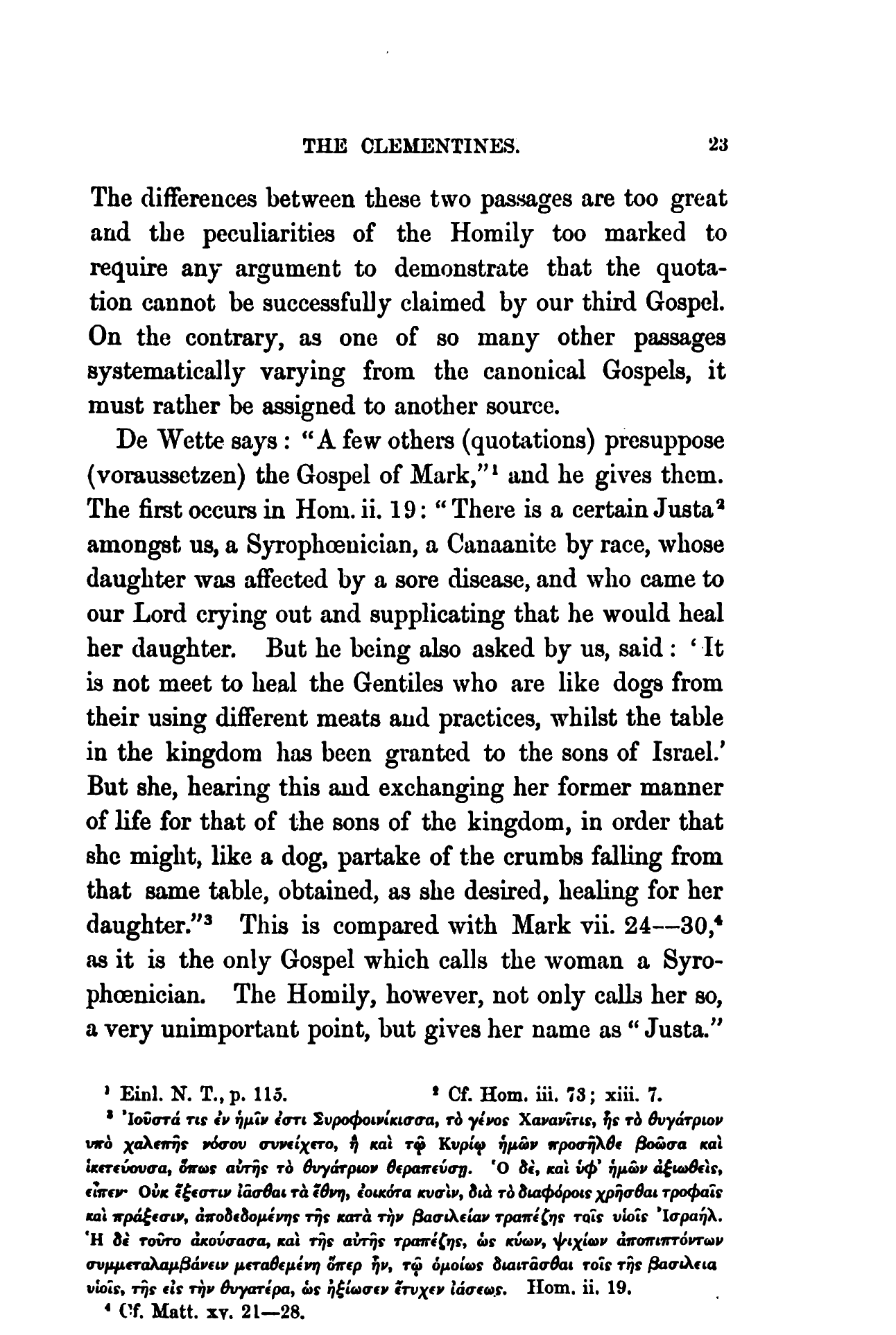 of sayings of Jesus and of Gospel history, which are generally placed in the mouth of Peter, or introduced with such formulae as: "The teacher said," "Jesus said," "He said," "The prophet said," but in no case does the author name the source from which these sayings and quotations are derived. That he does, however, quote from a written source, and not from tradition, is clear from the use of such expressions as "in another place [———](1) he has said," which refer not to other localities or circumstances, but another part of a written history.(2) There are in the Clementine Homilies upwards of a hundred quotations of sayings of Jesus or references to his history, too many by far for us to examine in detail here; but, notwithstanding the number of these passages, so systematically do they vary, more or less, from the parallels in our canonical Gospels, that, as in the case of Justin, Apologists are obliged to have recourse to the elastic explanation, already worn so threadbare, of "free quotation from memory" and "blending of passages" to account for the remarkable phenomena presented. It must, however, be evident that the necessity for such an apology at all shows the insufficiency of the evidence furnished by these quotations. De Wette says: "The quotations of evangelical works and histories in the pseudo-Clementine writings, from their nature free and inaccurate, permit only an uncertain conclusion to be