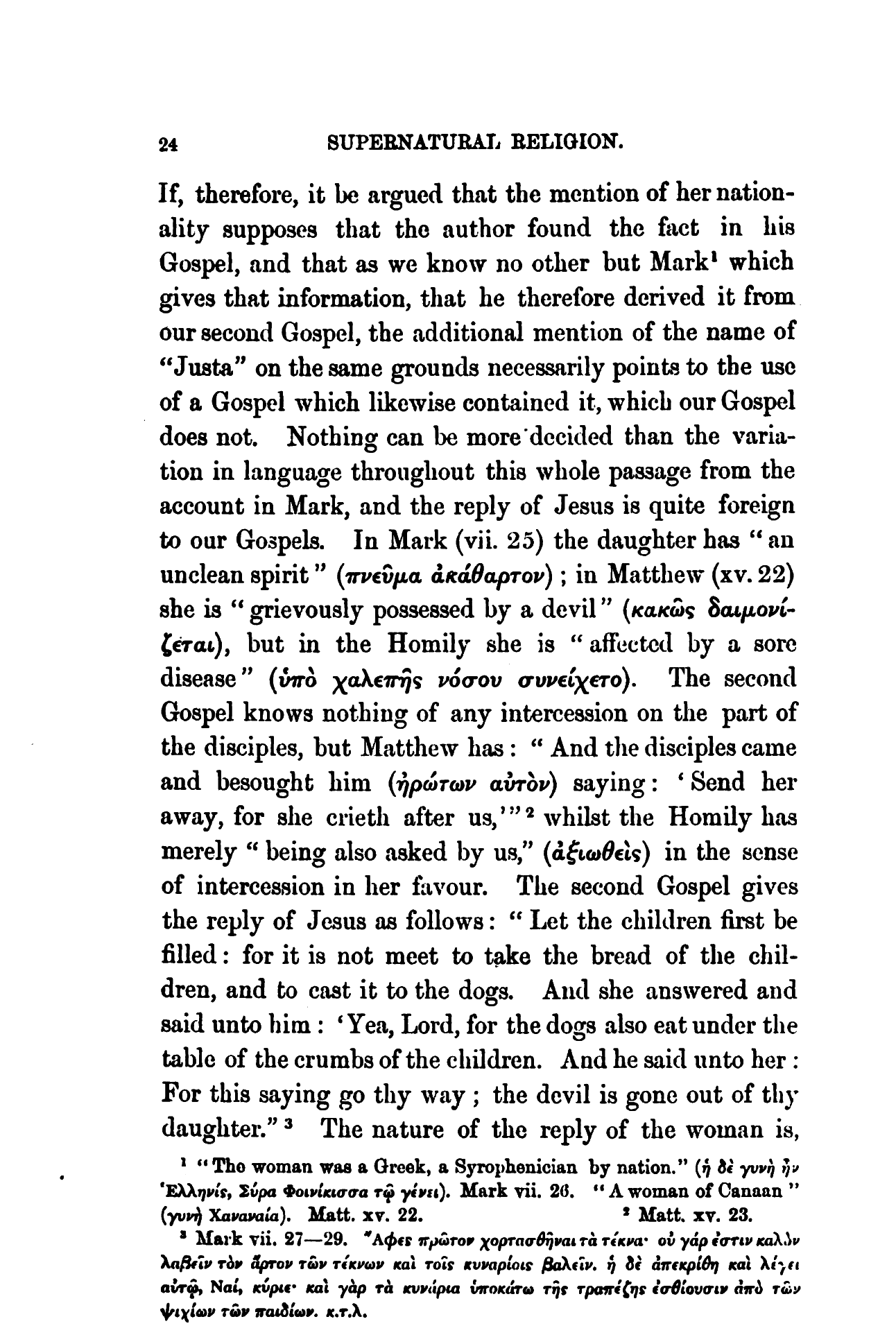 De Wette says: "A few others (quotations) presuppose (voraussetzen) the Gospel of Mark,"(1) and he gives them. The first occurs in Hom. ii. 19: "There is a certain Justa(2) amongst us, a Syrophoenician, a Canaantte by race, whose daughter was affected by a sore disease, and who came to our Lord crying out and supplicating that he would heal her daughter. But he being also asked by us, said: 'It is not meet to heal the Gentiles who are like dogs from their using different meats and practices, whilst the table in the kingdom has been granted to the sons of Israel.' But she, hearing this and exchanging her former manner of life for that of the sons of the kingdom, in order that she might, like a dog, partake of the crumbs falling from that same table, obtained, as she desired, healing for her daughter."(3) This is compared with Mark vii. 24—30,(4) as it is the only Gospel which calls the woman a Syrophoenician. The Homily, however, not only calls her so, a very unimportant point, but gives her name as "Justa."