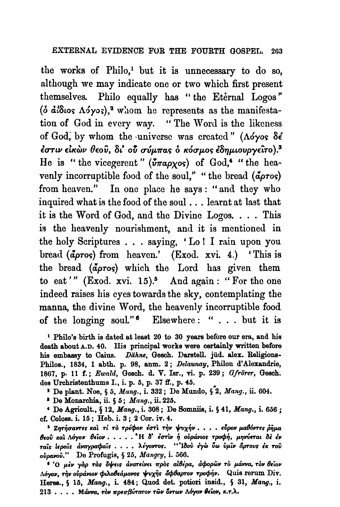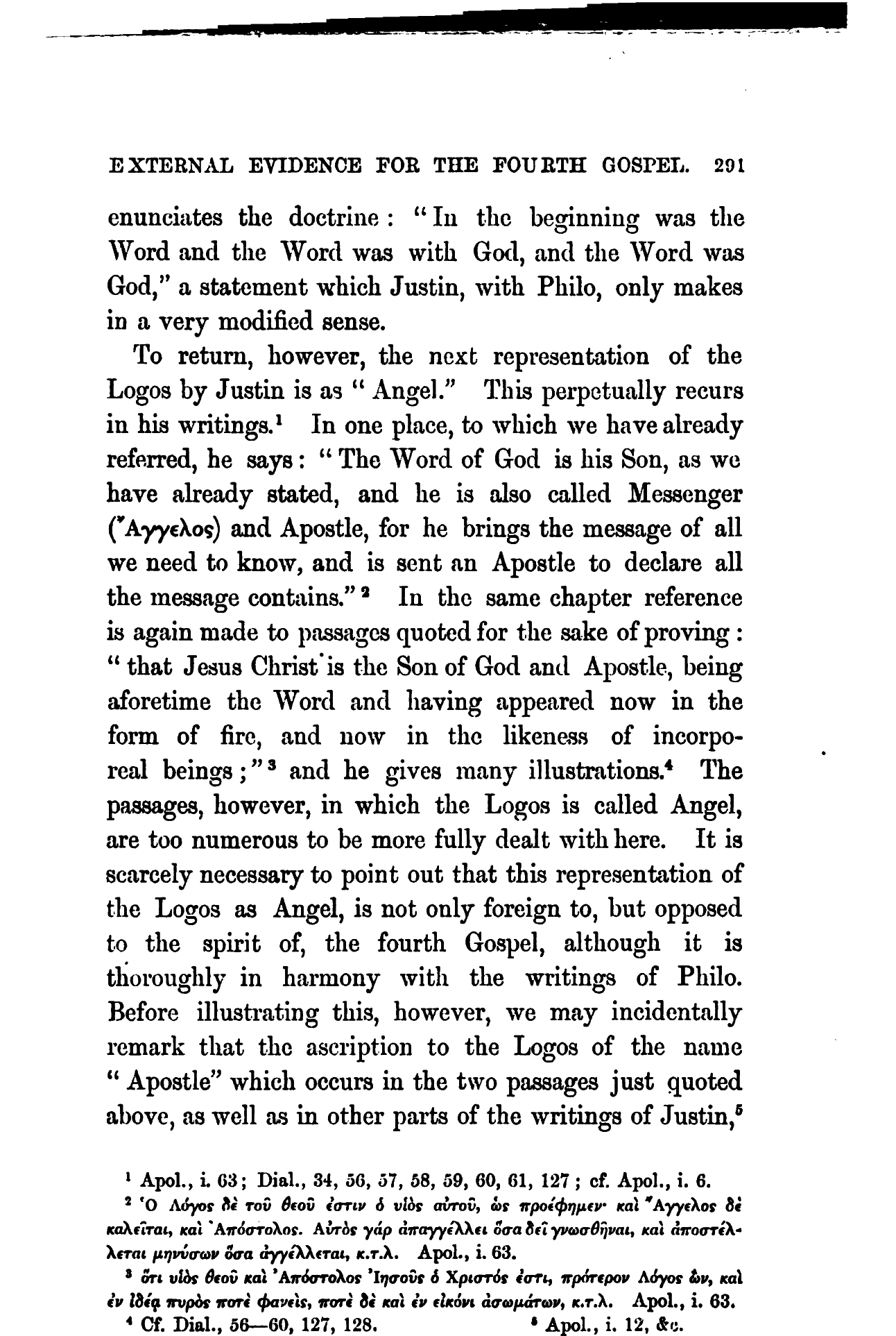 We have seen that, whilst there is not one particle of evidence during a century and a half after the events recorded in the fourth Gospel that it was composed by the son of Zebedee, there is, on the contrary, the strongest reason for believing that he did not write it. The first writer who quotes a passage of the Gospel with the mention of his name is Theophilus of Antioch, who gives the few words: "In the beginning was the Word and the Word was with God," as spoken by "John," whom he considers amongst the divinely inspired [———]