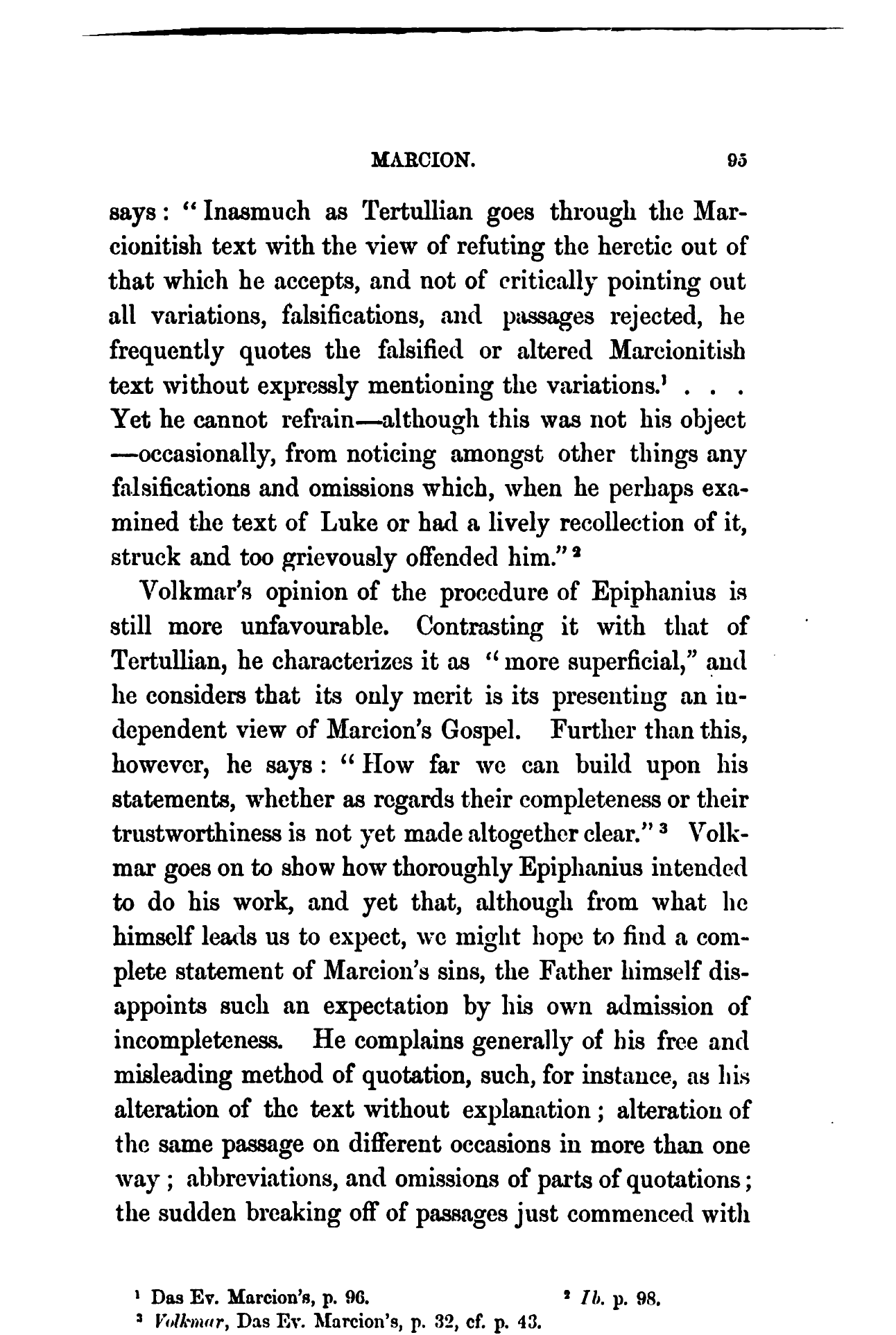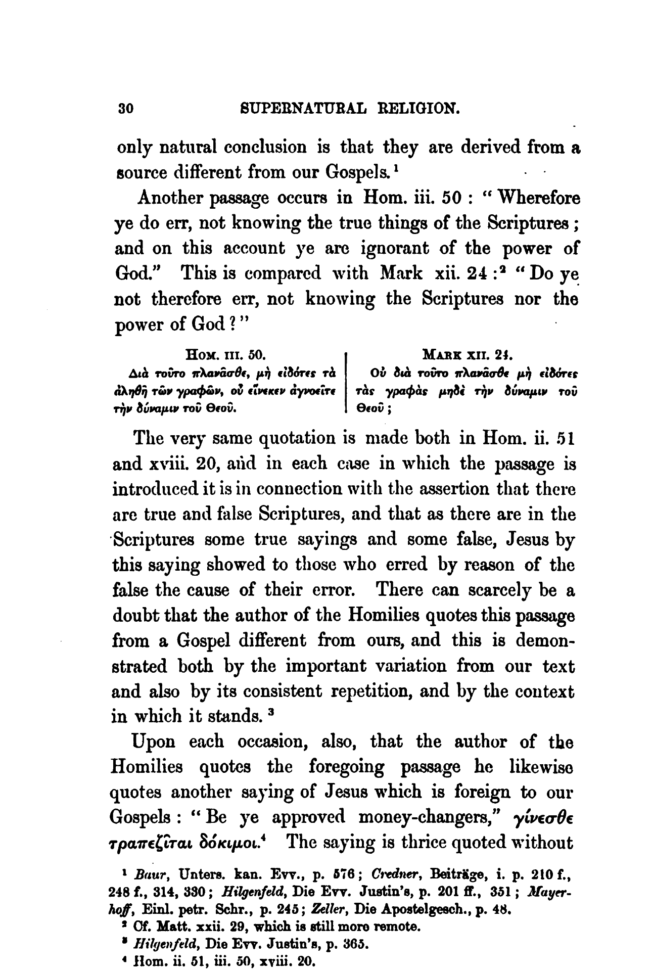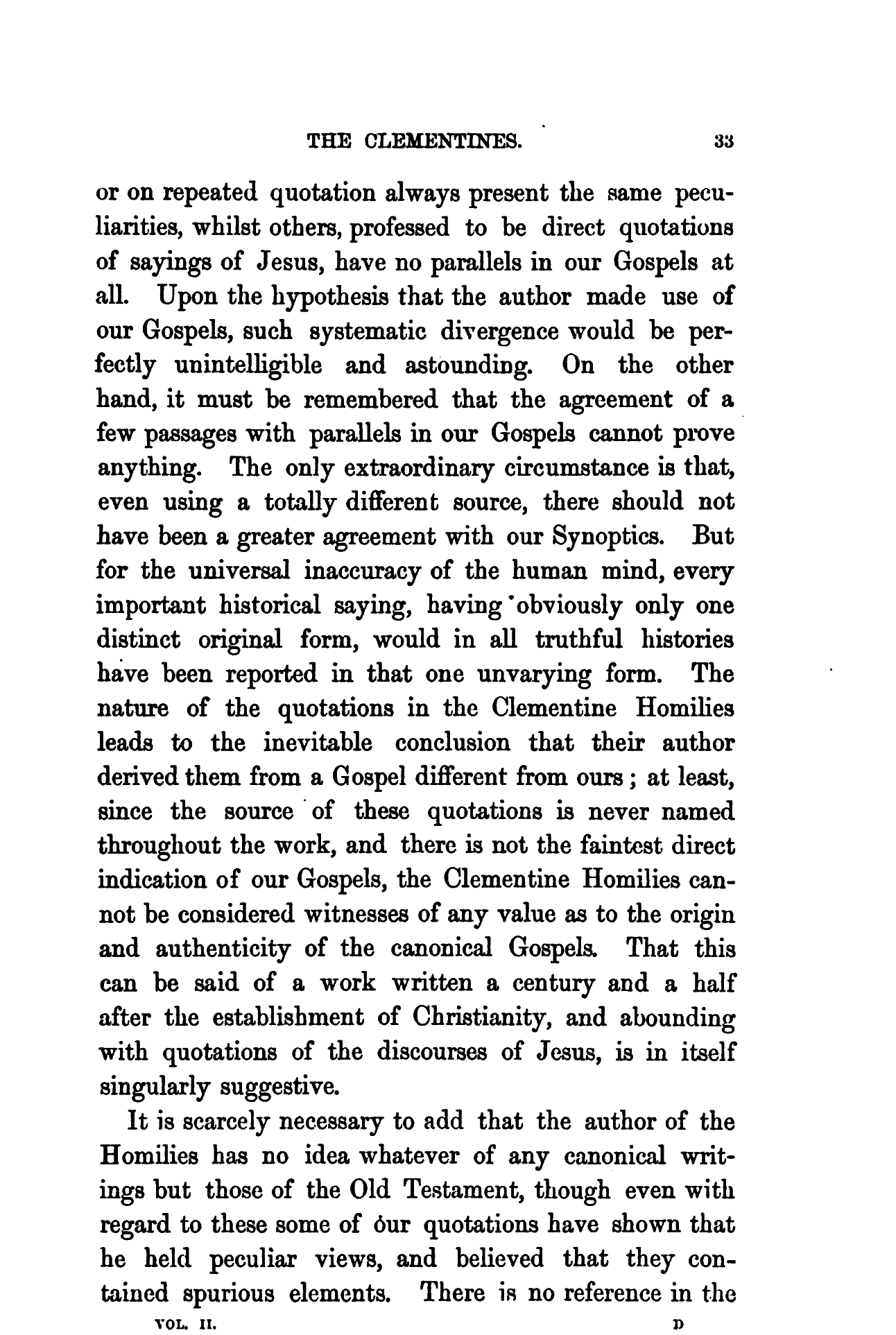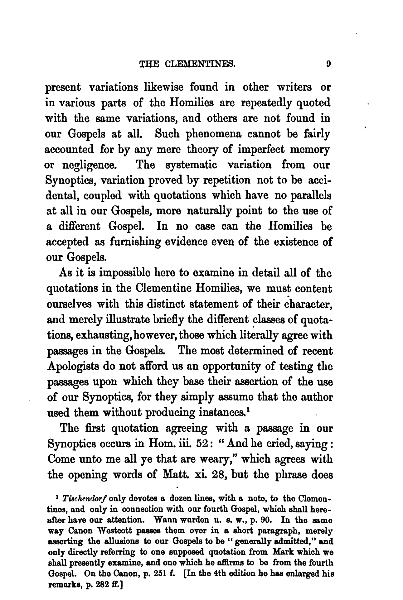 As it is impossible here to examine in detail all of the quotations in the Clementine Homilies, we must content ourselves with this distinct statement of their character, and merely illustrate briefly the different classes of quotations, exhausting, however, those which literally agree with passages in the Gospels. The most determined of recent Apologists do not afford us an opportunity of testing the passages upon which they base their assertion of the use of our Synoptics, for they simply assume that the author used them without producing instances.(1)