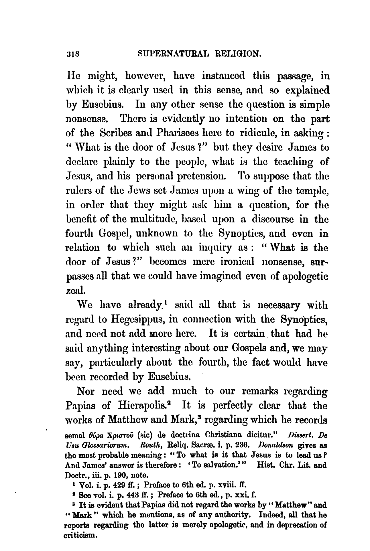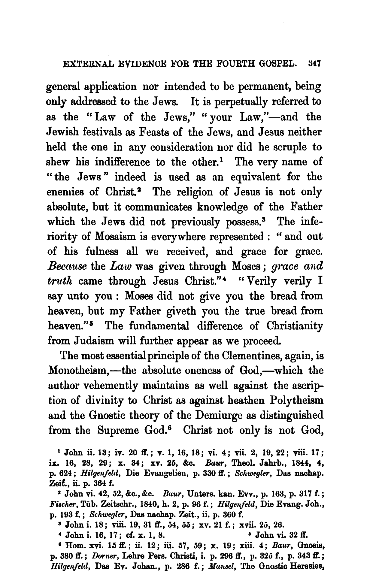 willing to admit the use of our Synoptics by the author of the Homilies along with other sources, make that concession on the strength of the absolute isolated evidence of the Homilies themselves, but they are generally moved by antecedent views on the point. In an inquiry like that which we have undertaken, however, such easy and indifferent judgment would obviously be out of place, and the point we have to determine is not whether an author may have been acquainted with our Gospels, but whether he furnishes testimony that he actually was in possession of our present Gospels and regarded them as authoritative.
