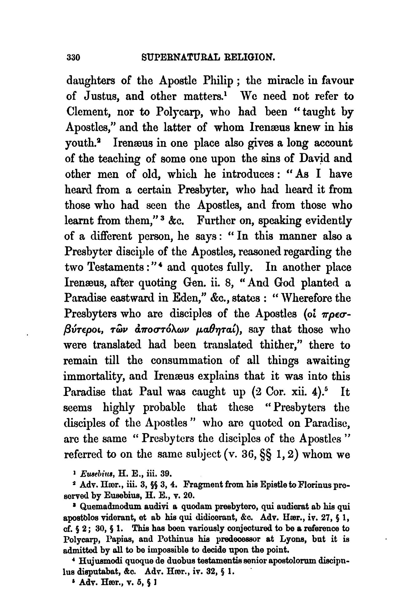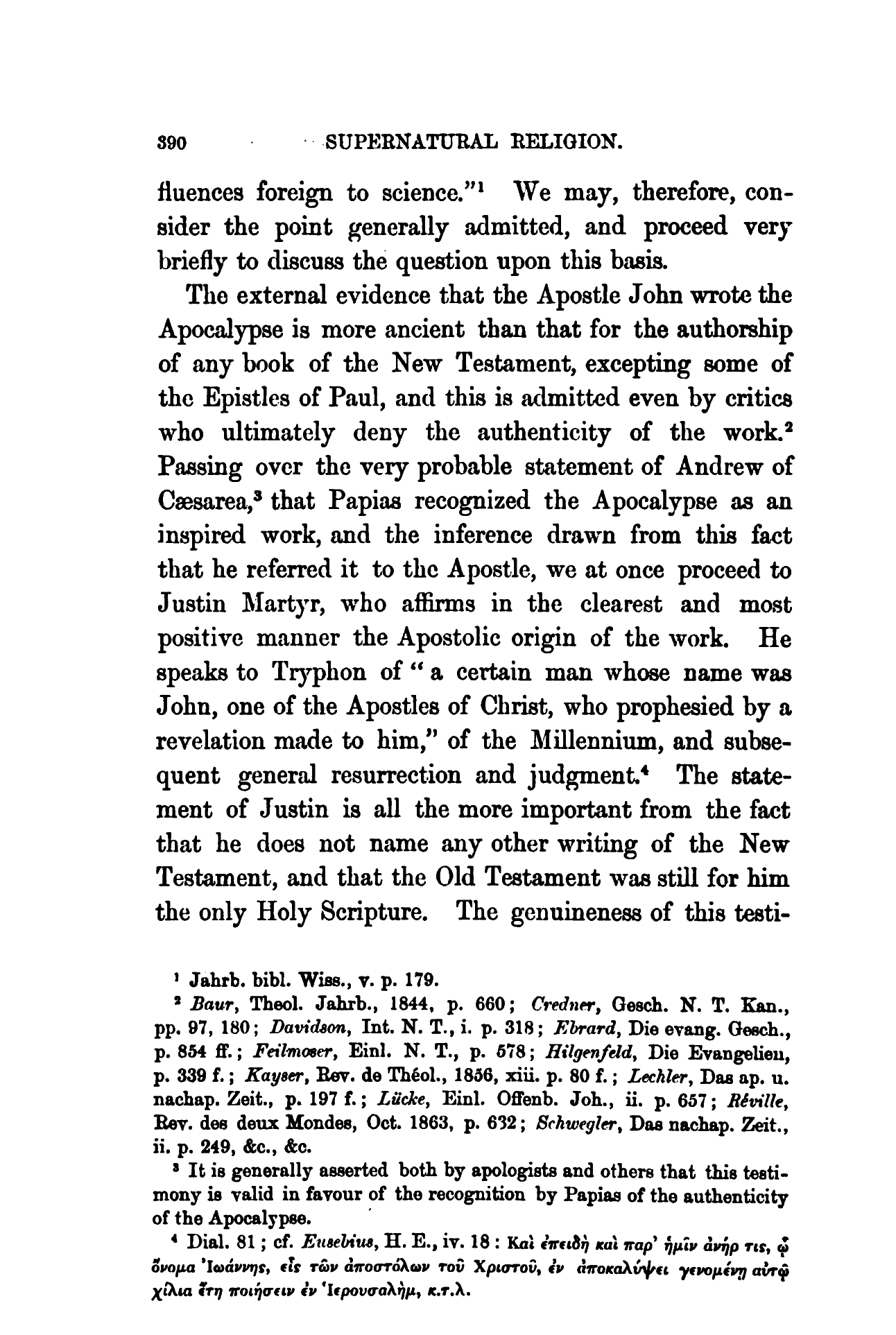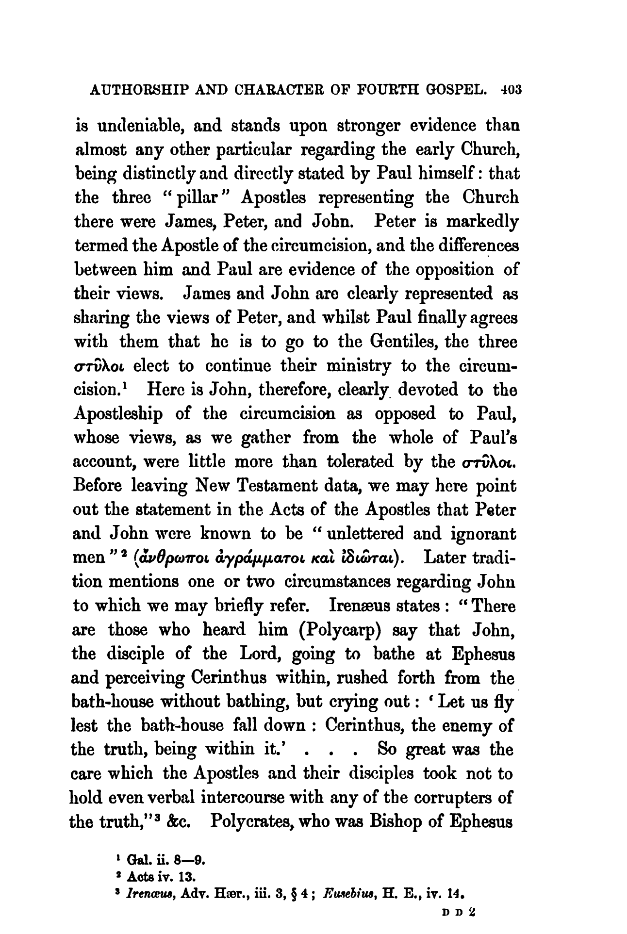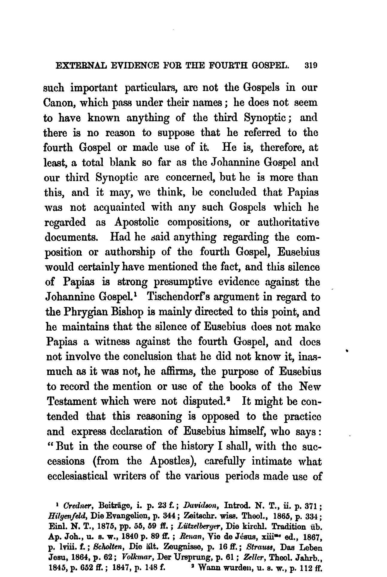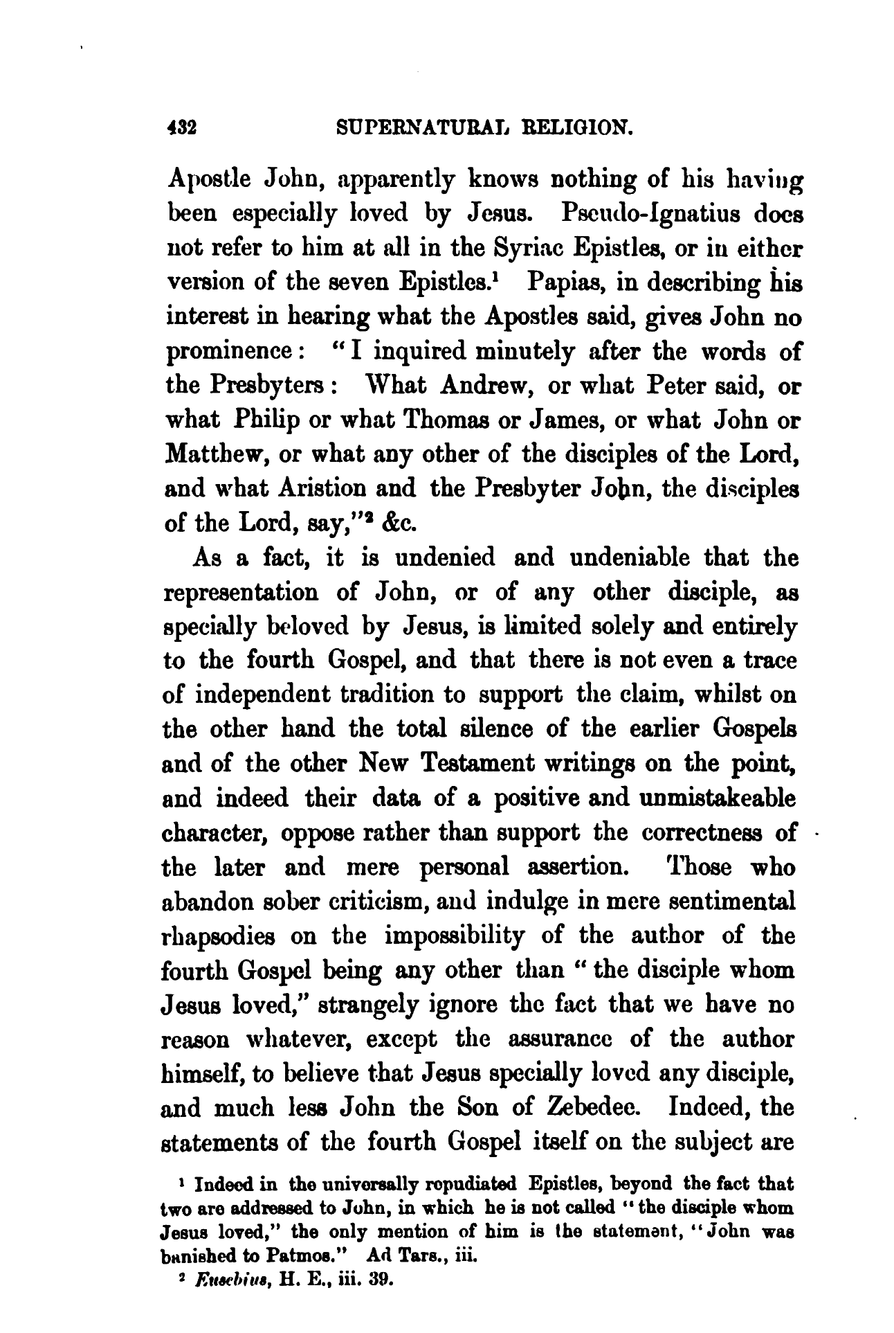 Apostle John. With regard to Papias, the only authority for the assertion that he knew the Epistle is the statement of Eusebius already quoted and discussed, that: "He used testimonies out of John's first Epistle,"(1) There is no evidence, however, even supposing the statement of Eusebius to be correct, that he ascribed it to the Apostle. The earliest undoubted references to the Epistle, in fact, are by Irenæus and Clement of Alexandria, so that this evidence is of little avail for the Gospel. There is no name attached to the first Epistle, and the second and third have the superscription of "the Presbyter," which, applying the argument of Ewald regarding the author of the Apocalypse, ought to be conclusive against their being written by an Apostle. As all three are evidently by the same writer, and intended to be understood as by the author of the Gospel, and that writer does not pretend to be an Apostle, but calls himself a simple Presbyter, the Epistles likewise give presumptive evidence against the apostolic authorship of the Gospel.