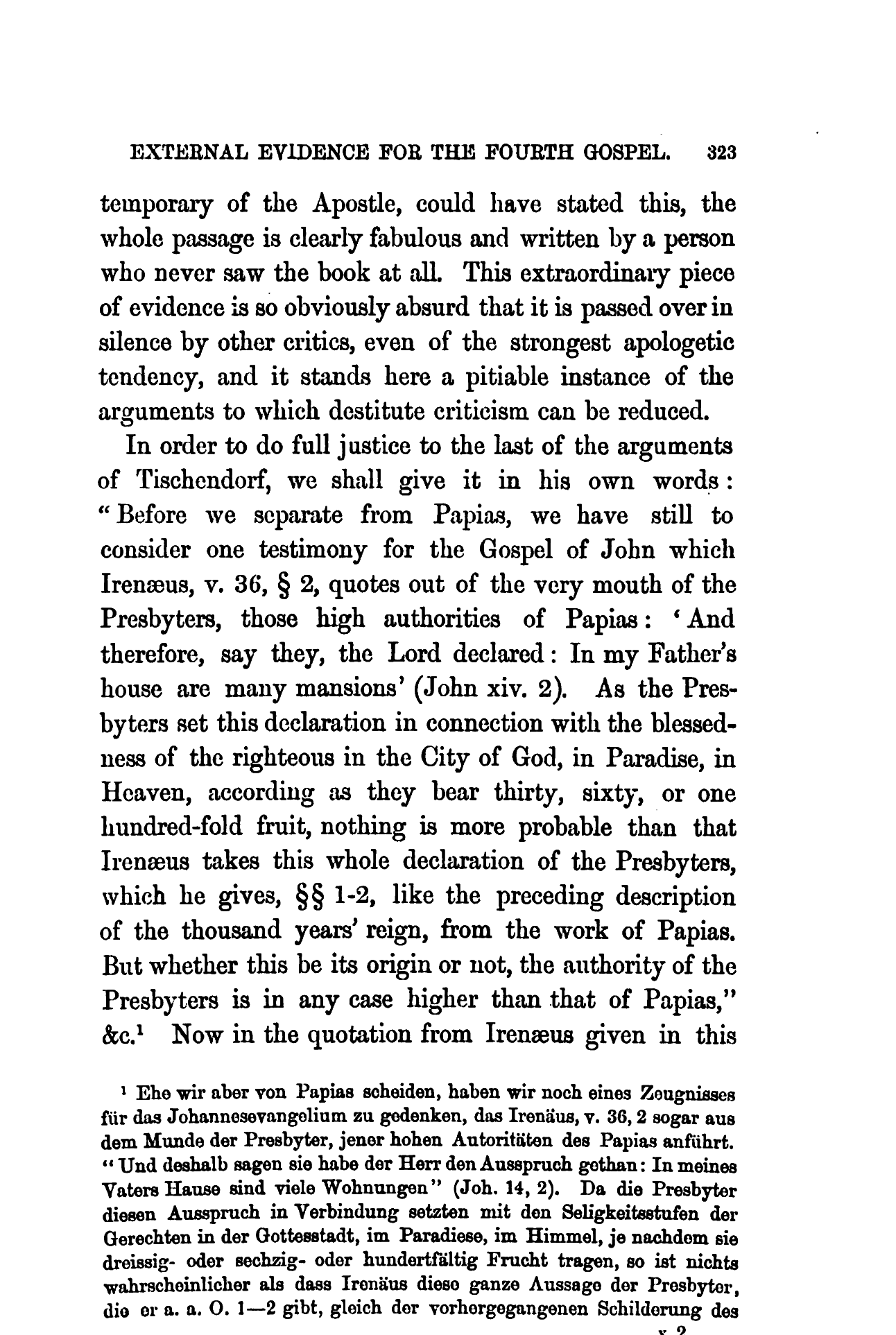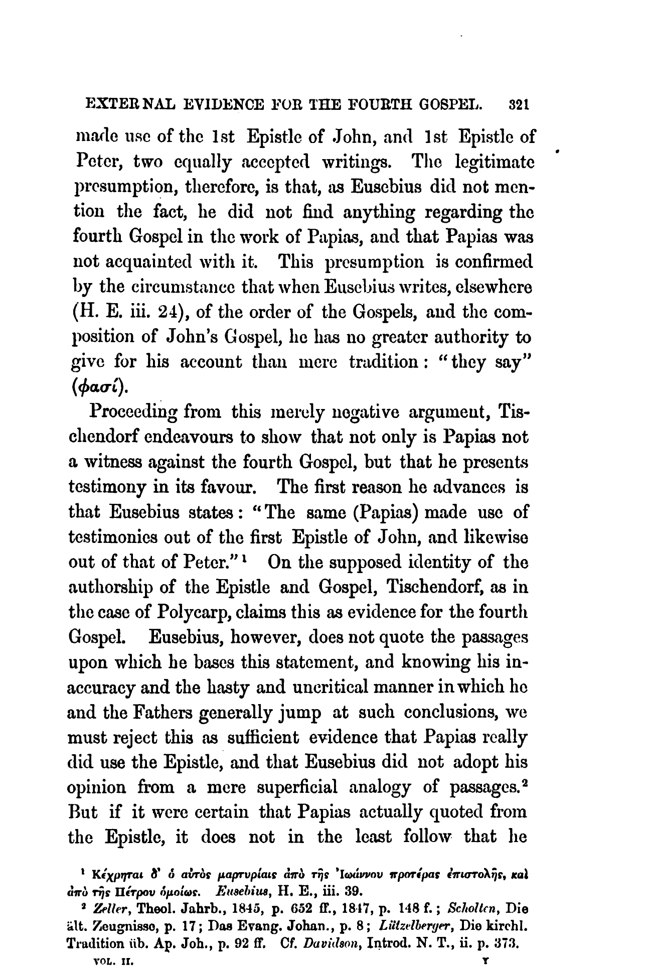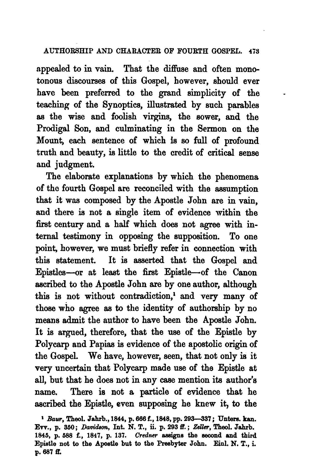 The elaborate explanations by which the phenomena of the fourth Gospel are reconciled with the assumption that it was composed by the Apostle John are in vain, and there is not a single item of evidence within the first century and a half which does not agree with internal testimony in opposing the supposition. To one point, however, we must briefly refer in connection with this statement. It is asserted that the Gospel and Epistles—or at least the first Epistle—of the Canon ascribed to the Apostle John are by one author, although this is not without contradiction,(1) and very many of those who agree as to the identity of authorship by no means admit the author to have been the Apostle John. It is argued, therefore, that the use of the Epistle by Polycarp and Papias is evidence of the apostolic origin of the Gospel. We have, however, seen, that not only is it very uncertain that Polycarp made use of the Epistle at all, but that he does not in any case mention its author's name. There is not a particle of evidence that he ascribed the Epistle, even supposing he knew it, to the
