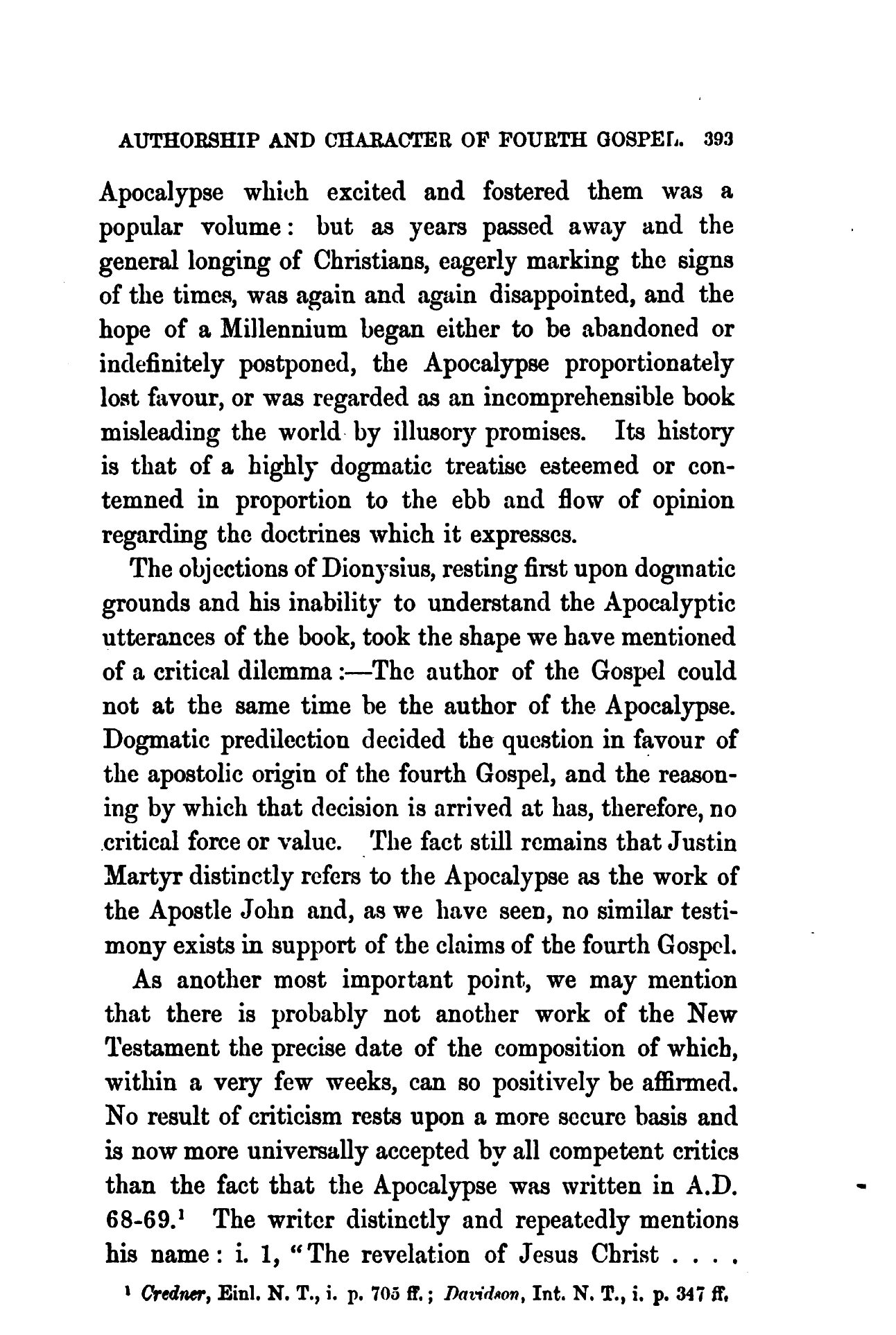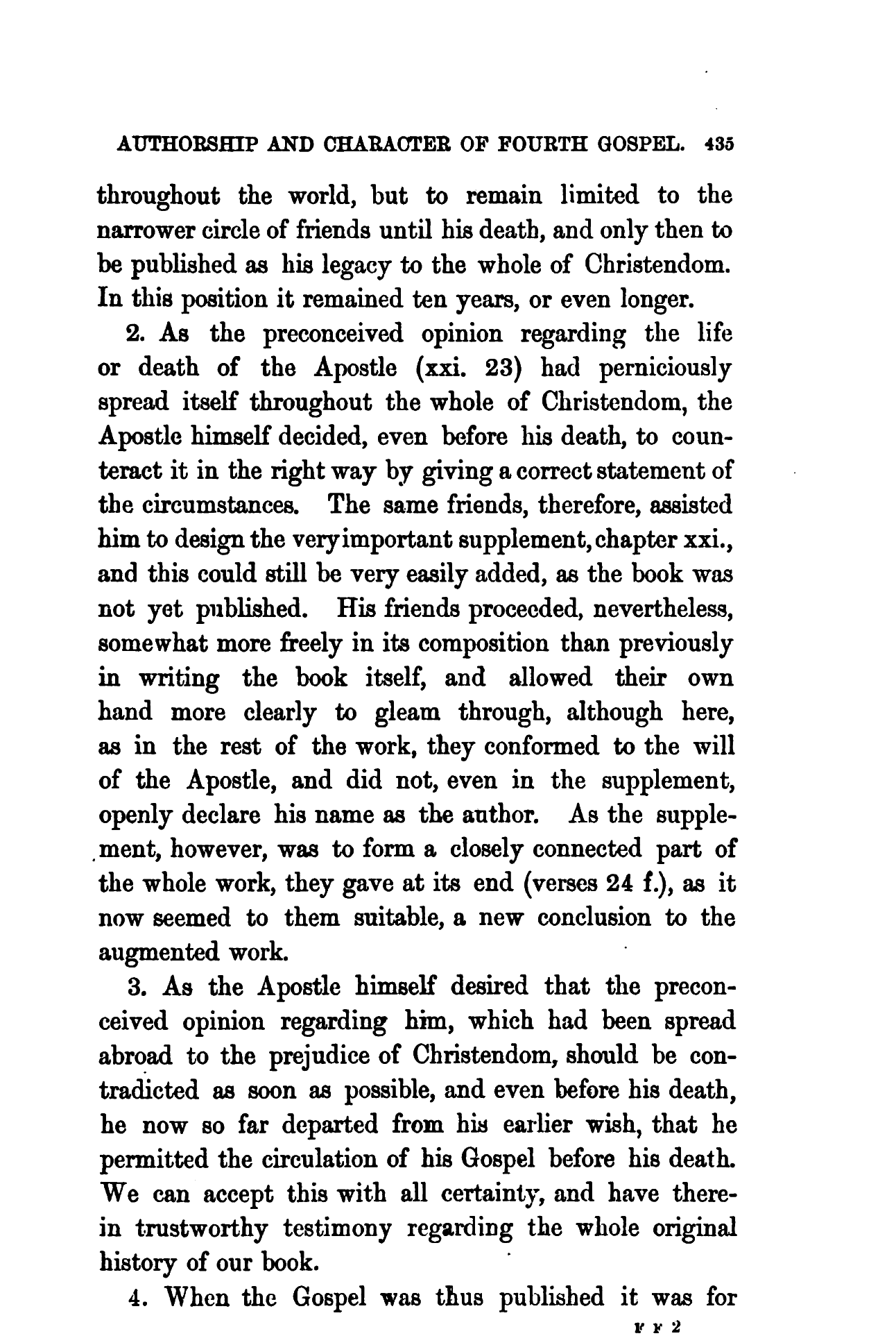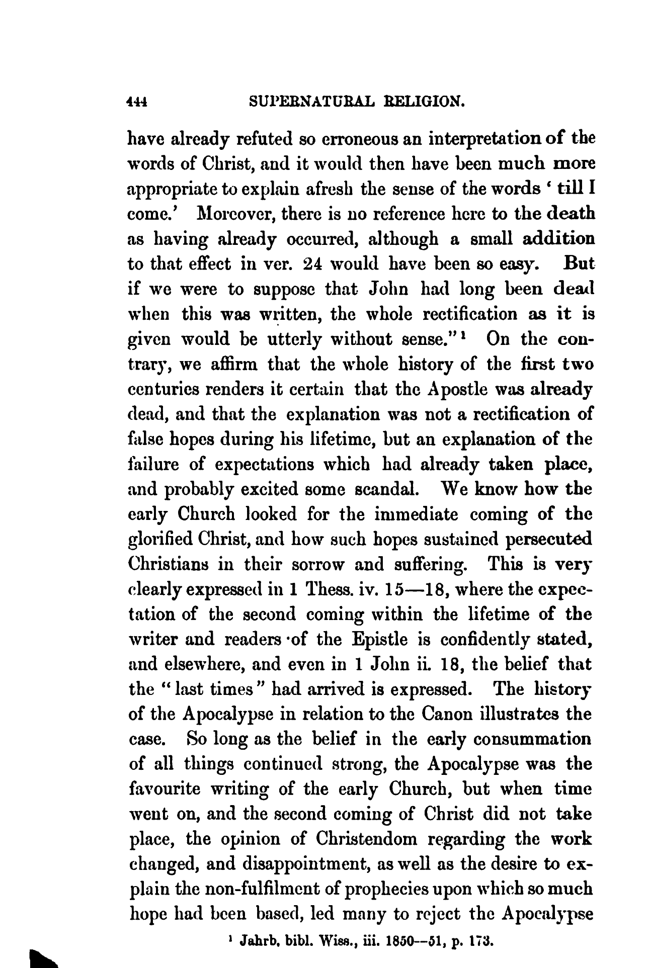 have already refuted so erroneous an interpretation of the words of Christ, and it would then have been much more appropriate to explain afresh the sense of the words 'till I come.' Moreover, there is no reference here to the death as having already occurred, although a small addition to that effect in ver. 24 would have been so easy. But if we were to suppose that John had long been dead when this was written, the whole rectification as it is given would be utterly without sense."(1) On the contrary, we affirm that the whole history of the first two centuries renders it certain that the Apostle was already dead, and that the explanation was not a rectification of false hopes during his lifetime, but an explanation of the failure of expectations which had already taken place, and probably excited some scandal. We know how the early Church looked for the immediate coming of the glorified Christ, and how such hopes sustained persecuted Christians in their sorrow and suffering. This is very clearly expressed in 1 Thess. iv. 15—18, where the expectation of the second coming within the lifetime of the writer and readers of the Epistle is confidently stated, and elsewhere, and even in 1 John ii. 18, the belief that the "last times" had arrived is expressed. The history of the Apocalypse in relation to the Canon illustrates the case. So long as the belief in the early consummation of all things continued strong, the Apocalypse was the favourite writing of the early Church, but when time went on, and the second coming of Christ did not take place, the opinion of Christendom regarding the work changed, and disappointment, as well as the desire to explain the non-fulfilment of prophecies upon which so much hope had been based, led many to reject the Apocalypse