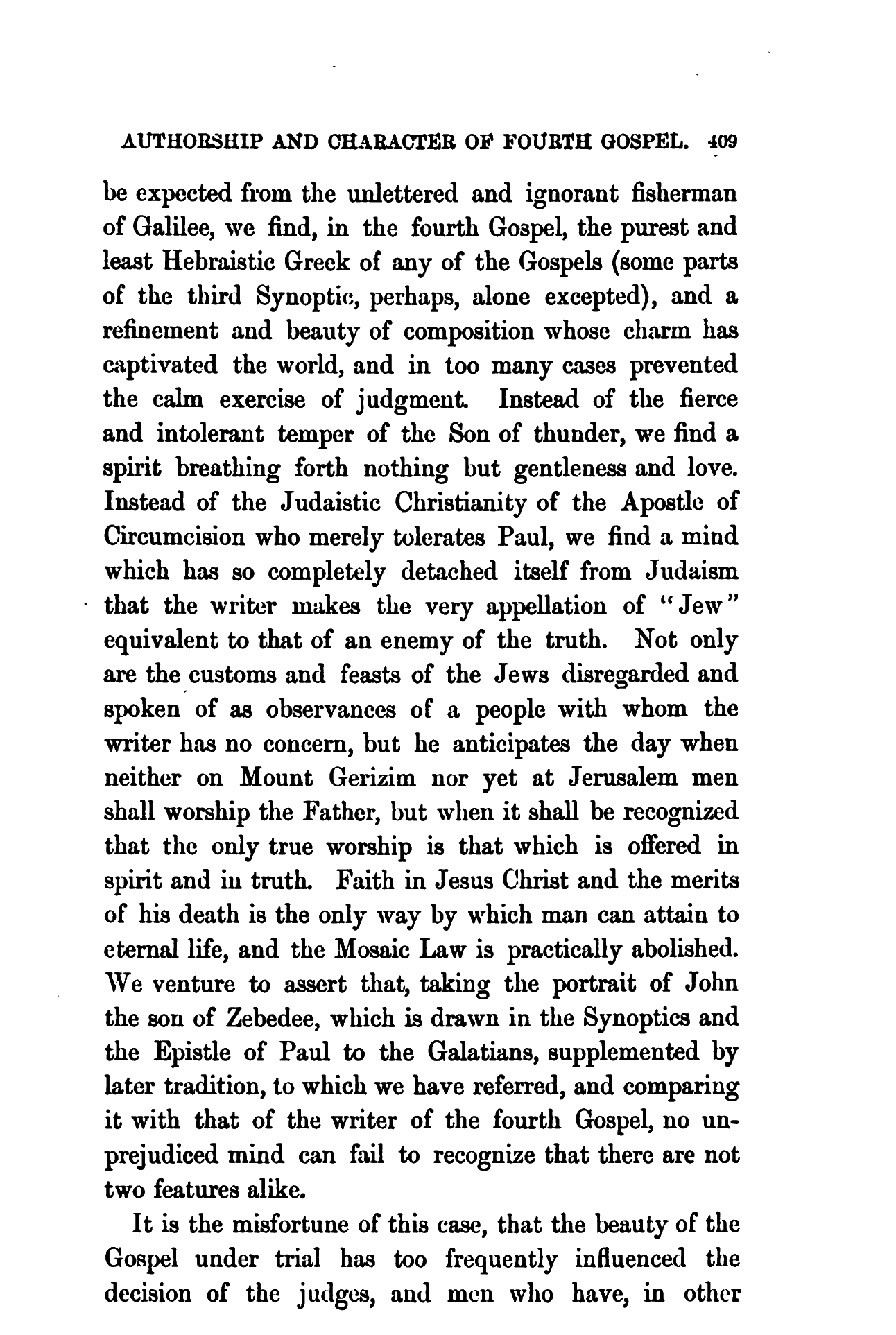 We have already pointed out the evident traces of artificial construction in the discourses and dialogues of the fourth Gospel, and the more closely these are examined, the more clear does it become that they are not genuine reports of the teaching of Jesus, but mere ideal compositions by the author of the fourth Gospel. The speeches of John the Baptist, the discourses of Jesus, and the reflections of the Evangelist himself,(2) are marked by the same peculiarity of style and proceed from the same mind. It is scarcely possible to determine where the one begins and the other ends.(3) It is quite clear, for instance, that the author himself, without a break, continues the words which he puts into the mouth of Jesus, in the colloquy with Nicodemus, but it is not easy to determine where. The whole dialogue is artificial in the extreme, and is certainly not genuine, and this is apparent not only from the replies attributed to the "teacher of Israel," but to the irrelevant manner in which the reflections loosely ramble from the new birth to the dogmatic statements in the thirteenth and following verses, which are the never-failing resource of the