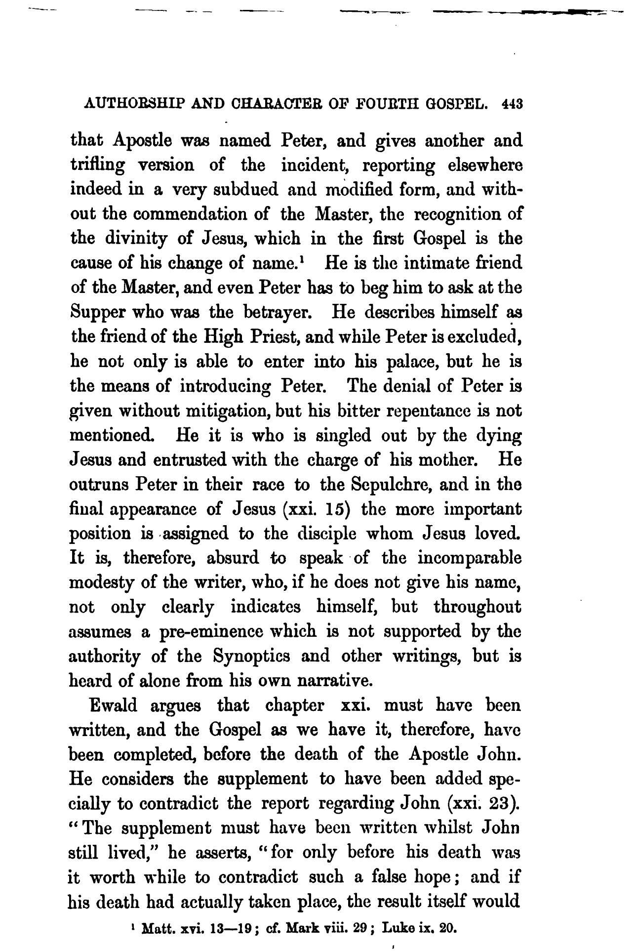 Ewald argues that chapter xxi. must have been written, and the Gospel as we have it, therefore, have been completed, before the death of the Apostle John. He considers the supplement to have been added specially to contradict the report regarding John (xxi. 23). "The supplement must have been written whilst John still lived," he asserts, "for only before his death was it worth while to contradict such a false hope; and if his death had actually taken place, the result itself would