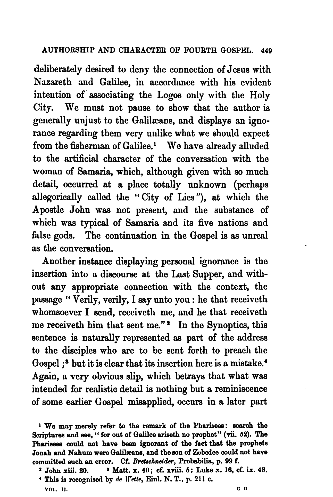 deliberately desired to deny the connection of Jesus with Nazareth and Galilee, in accordance with his evident intention of associating the Logos only with the Holy City. We must not pause to show that the author is generally unjust to the Galilaeans, and displays an ignorance regarding them very unlike what we should expect from the fisherman of Galilee.(1) We have already alluded to the artificial character of the conversation with the woman of Samaria, which, although given with so much detail, occurred at a place totally unknown (perhaps allegorically called the "City of Lies"), at which the Apostle John was not present, and the substance of which was typical of Samaria and its five nations and false gods. The continuation in the Gospel is as unreal as the conversation.