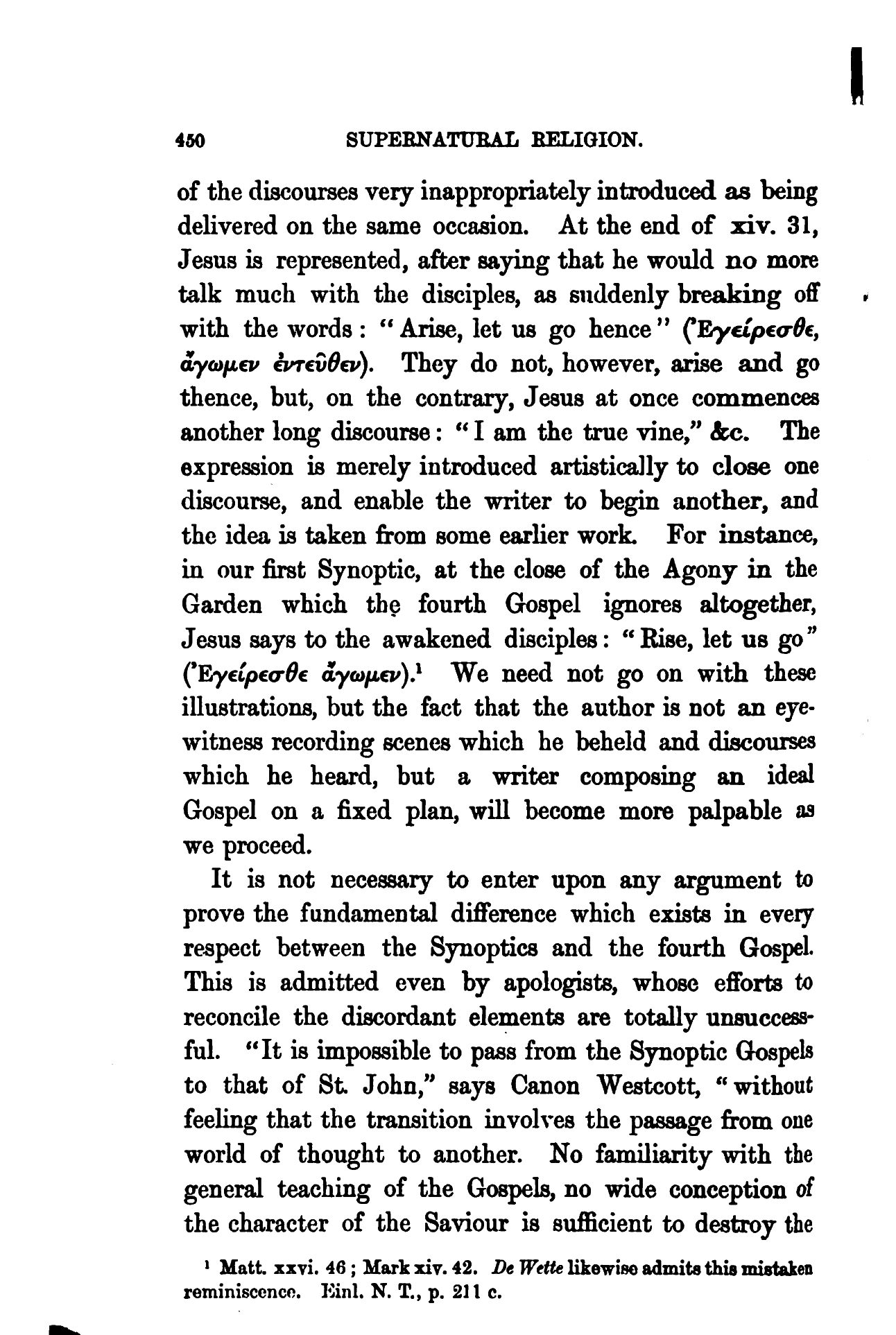 do not, however, arise and go thence, but, on the contrary, Jesus at once commences another long discourse: "I am the true vine," &c. The expression is merely introduced artistically to close one discourse, and enable the writer to begin another, and the idea is taken from some earlier work. For instance, in our first Synoptic, at the close of the Agony in the Garden which the fourth Gospel ignores altogether, Jesus says to the awakened disciples: "Rise, let us go" [———].(1) We need not go on with these illustrations, but the fact that the author is not an eyewitness recording scenes which he beheld and discourses which he heard, but a writer composing an ideal Gospel on a fixed plan, will become more palpable as we proceed.