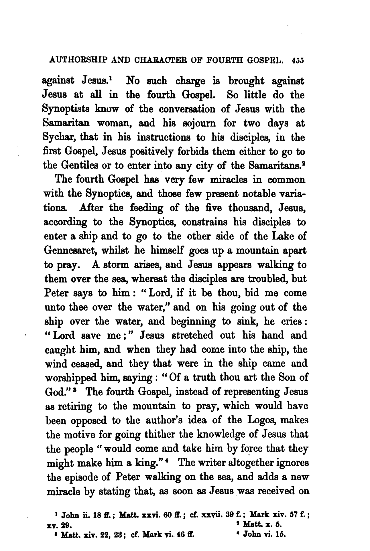 against Jesus.(1) No such charge is brought against Jesus at all in the fourth Gospel. So little do the Synoptists know of the conversation of Jesus with the Samaritan woman, and his sojourn for two days at Sychar, that in his instructions to his disciples, in the first Gospel, Jesus positively forbids them either to go to the Gentiles or to enter into any city of the Samaritans.(2) The fourth Gospel has very few miracles in common with the Synoptics, and those few present notable variations. After the feeding of the five thousand, Jesus, according to the Synoptics, constrains his disciples to enter a ship and to go to the other side of the Lake of Gennesaret, whilst he himself goes up a mountain apart to pray. A storm arises, and Jesus appears walking to them over the sea, whereat the disciples are troubled, but Peter says to him: "Lord, if it be thou, bid me come unto thee over the water," and on his going out of the ship over the water, and beginning to sink, he cries: "Lord save me;" Jesus stretched out his hand and caught him, and when they had come into the ship, the wind ceased, and they that were in the ship came and worshipped him, saying: "Of a truth thou art the Son of God." (3) The fourth Gospel, instead of representing Jesus as retiring to the mountain to pray, which would have been opposed to the authors idea of the Logos, makes the motive for going thither the knowledge of Jesus that the people "would come and take him by force that they might make him a king."(4) The writer altogether ignores the episode of Peter walking on the sea, and adds a new miracle by stating that, as soon as Jesus was received on