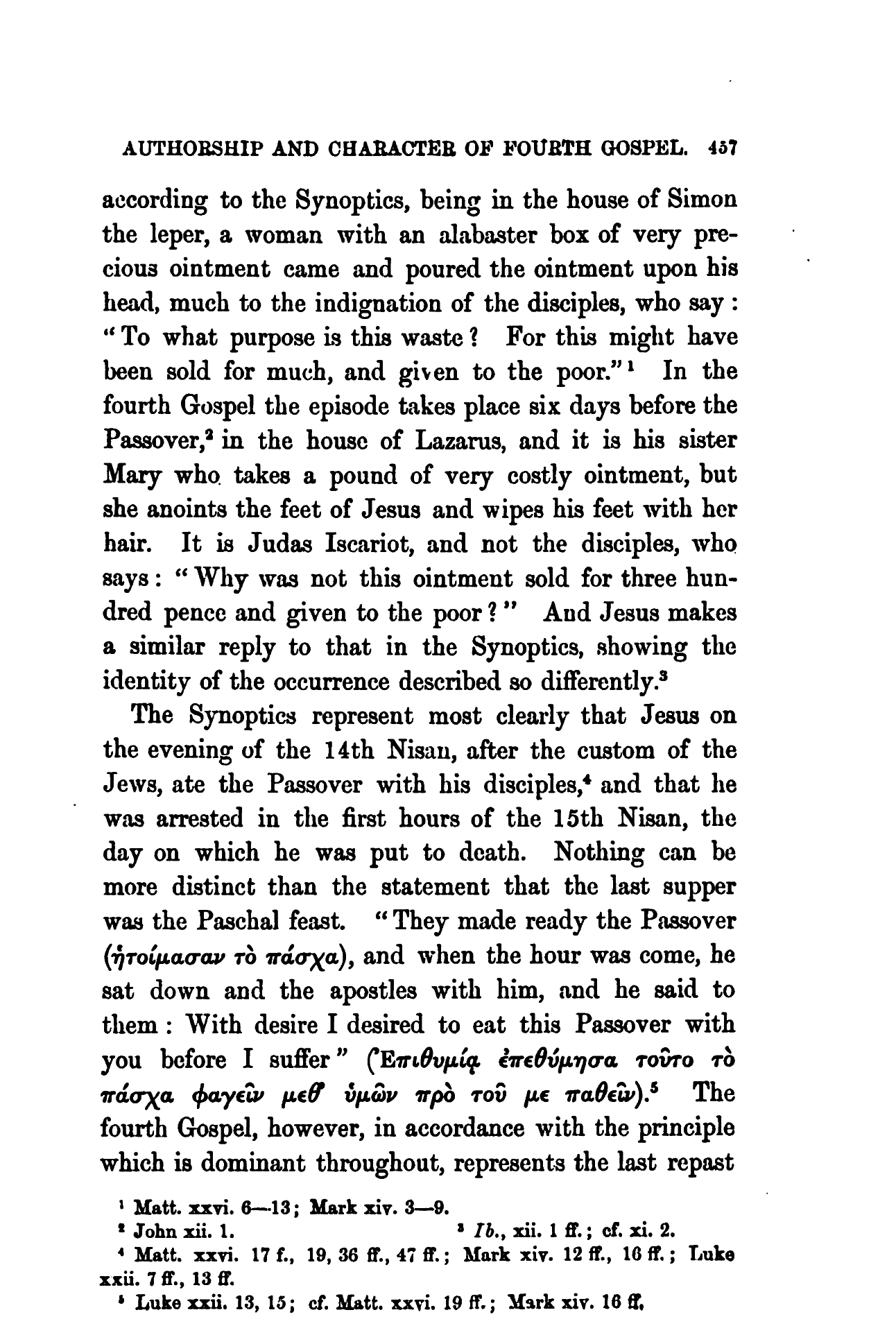 The Synoptics represent most clearly that Jesus on the evening of the 14th Nisan, after the custom of the Jews, ate the Passover with his disciples,(4) and that he was arrested in the first hours of the 15th Nisan, the day on which he was put to death. Nothing can be more distinct than the statement that the last supper was the Paschal feast. "They made ready the Passover [———], and when the hour was come, he sat down and the apostles with him, and he said to them: With desire I desired to eat this Passover with you before I suffer" [———].(5) The fourth Gospel, however, in accordance with the principle which is dominant throughout, represents the last repast