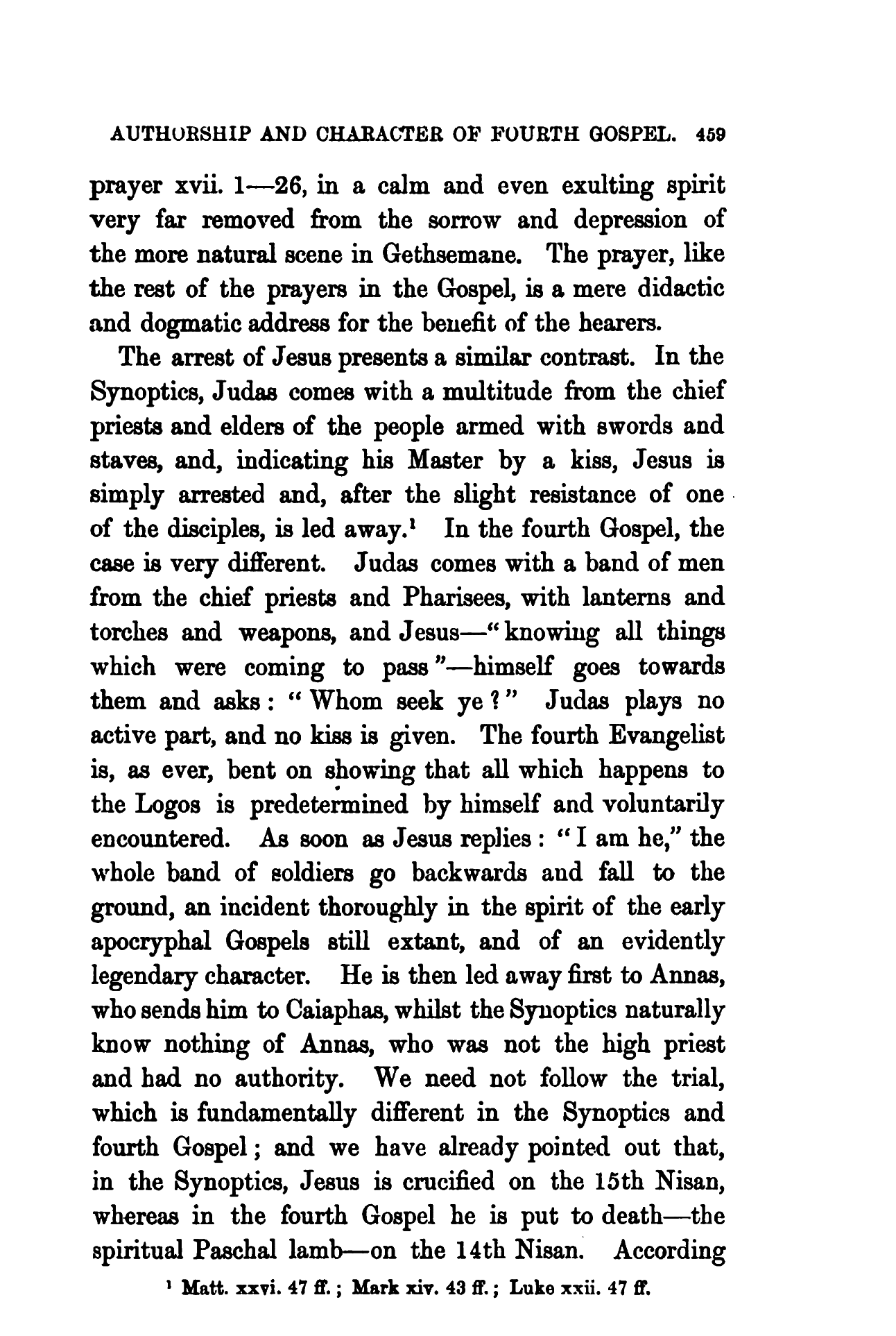 The arrest of Jesus presents a similar contrast. In the Synoptics, Judas comes with a multitude from the chief priests and elders of the people armed with swords and staves, and, indicating his Master by a kiss, Jesus is simply arrested and, after the slight resistance of one of the disciples, is led away.(1) In the fourth Gospel, the case is very different. Judas comes with a band of men from the chief priests and Pharisees, with lanterns and torches and weapons, and Jesus—"knowing all things which were coming to pass"—himself goes towards them and asks: "Whom seek ye?" Judas plays no active part, and no kiss is given. The fourth Evangelist is, as ever, bent on showing that all which happens to the Logos is predetermined by himself and voluntarily encountered. As soon as Jesus replies: "I am he," the whole band of soldiers go backwards and fall to the ground, an incident thoroughly in the spirit of the early apocryphal Gospels still extant, and of an evidently legendary character. He is then led away first to Annas, who sends him to Caiaphas, whilst the Synoptics naturally know nothing of Annas, who was not the high priest and had no authority. We need not follow the trial, which is fundamentally different in the Synoptics and fourth Gospel; and we have already pointed out that, in the Synoptics, Jesus is crucified on the 15th Nisan, whereas in the fourth Gospel he is put to death—the spiritual Paschal lamb—on the 14th Nisan. According