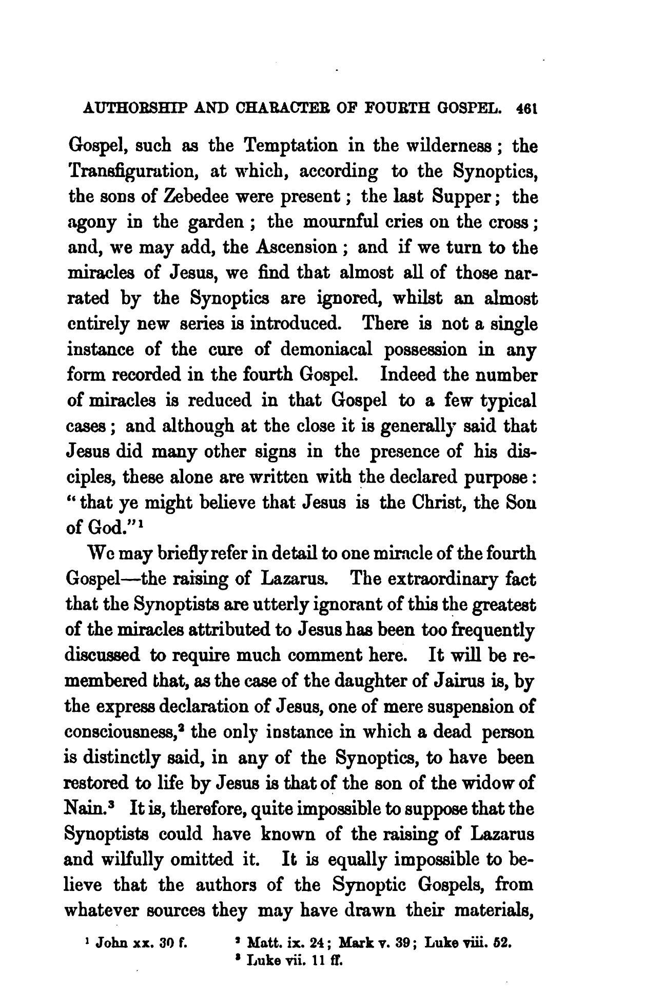 We may briefly refer in detail to one miracle of the fourth Gospel—the raising of Lazarus. The extraordinary fact that the Synoptists are utterly ignorant of this the greatest of the miracles attributed to Jesus has been too frequently discussed to require much comment here. It will be remembered that, as the case of the daughter of Jairus is, by the express declaration of Jesus, one of mere suspension of consciousness,(2) the only instance in which a dead person is distinctly said, in any of the Synoptics, to have been restored to life by Jesus is that of the son of the widow of Nain.(3) It is, therefore, quite impossible to suppose that the Synoptists could have known of the raising of Lazarus and wilfully omitted it. It is equally impossible to believe that the authors of the Synoptic Gospels, from whatever sources they may have drawn their materials,