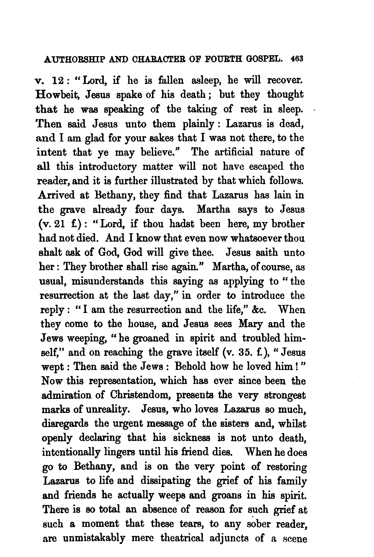 could have been ignorant of such a miracle had it really-taken place. This astounding miracle, according to the fourth Gospel, created such general excitement that it was one of the leading events which led to the arrest and crucifixion of Jesus.(1) If, therefore, the Synoptics had any connection with the writers to whom they are referred, the raising of Lazarus must have been personally known to their reputed authors either directly or through the Apostles who are supposed to have inspired them, or even if they have any claim to contemporary origin the tradition of the greatest miracle of Jesus must have been fresh throughout the Church, if such a wonder had ever been performed.(2) The total ignorance of such a miracle displayed by the whole of the works of the New Testament, therefore, forms the strongest presumptive evidence that the narrative in the fourth Gospel is a mere imaginary scene, illustrative of the dogma: "I am the resurrection and the life," upon which it is based. This conclusion is confirmed by the peculiarities of the narrative itself. When Jesus first hears, from the message of the sisters, that Lazarus whom he loved was sick, he declares, xi. 4: "This sickness is not unto death, but for the glory of God, that the Son of God may be glorified thereby;" and v. 6: "When, therefore [———], he heard that he was sick, at that time he continued two days in the place where he was." After that time he proposes to go into Judaea, and explains to the disciples, v. 11: "Our friend Lazarus is fallen asleep; but I go that I may awake him out of sleep." The disciples reply, with the stupidity with which the fourth Evangelist endows all those who hold colloquy with Jesus,