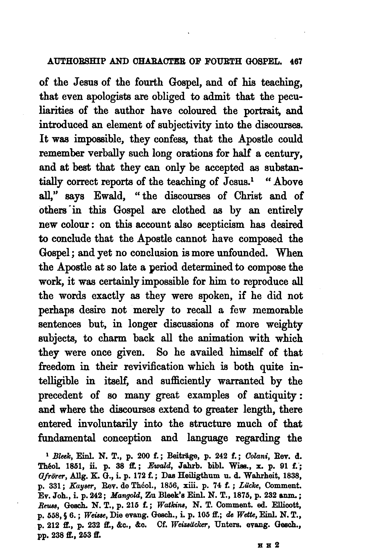 of the Jesus of the fourth Gospel, and of his teaching, that even apologists are obliged to admit that the peculiarities of the author have coloured the portrait, and introduced an element of subjectivity into the discourses. It was impossible, they confess, that the Apostle could remember verbally such long orations for half a century, and at best that they can only be accepted as substantially correct reports of the teaching of Jesus.(1) "Above all," says Ewald, "the discourses of Christ and of others in this Gospel are clothed as by an entirely new colour: on this account also scepticism has desired to conclude that the Apostle cannot have composed the Gospel; and yet no conclusion is more unfounded. When the Apostle at so late a period determined to compose the work, it was certainly impossible for him to reproduce all the words exactly as they were spoken, if he did not perhaps desire not merely to recall a few memorable sentences but, in longer discussions of more weighty subjects, to charm back all the animation with which they were once given. So he availed himself of that freedom in their revivification which is both quite intelligible in itself, and sufficiently warranted by the precedent of so many great examples of antiquity: and where the discourses extend to greater length, there entered involuntarily into the structure much of that fundamental conception and language regarding the