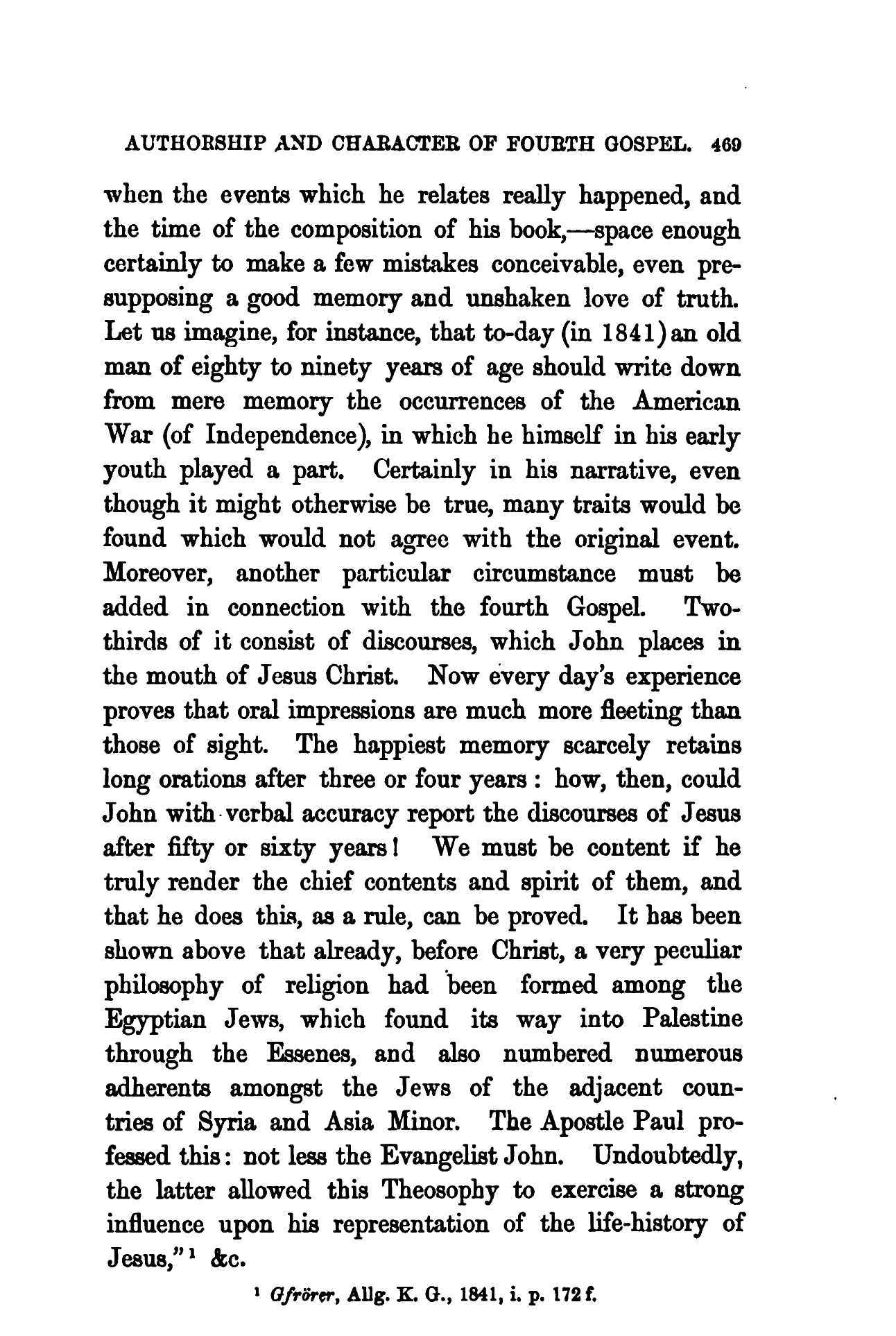 when the events which he relates really happened, and the time of the composition of his book,—space enough certainly to make a few mistakes conceivable, even presupposing a good memory and unshaken love of truth. Let us imagine, for instance, that to-day (in 1841) an old man of eighty to ninety years of age should write down from mere memory the occurrences of the American War (of Independence), in which he himself in his early youth played a part. Certainly in his narrative, even though it might otherwise be true, many traits would be found which would not agree with the original event. Moreover, another particular circumstance must be added in connection with the fourth Gospel. Two-thirds of it consist of discourses, which John places in the mouth of Jesus Christ. Now every day's experience proves that oral impressions are much more fleeting than those of sight. The happiest memory scarcely retains long orations after three or four years: how, then, could John with verbal accuracy report the discourses of Jesus after fifty or sixty years! We must be content if he truly render the chief contents and spirit of them, and that he does this, as a rule, can be proved. It has been shown above that already, before Christ, a very peculiar philosophy of religion had been formed among the Egyptian Jews, which found its way into Palestine through the Essenes, and also numbered numerous adherents amongst the Jews of the adjacent countries of Syria and Asia Minor. The Apostle Paul professed this: not less the Evangelist John. Undoubtedly, the latter allowed this Theosophy to exercise a strong influence upon his representation of the life-history of Jesus,"(1) &c.