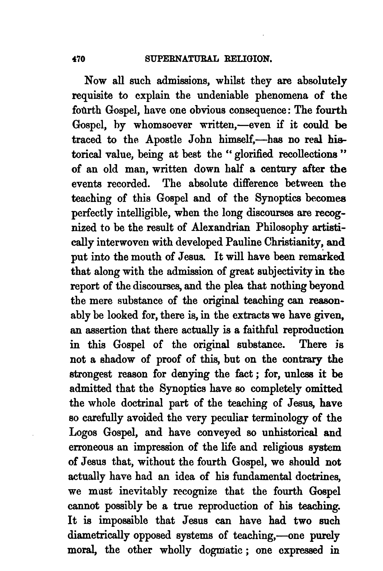Now all such admissions, whilst they are absolutely requisite to explain the undeniable phenomena of the fourth Gospel, have one obvious consequence: The fourth Gospel, by whomsoever written,—even if it could be traced to the Apostle John himself,—has no real historical value, being at best the "glorified recollections" of an old man, written down half a century after the events recorded. The absolute difference between the teaching of this Gospel and of the Synoptics becomes perfectly intelligible, when the long discourses are recognized to be the result of Alexandrian Philosophy artistically interwoven with developed Pauline Christianity, and put into the mouth of Jesus. It will have been remarked that along with the admission of great subjectivity in the report of the discourses, and the plea that nothing beyond the mere substance of the original teaching can reasonably be looked for, there is, in the extracts we have given, an assertion that there actually is a faithful reproduction in this Gospel of the original substance. There is not a shadow of proof of this, but on the contrary the strongest reason for denying the fact; for, unless it be admitted that the Synoptics have so completely omitted the whole doctrinal part of the teaching of Jesus, have so carefully avoided the very peculiar terminology of the Logos Gospel, and have conveyed so unhistorical and erroneous an impression of the life and religious system of Jesus that, without the fourth Gospel, we should not actually have had an idea of his fundamental doctrines, we must inevitably recognize that the fourth Gospel cannot possibly be a true reproduction of his teaching. It is impossible that Jesus can have had two such diametrically opposed systems of teaching,—one purely moral, the other wholly dogmatic; one expressed in
