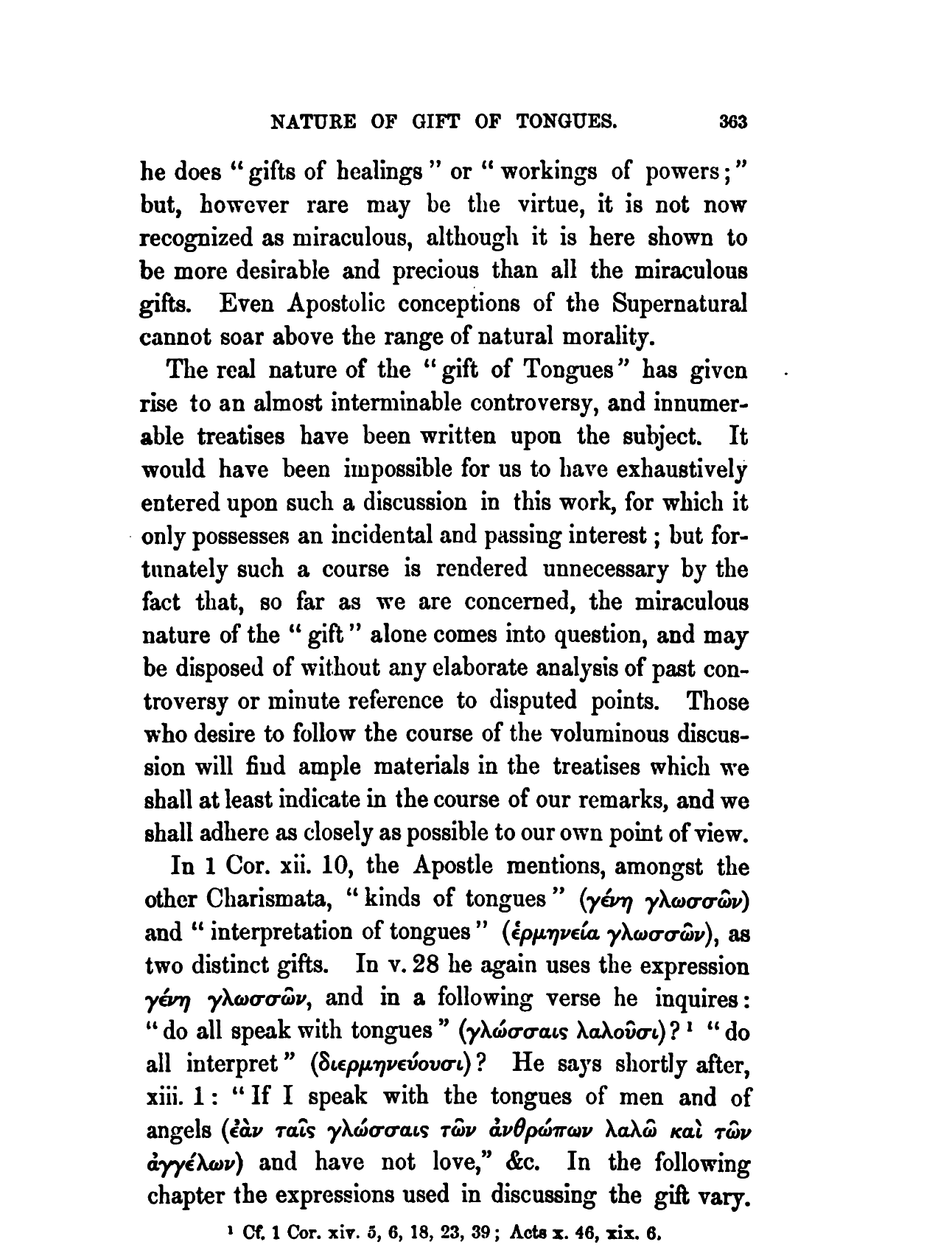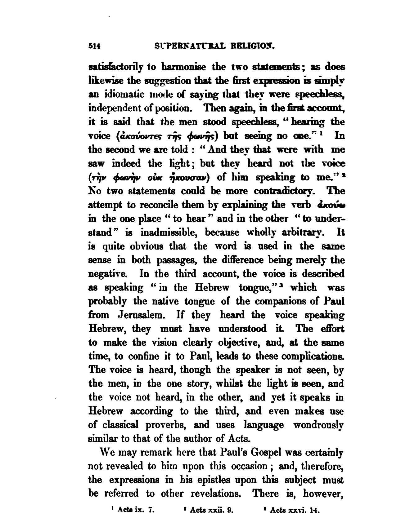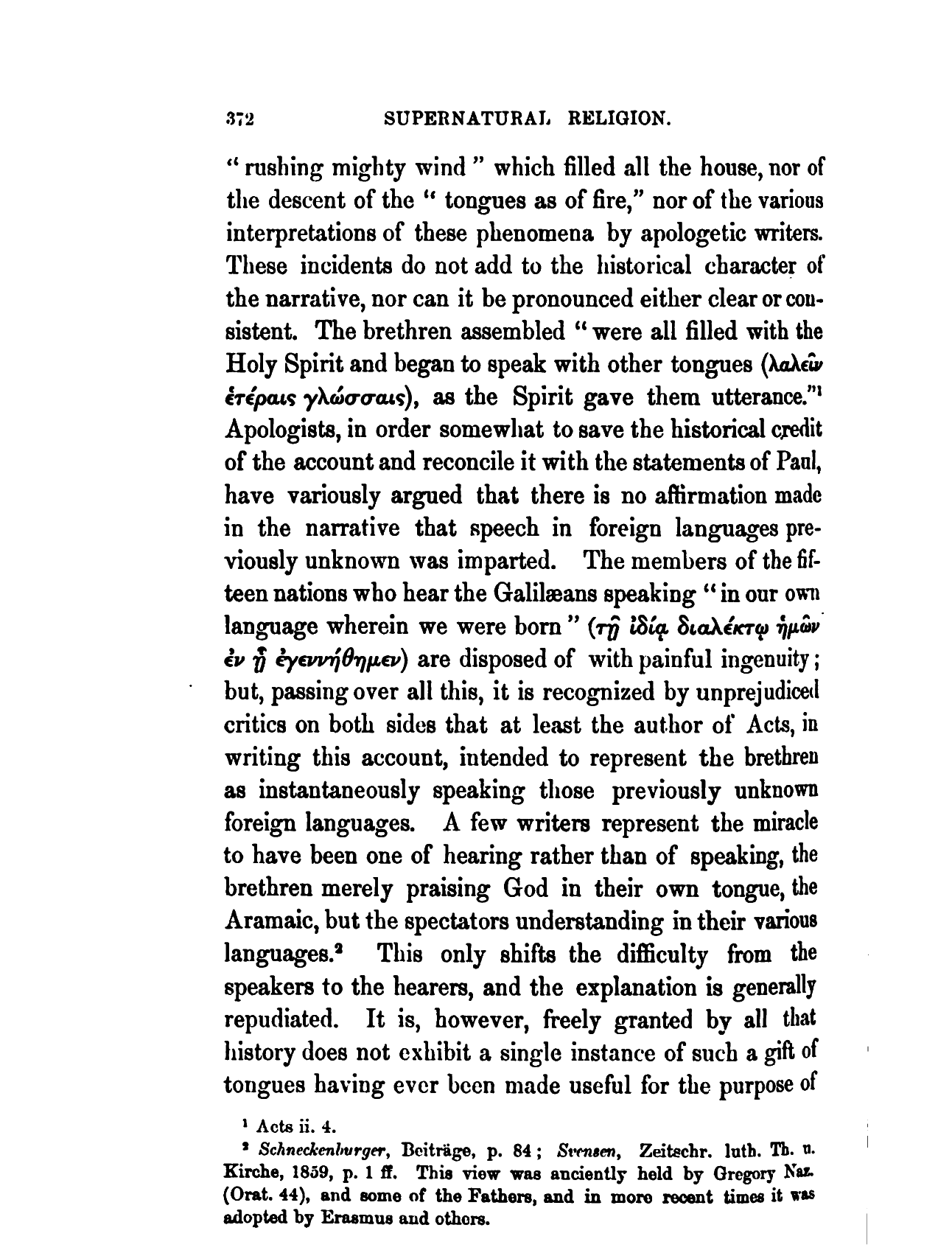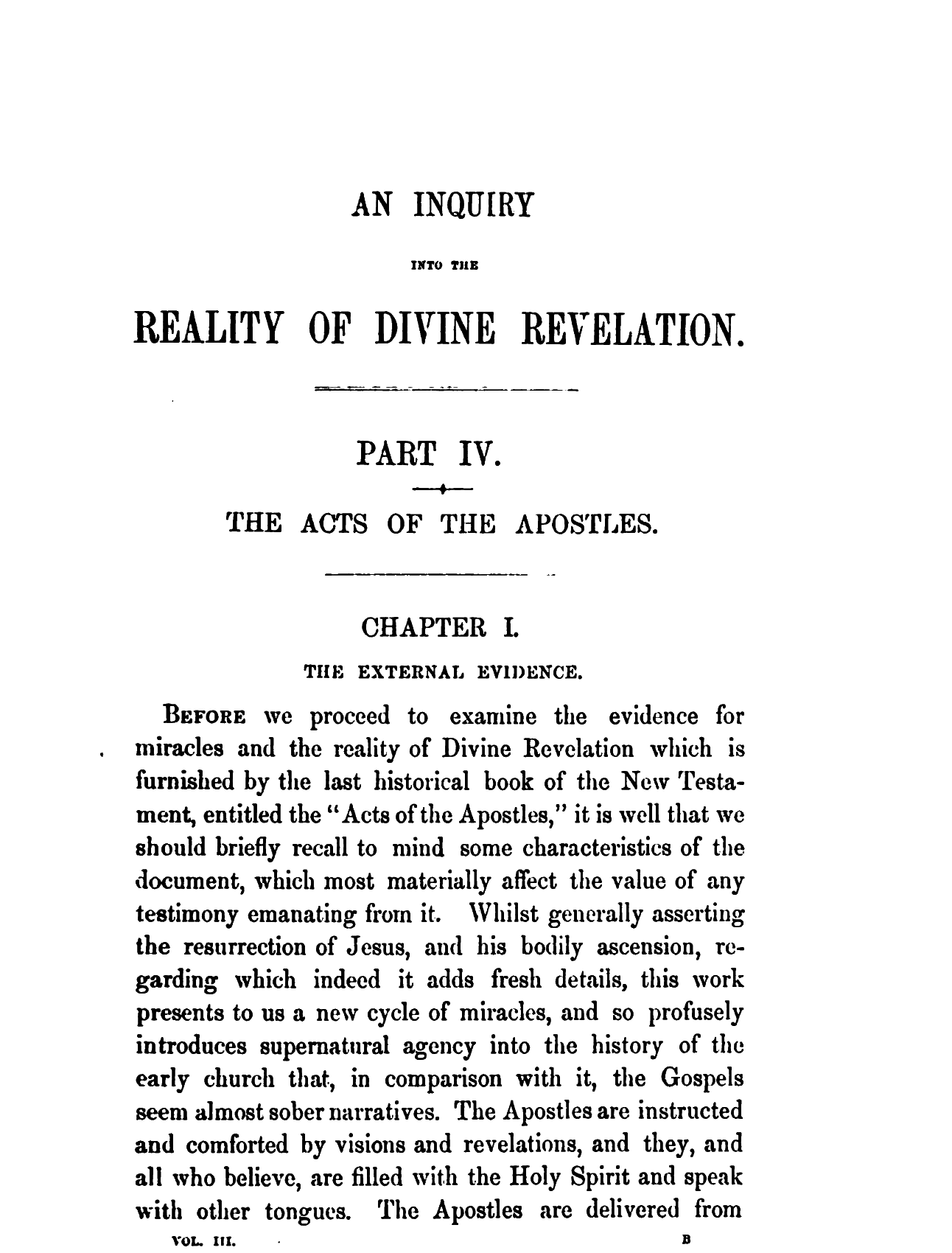 Before we proceed to examine the evidence for miracles and the reality of Divine Revelation which is furnished by the last historical book of the New Testament, entitled the "Acts of the Apostles," it is well that we should briefly recall to mind some characteristics of the document, which most materially affect the value of any testimony emanating from it. Whilst generally asserting the resurrection of Jesus, and his bodily ascension, regarding which indeed it adds fresh details, this work presents to us a new cycle of miracles, and so profusely introduces supernatural agency into the history of the early church that, in comparison with it, the Gospels seem almost sober narratives. The Apostles are instructed and comforted by visions and revelations, and they, and all who believe, are filled with the Holy Spirit and speak with other tongues. The Apostles are delivered from