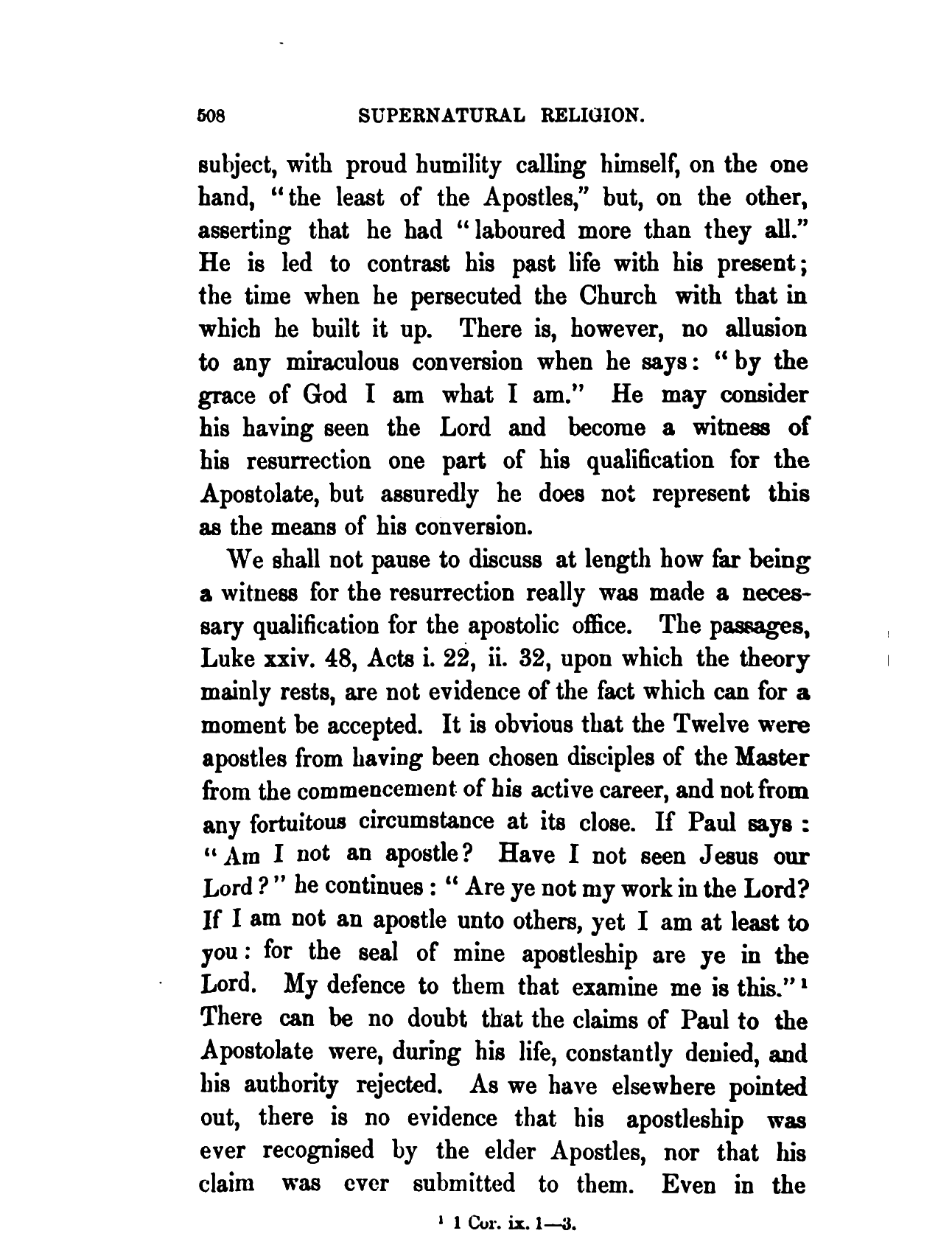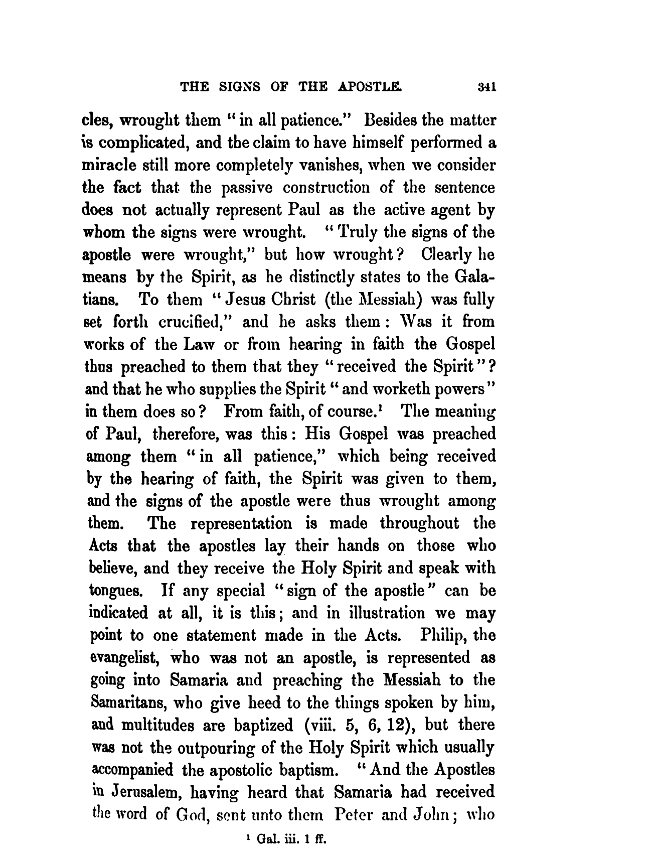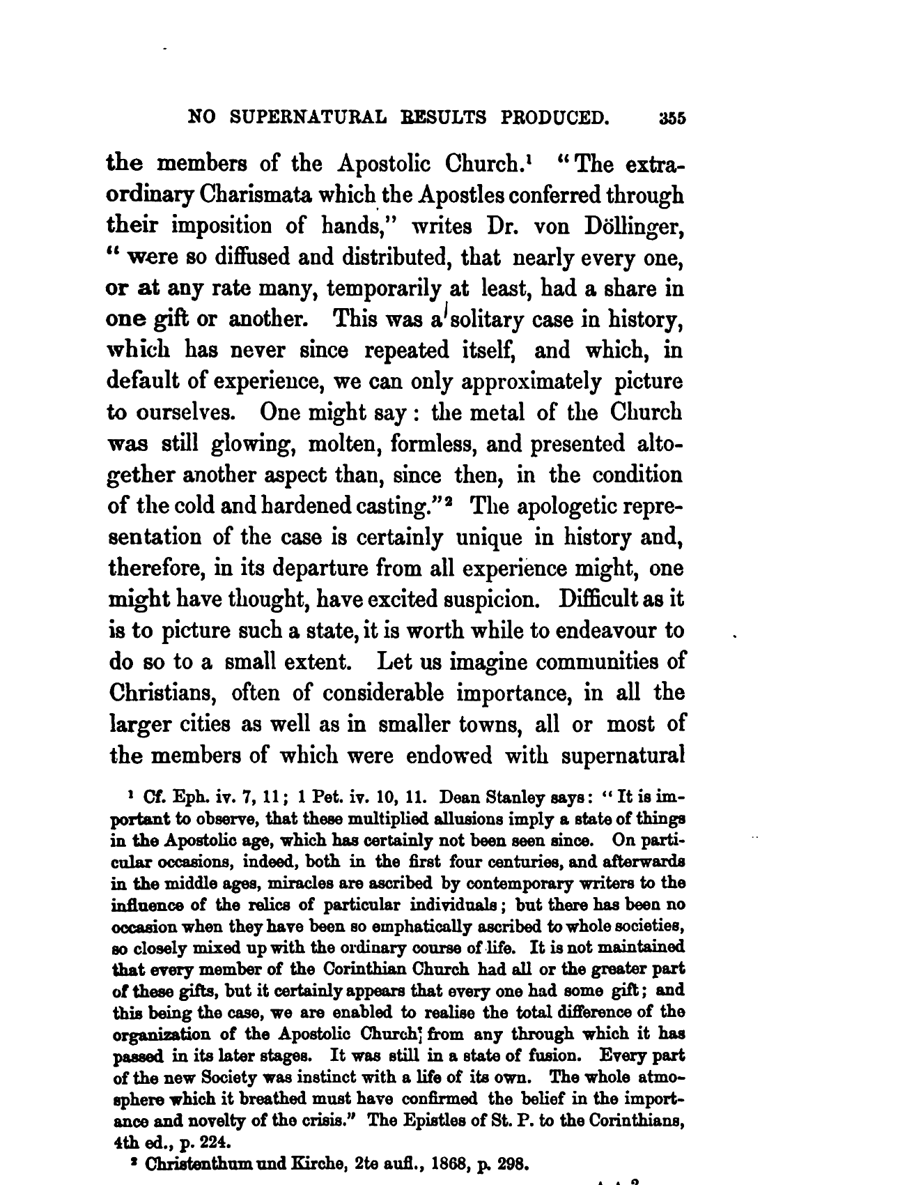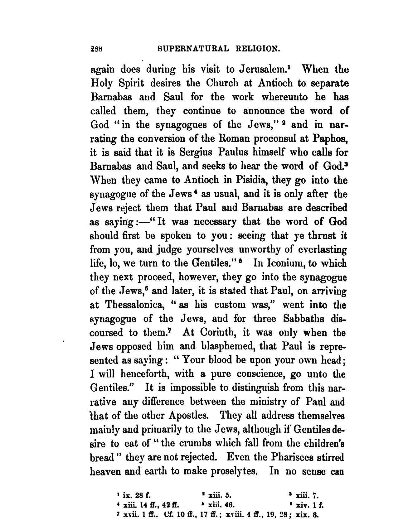 Before we proceed to examine the evidence for miracles and the reality of Divine Revelation which is furnished by the last historical book of the New Testament, entitled the "Acts of the Apostles," it is well that we should briefly recall to mind some characteristics of the document, which most materially affect the value of any testimony emanating from it. Whilst generally asserting the resurrection of Jesus, and his bodily ascension, regarding which indeed it adds fresh details, this work presents to us a new cycle of miracles, and so profusely introduces supernatural agency into the history of the early church that, in comparison with it, the Gospels seem almost sober narratives. The Apostles are instructed and comforted by visions and revelations, and they, and all who believe, are filled with the Holy Spirit and speak with other tongues. The Apostles are delivered from