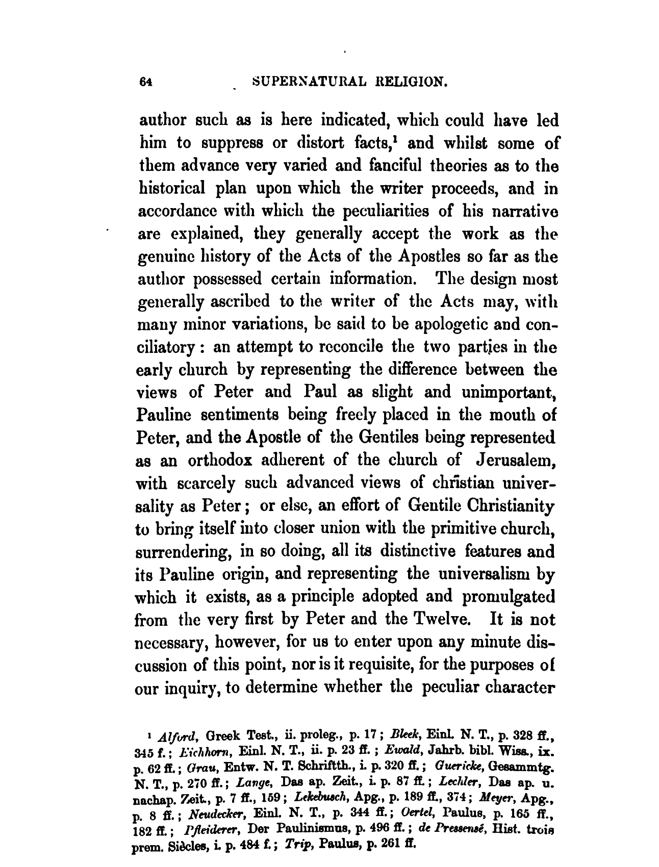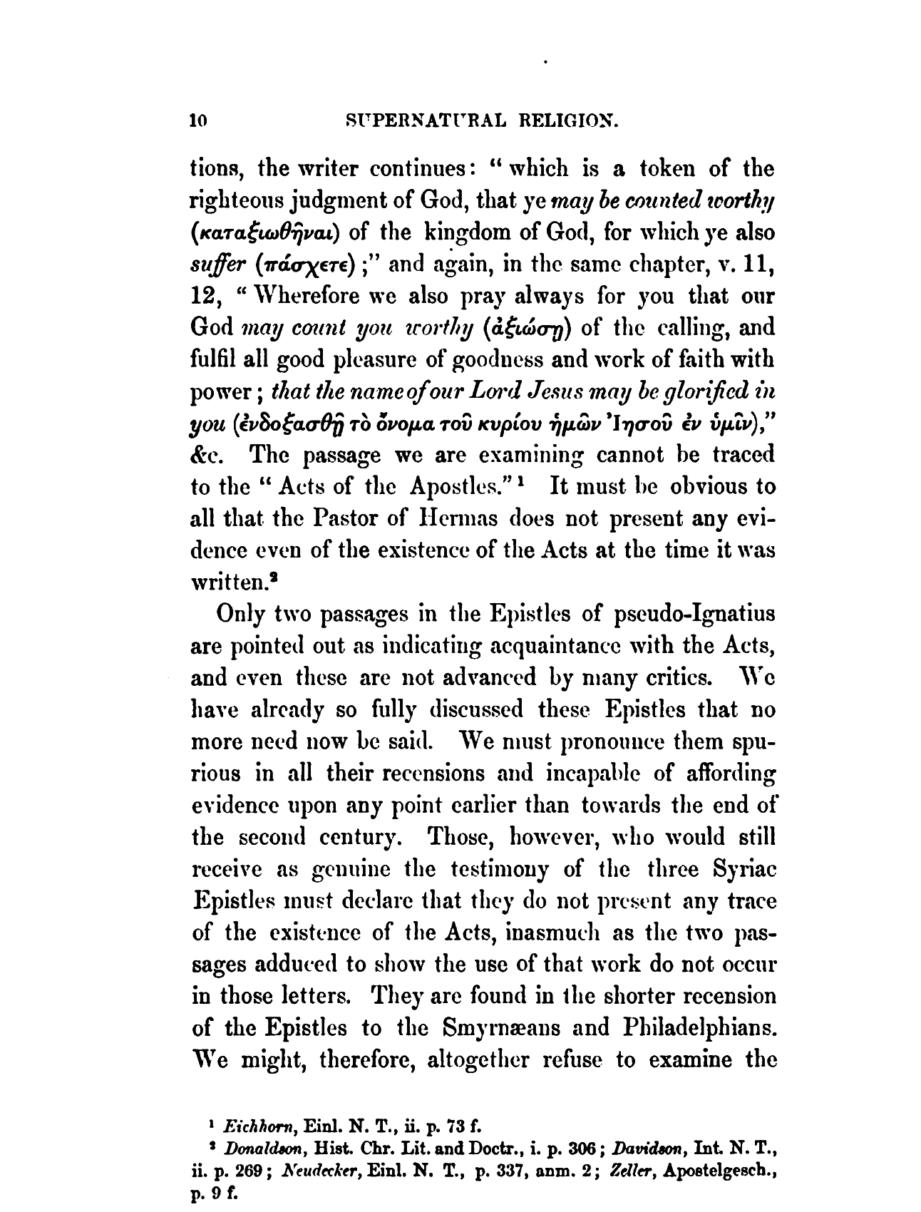 It is generally admitted, and indeed it is undeniable, that no distinct and unequivocal reference to the Acts of the Apostles, and to Luke as their author, occurs in the writings of Fathers before one by Irenæus(1) about the end of the second century. Passages are, however, pointed out in earlier writings as indicating the use and consequent existence of our document, all of which we shall now examine.