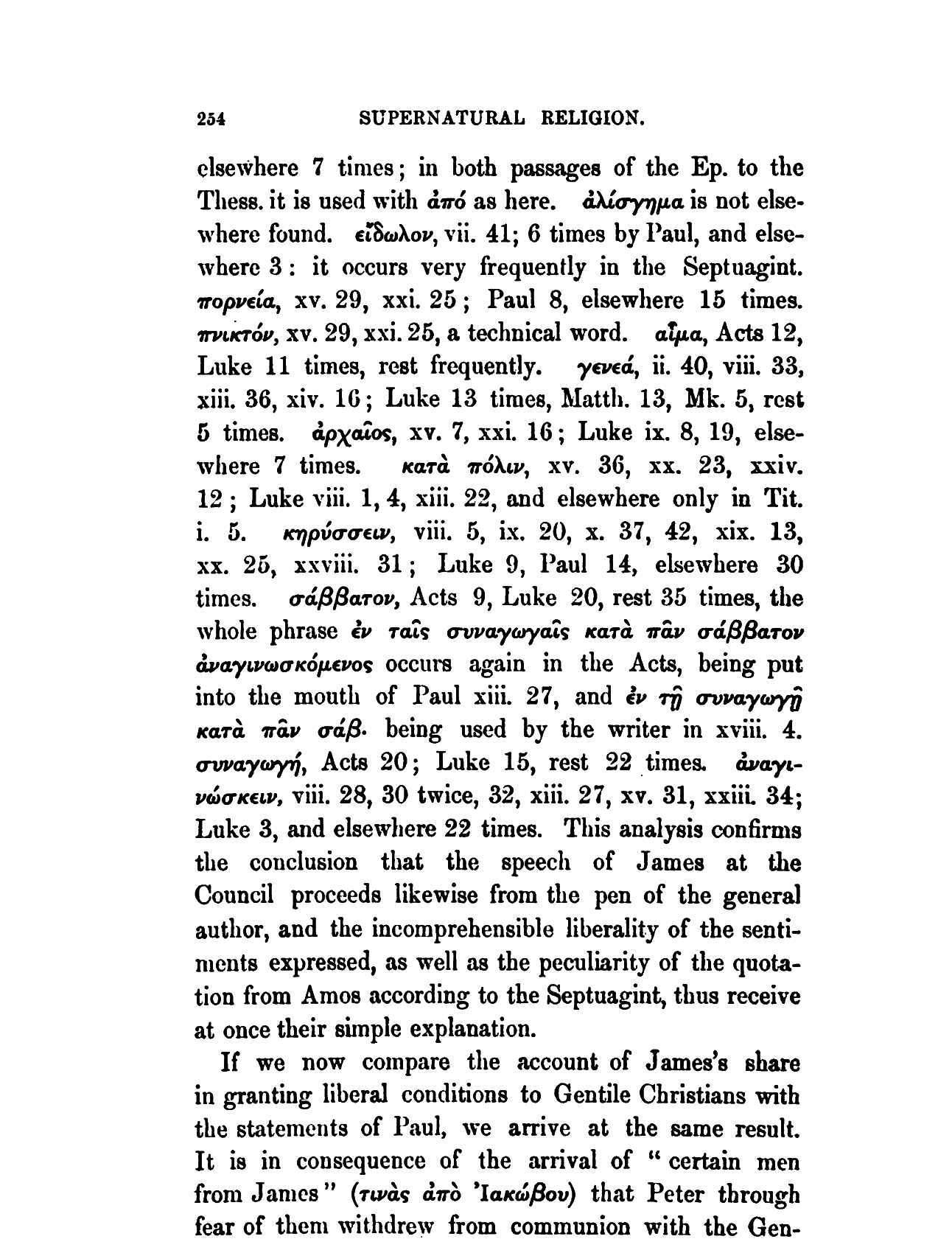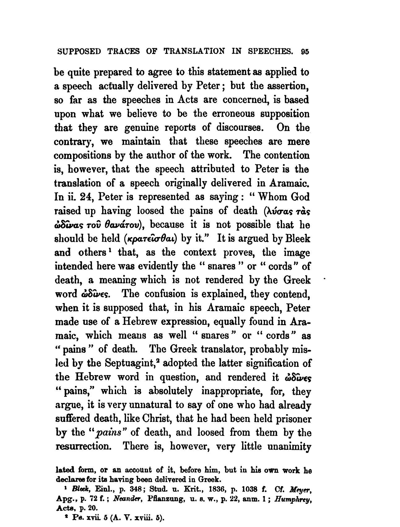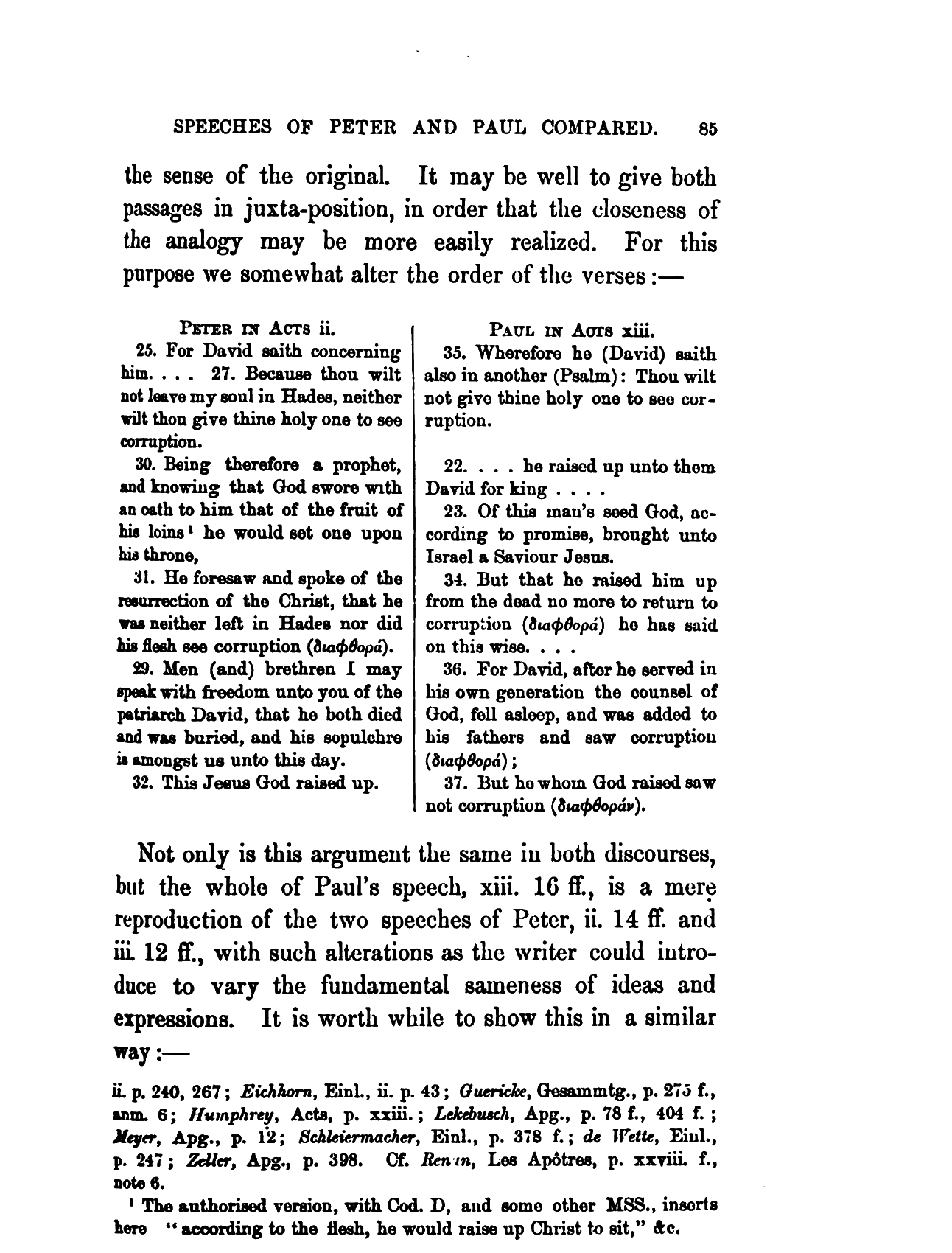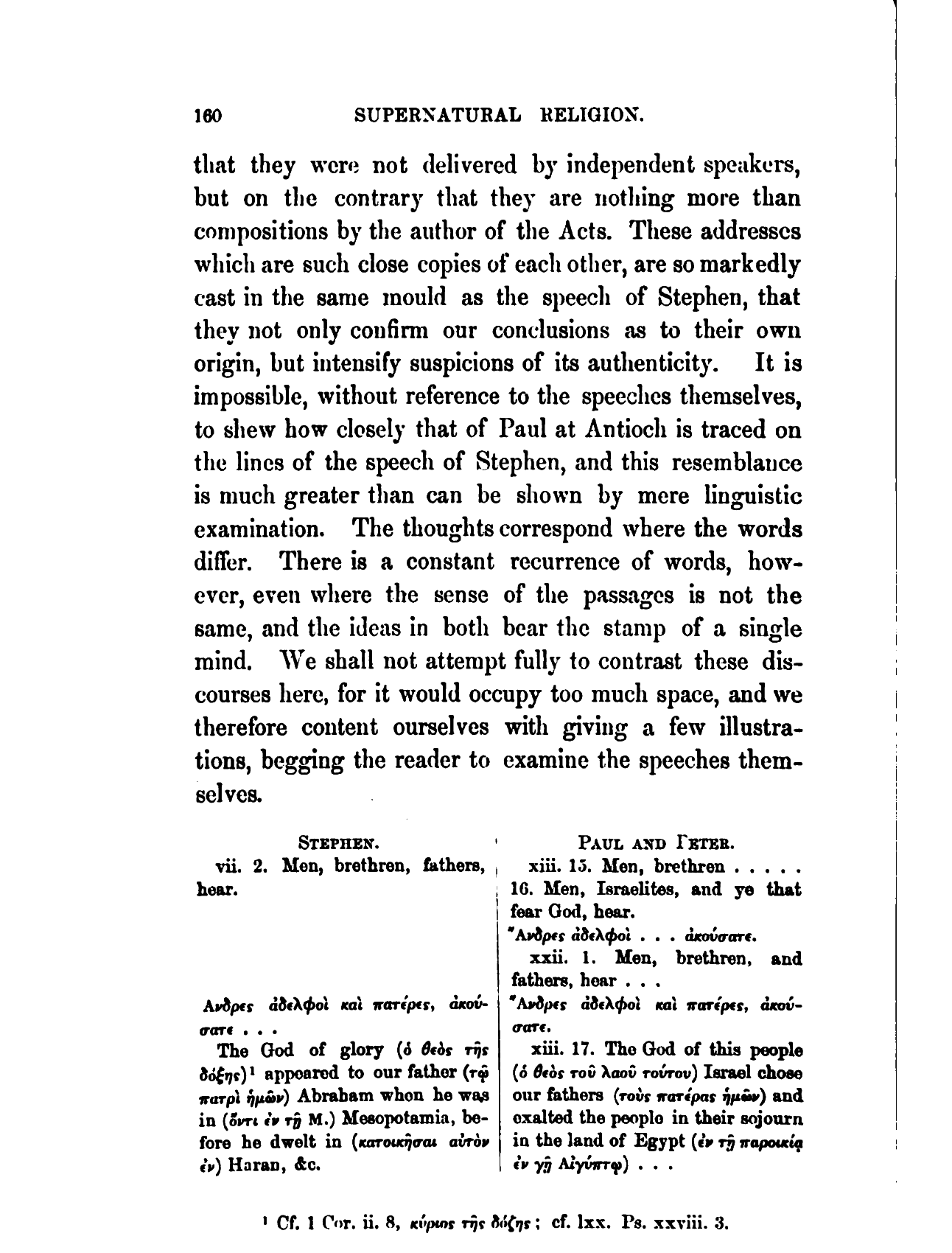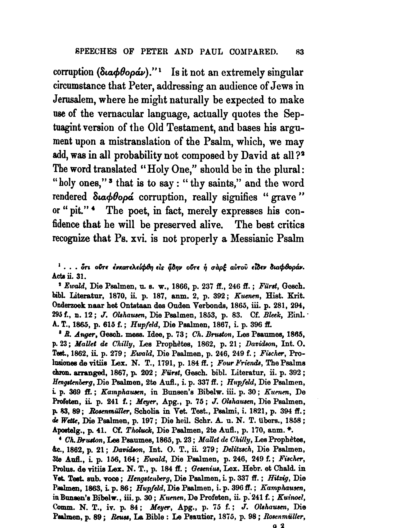 "For thou wilt not leave my soul in hell" [———].(1) In Ps. xviii. 5 (Sept. xvii. 5) we have, "The pains of hell [———] compassed me about."(2) The difference between the [———] of the Epistle and the [———] of the Acts is so distinct that, finding a closer parallel in the Psalms to which reference is obviously made in both works, it is quite impossible to trace the phrase necessarily to the Acts. Such a passage cannot prove the use of that work,(3) but, if it could, we might inquire what evidence for the authorship and trustworthiness of the Acts could be deduced from the circumstance?(4)