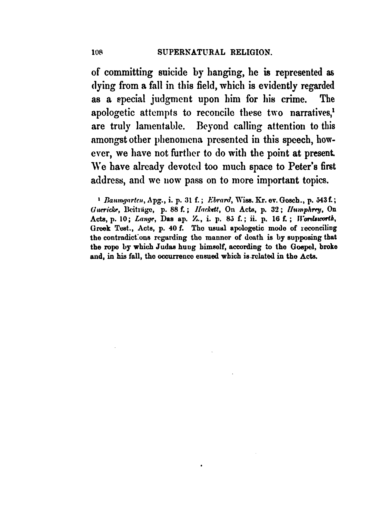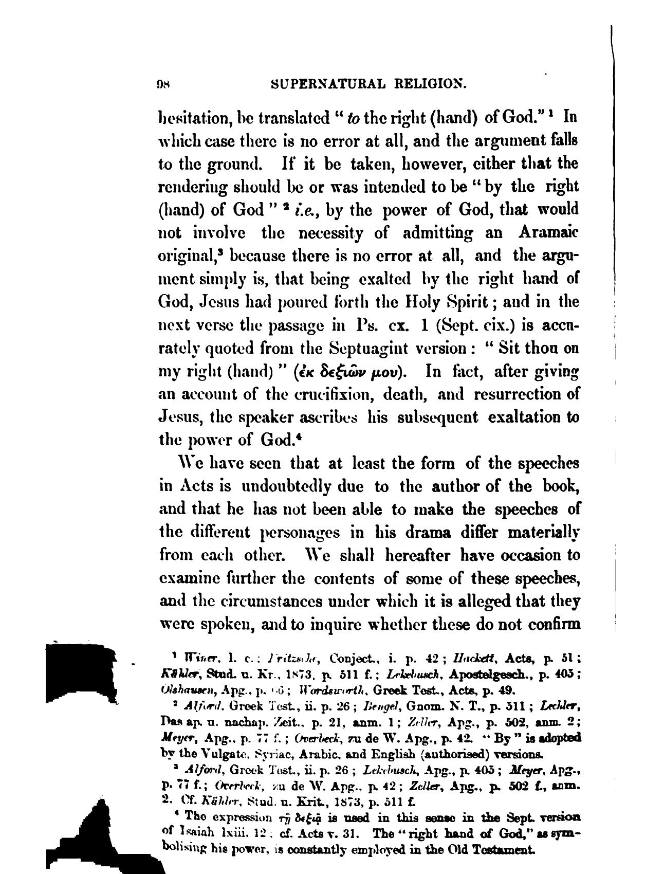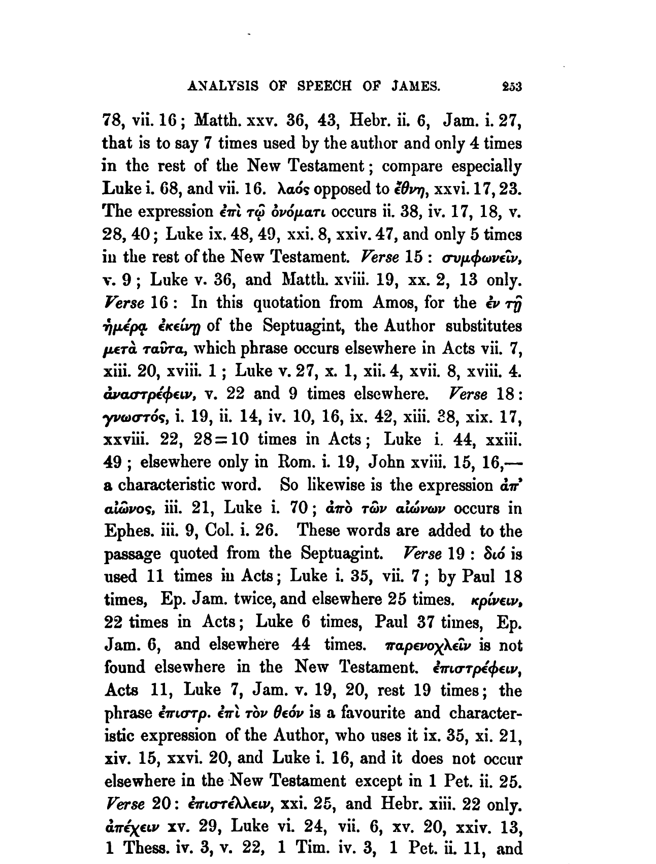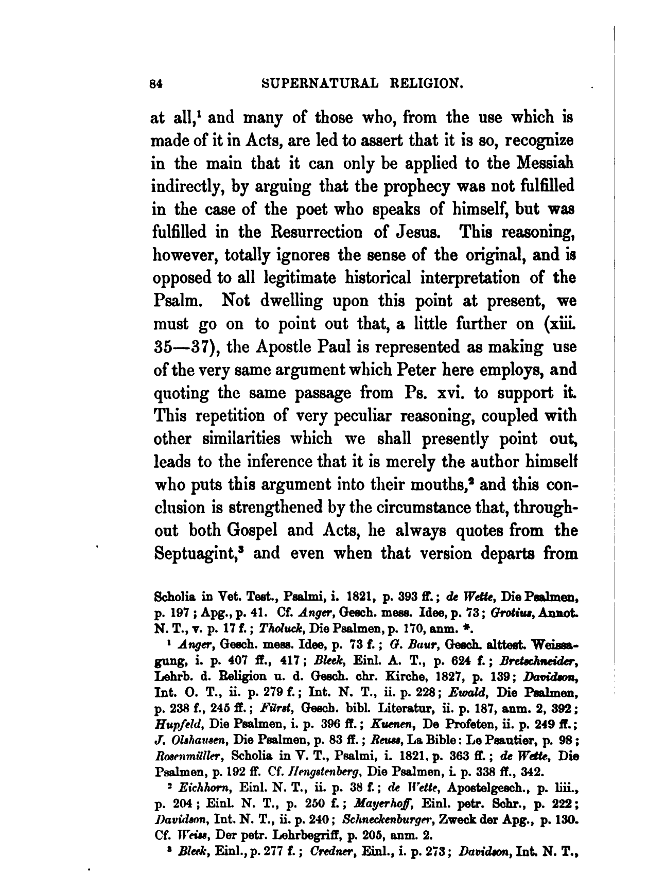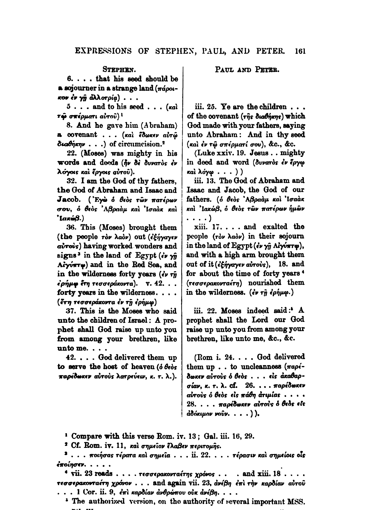 "For thou wilt not leave my soul in hell" [———].(1) In Ps. xviii. 5 (Sept. xvii. 5) we have, "The pains of hell [———] compassed me about."(2) The difference between the [———] of the Epistle and the [———] of the Acts is so distinct that, finding a closer parallel in the Psalms to which reference is obviously made in both works, it is quite impossible to trace the phrase necessarily to the Acts. Such a passage cannot prove the use of that work,(3) but, if it could, we might inquire what evidence for the authorship and trustworthiness of the Acts could be deduced from the circumstance?(4)