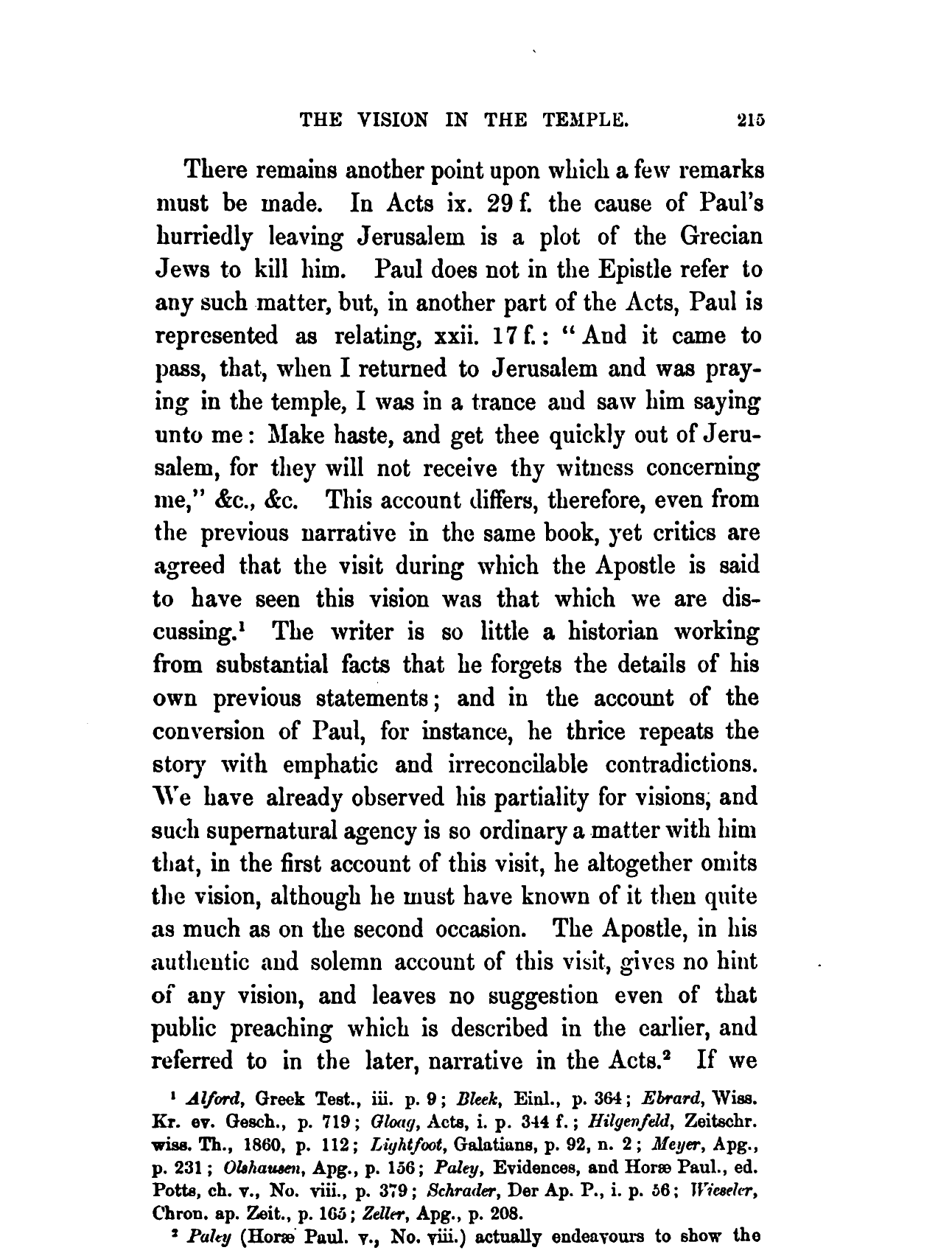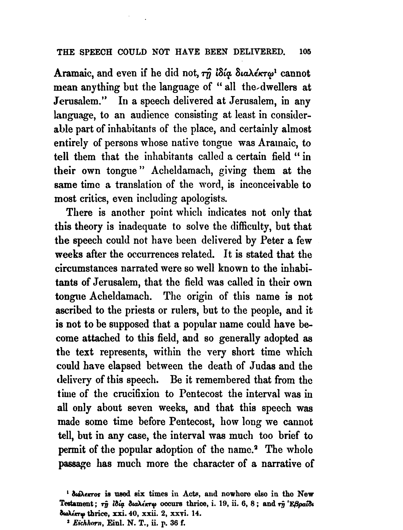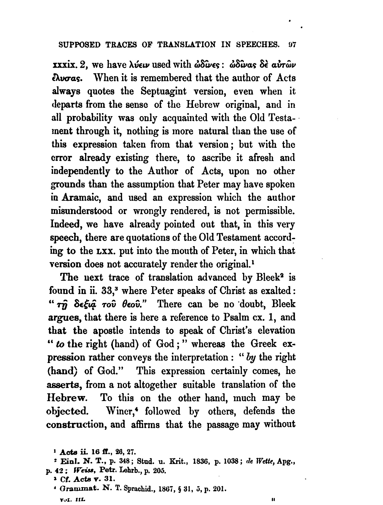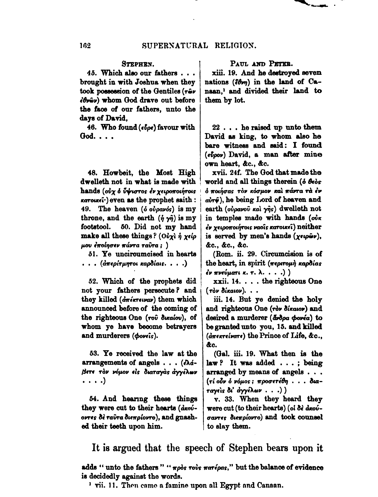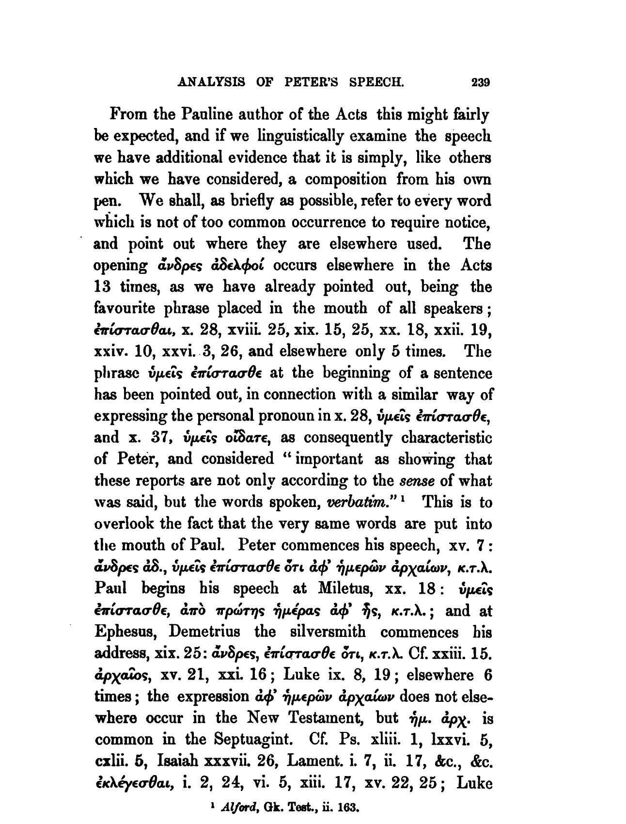 "For thou wilt not leave my soul in hell" [———].(1) In Ps. xviii. 5 (Sept. xvii. 5) we have, "The pains of hell [———] compassed me about."(2) The difference between the [———] of the Epistle and the [———] of the Acts is so distinct that, finding a closer parallel in the Psalms to which reference is obviously made in both works, it is quite impossible to trace the phrase necessarily to the Acts. Such a passage cannot prove the use of that work,(3) but, if it could, we might inquire what evidence for the authorship and trustworthiness of the Acts could be deduced from the circumstance?(4)