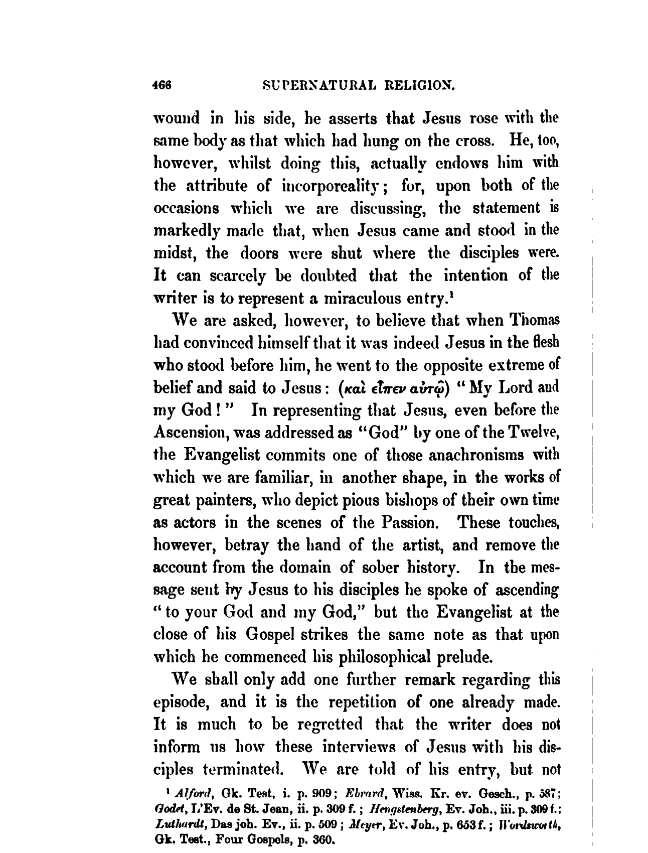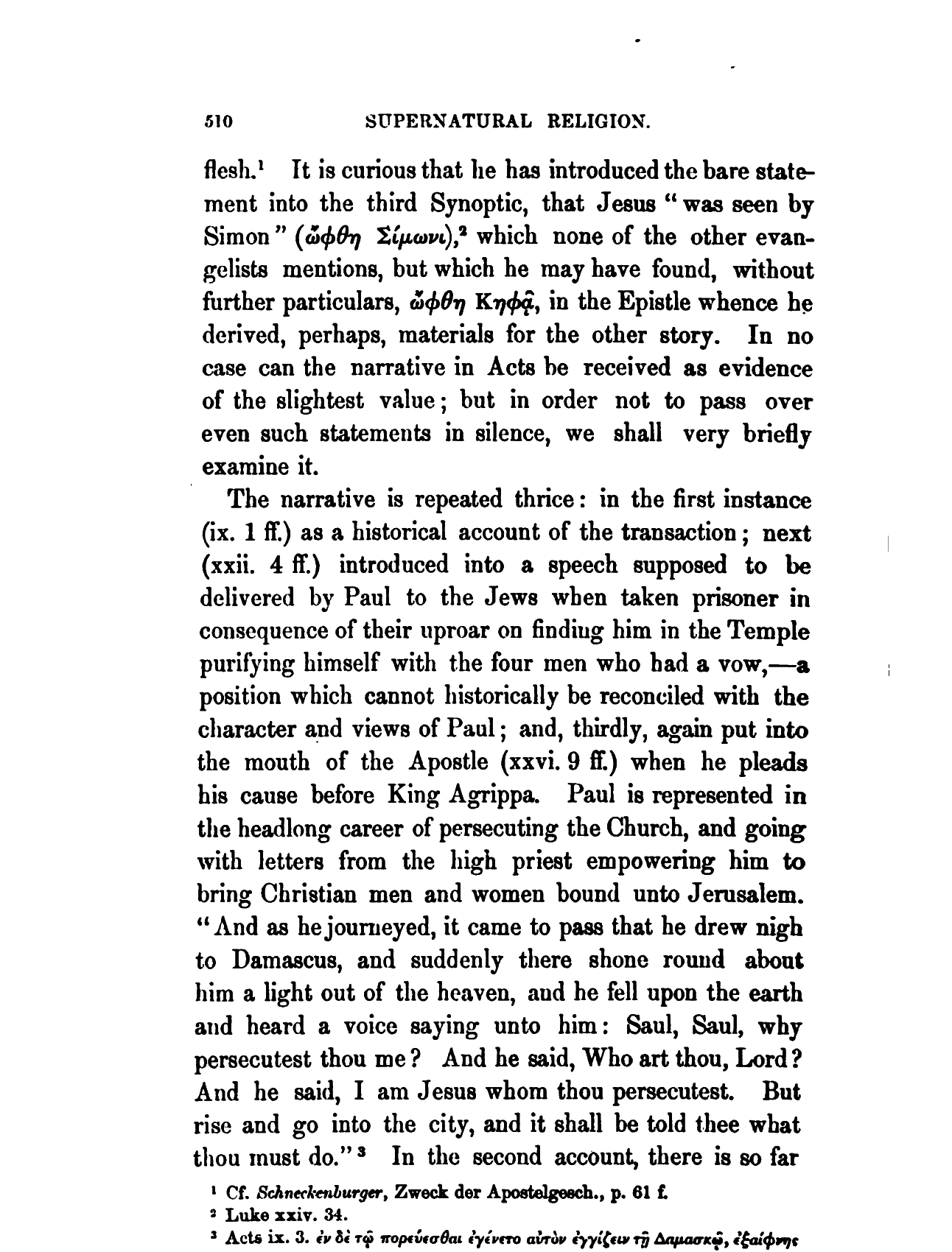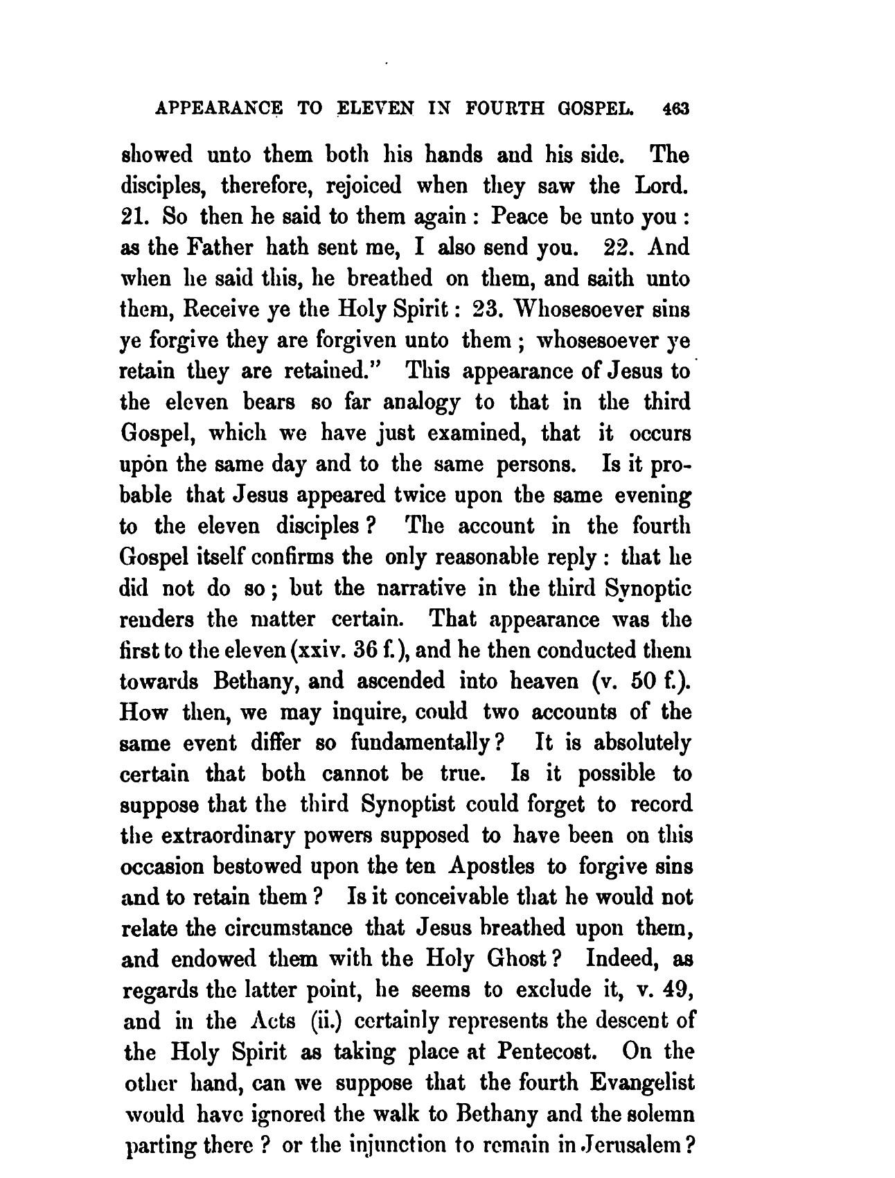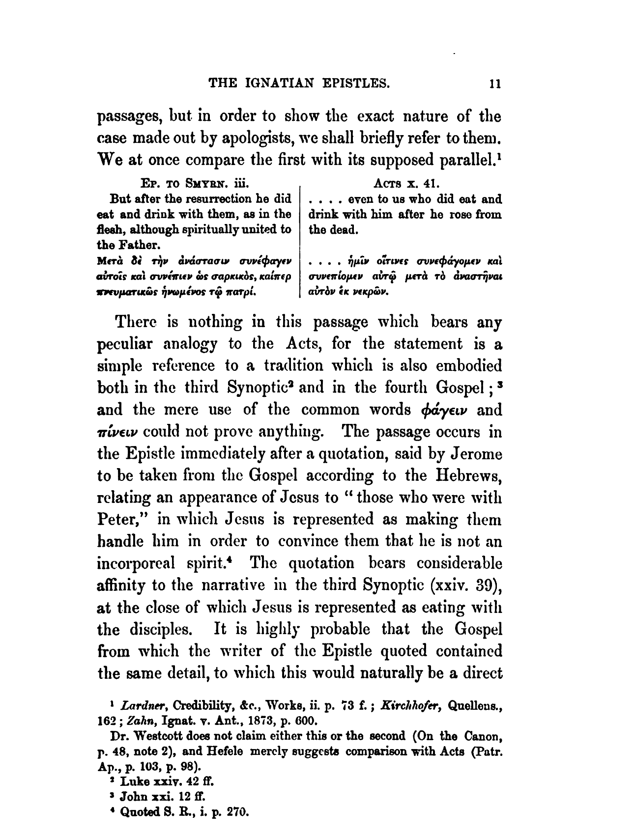 There is nothing in this passage which bears any peculiar analogy to the Acts, for the statement is a simple reference to a tradition which is also embodied both in the third Synoptic(2) and in the fourth Gospel;(3) and the mere use of the common words [———] and [———] could not prove anything. The passage occurs in the Epistle immediately after a quotation, said by Jerome to be taken from the Gospel according to the Hebrews, relating an appearance of Jesus to "those who were with Peter," in which Jesus is represented as making them handle him in order to convince them that he is not an incorporeal spirit.(4) The quotation bears considerable affinity to the narrative in the third Synoptic (xxiv. 39), at the close of which Jesus is represented as eating with the disciples. It is highly probable that the Gospel from which the writer of the Epistle quoted contained the same detail, to which this would naturally be a direct