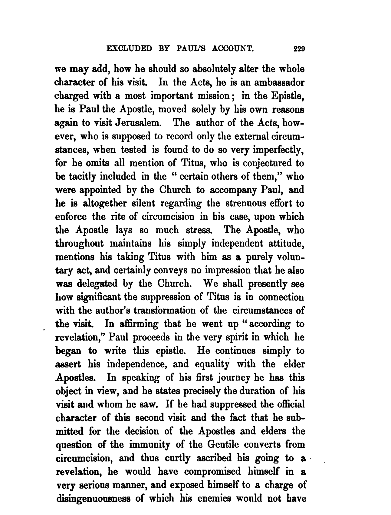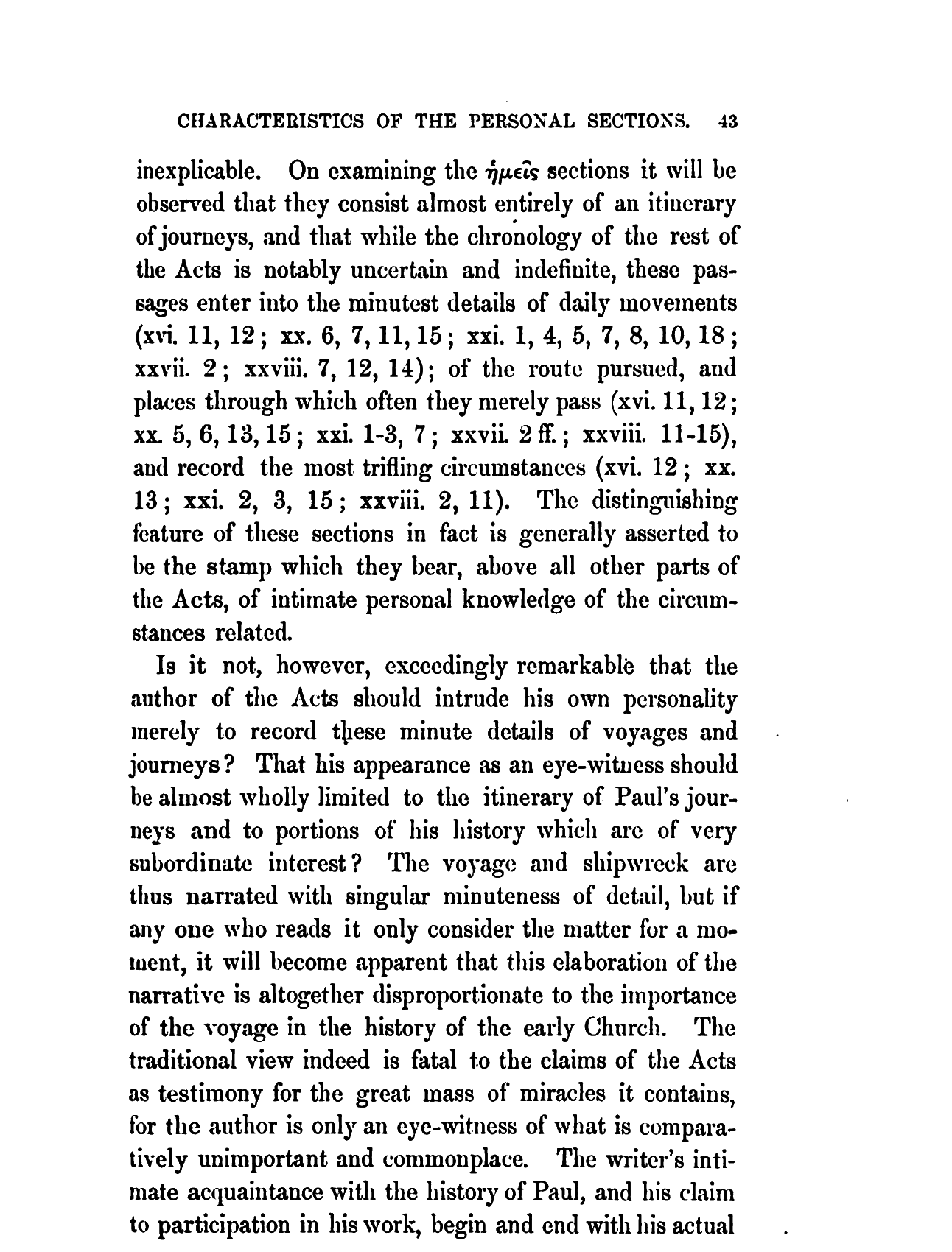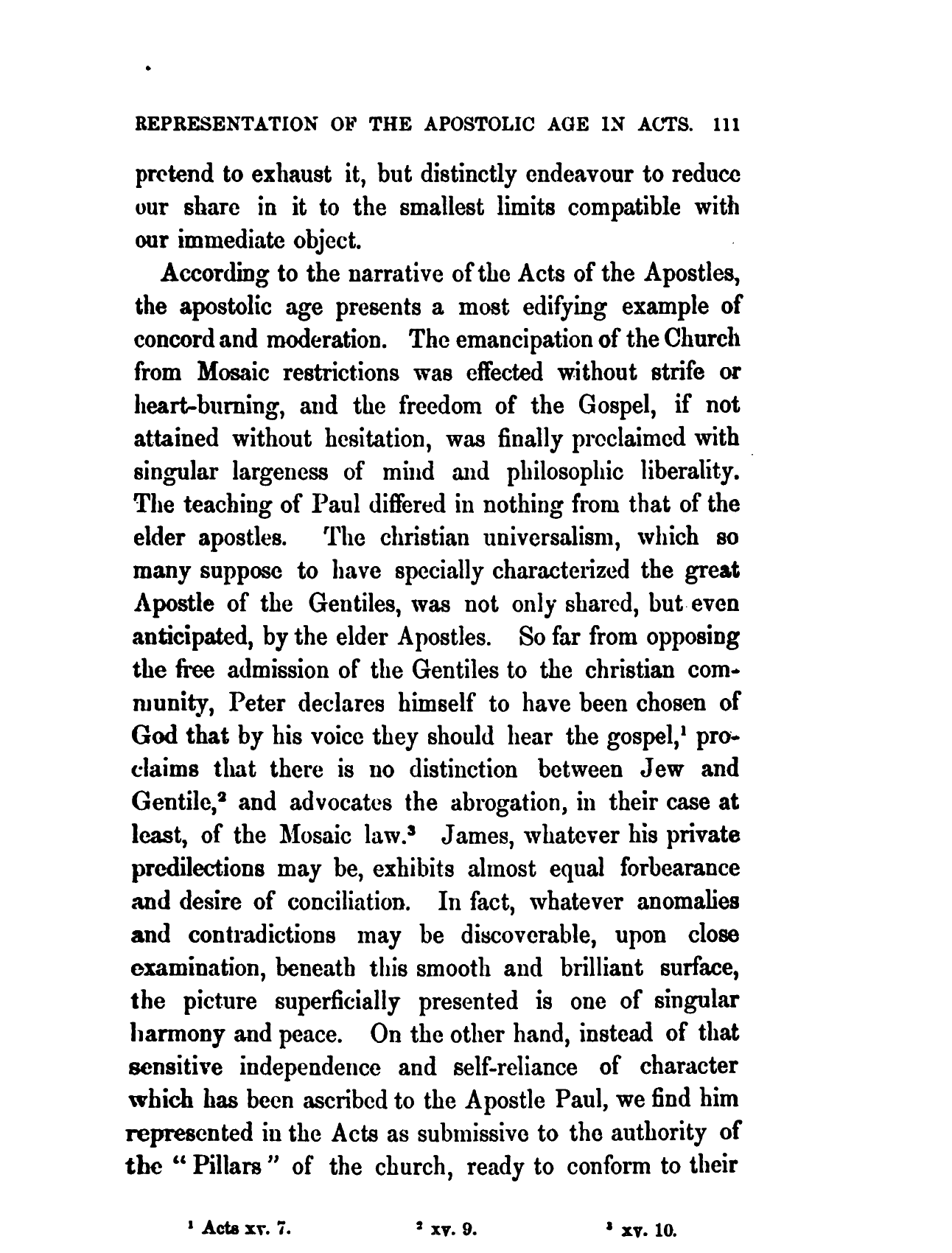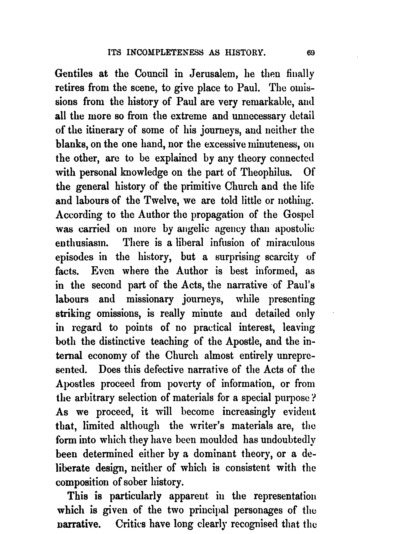 It must, however, be borne in mind that it is quite foreign to our purpose to enter into any exhaustive discussion of the literary problem presented by the Acts of the Apostles. We shall confine ourselves to such points as seem sufficient or best fitted to test the character of the composition, and we shall not hesitate to pass without attention questions of mere literary interest, and strictly limit our examination to such prominent features as present themselves for our purpose.
