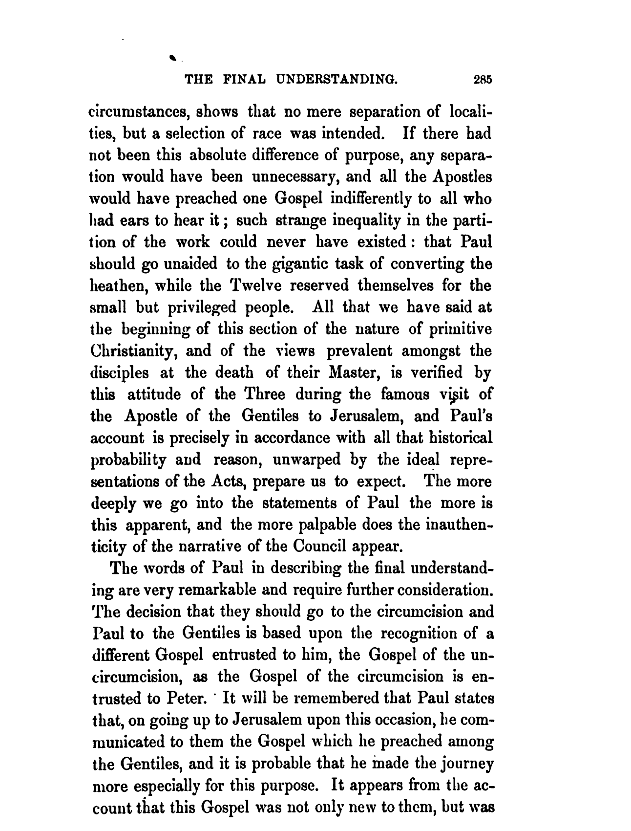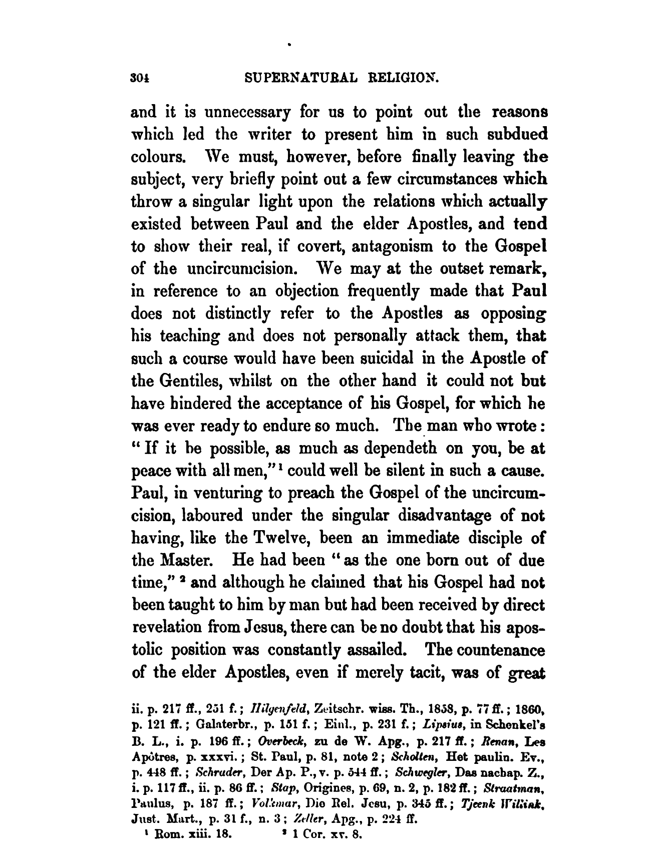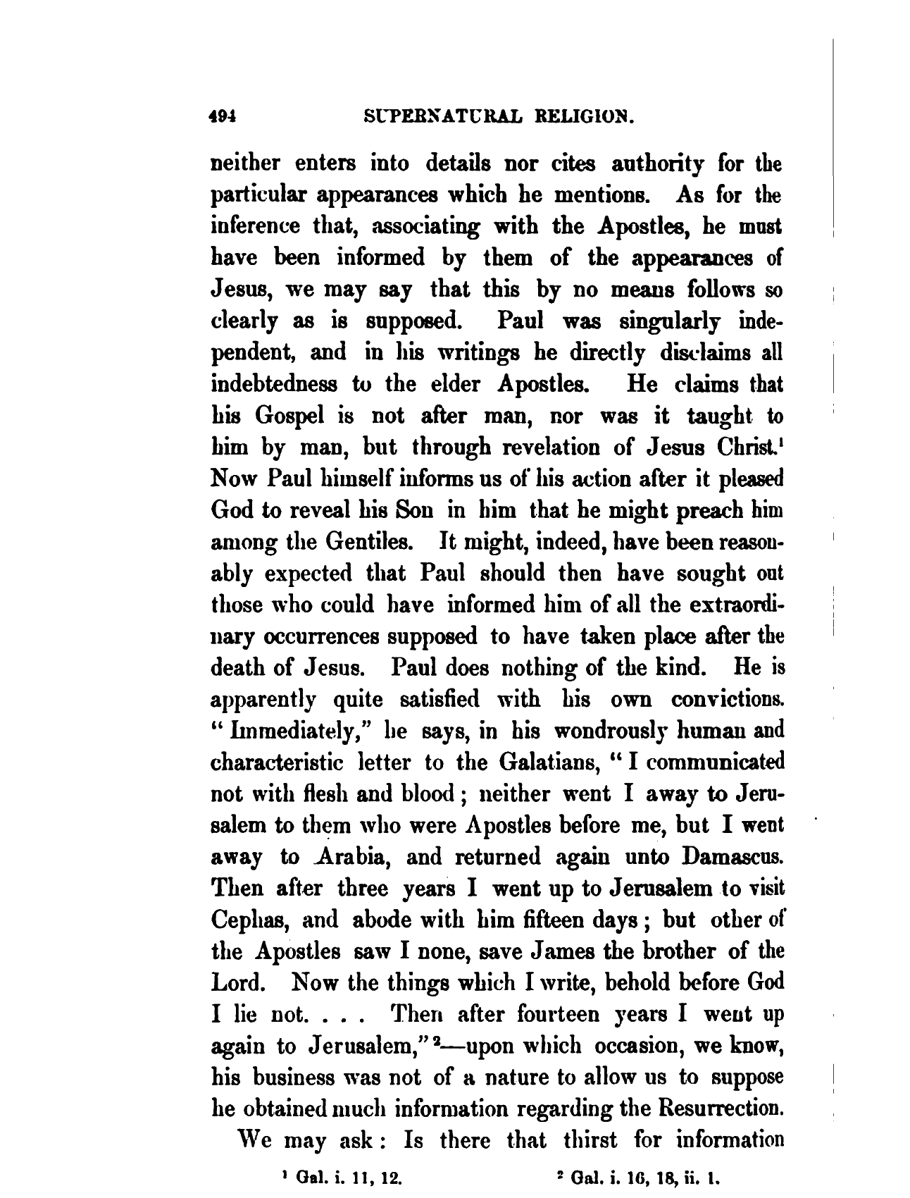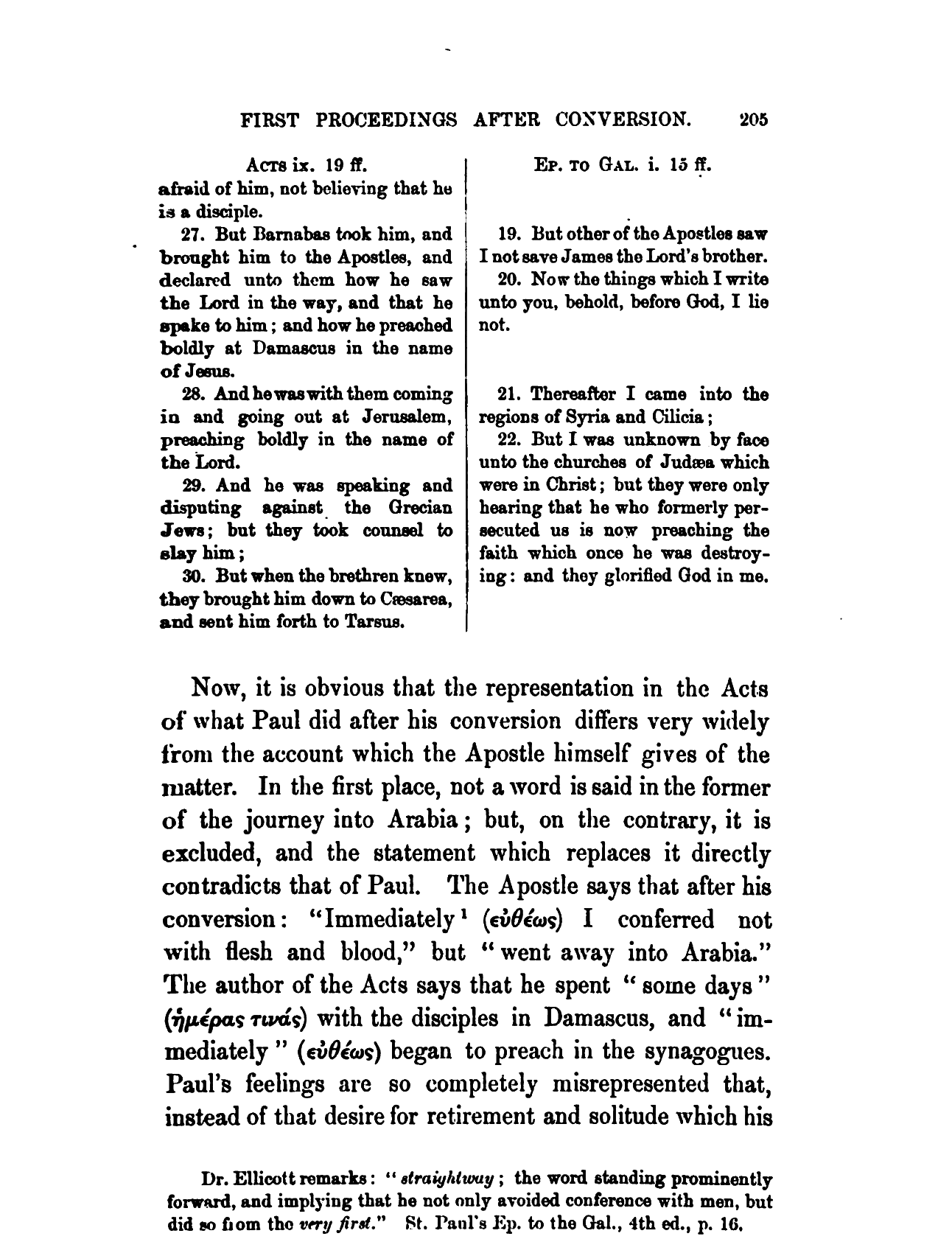Acts, who further represents Paul as immediately preaching publicly in Damascus and confounding the Jews. Widely different is the statement of Paul. He distinctly affirms that he did not communicate with flesh and blood, nor went he up to Jerusalem to them which were Apostles before him, but that he immediately went away into Arabia. The Fathers delighted in representing this journey to Arabia as an instance of Paul's fervour and eagerness to preach the Gospel in lands over which its sound had not yet gone forth. There can be no doubt, however, we think, that Paul's journey to Arabia and his sojourn there were for the purpose of reflection.(1) It is only in legends that instantaneous spiritual revolutions take place. In sober history the process is more slow and progressive. We repeat that there is no evidence which can at all be accepted that Paul's conversion was effected by a vision, and that it is infinitely more probable that it was, so to say, merely completed and crowned by seeing Jesus; but, at the same time, even if the view be held that this vision was the decisive circumstance which induced Paul at once to resign his course of persecution and embrace Christianity, our argument is not materially affected. In any case, much silent, deep, and almost unconscious preparation for the change must long before have proceeded in the mind of Paul, which was finally matured in the Arabian waste. Upon no view that is taken can this be excluded; upon every ground of common sense, experience, and necessary inference, it must be admitted.