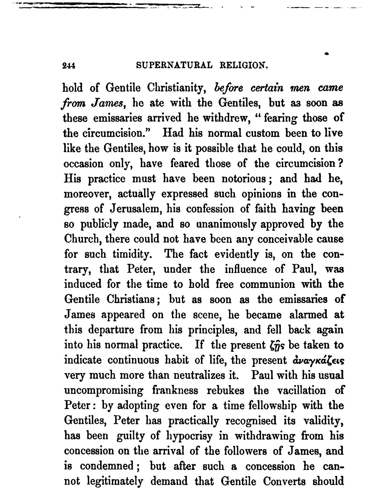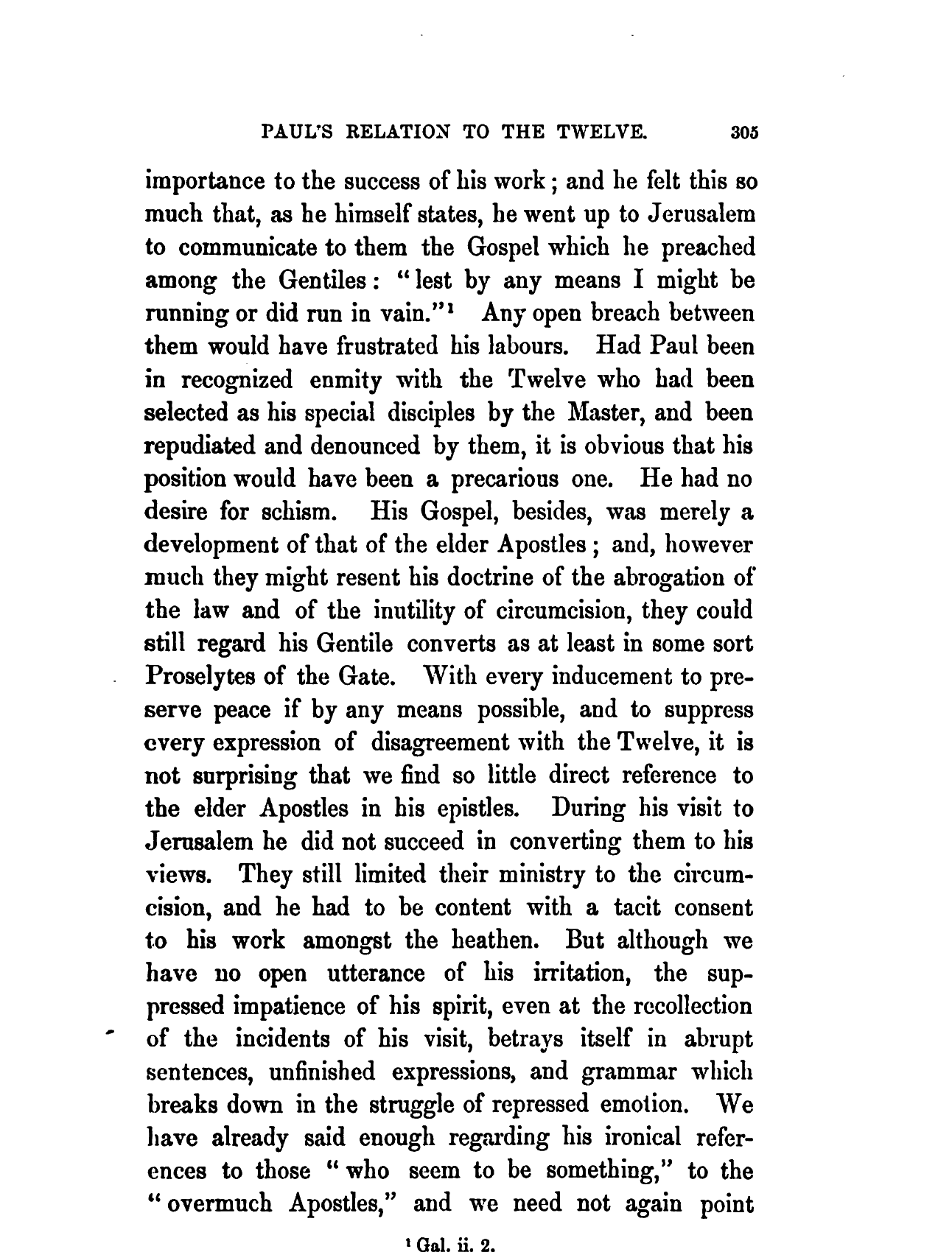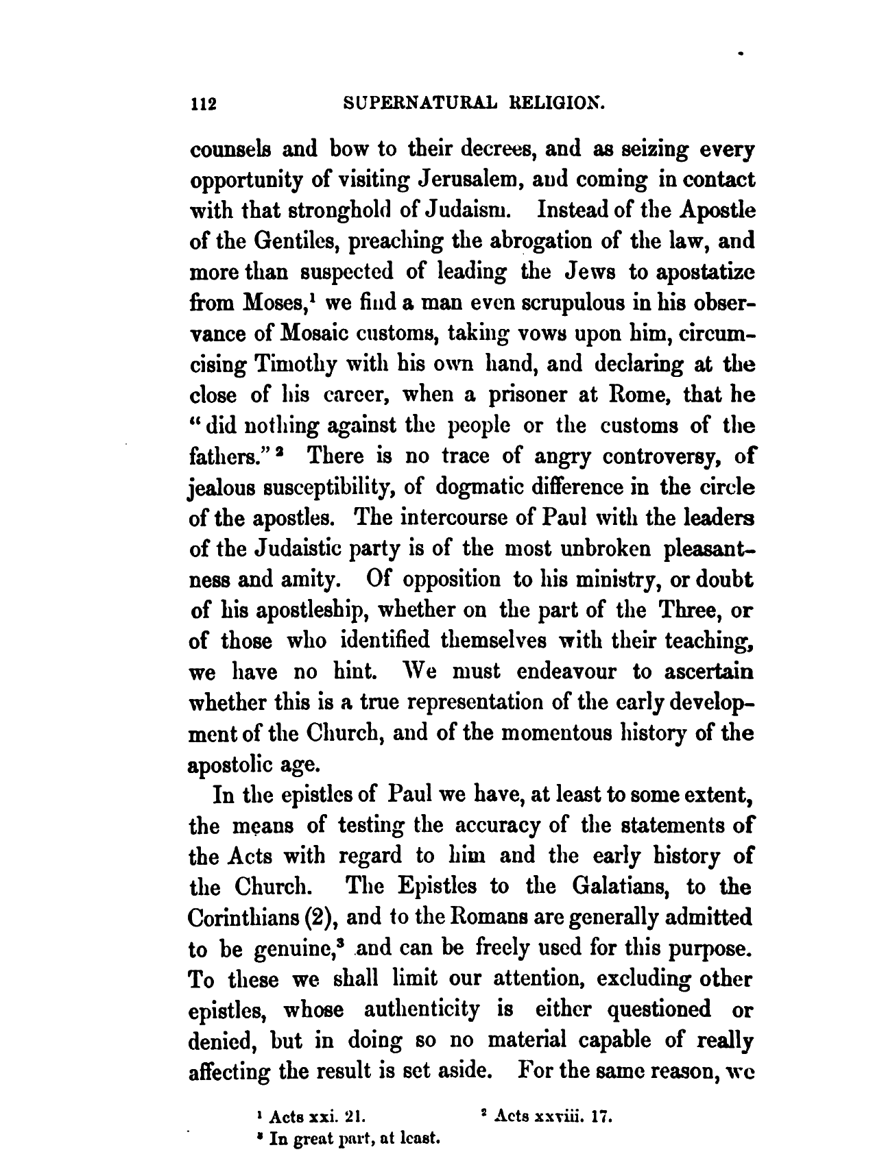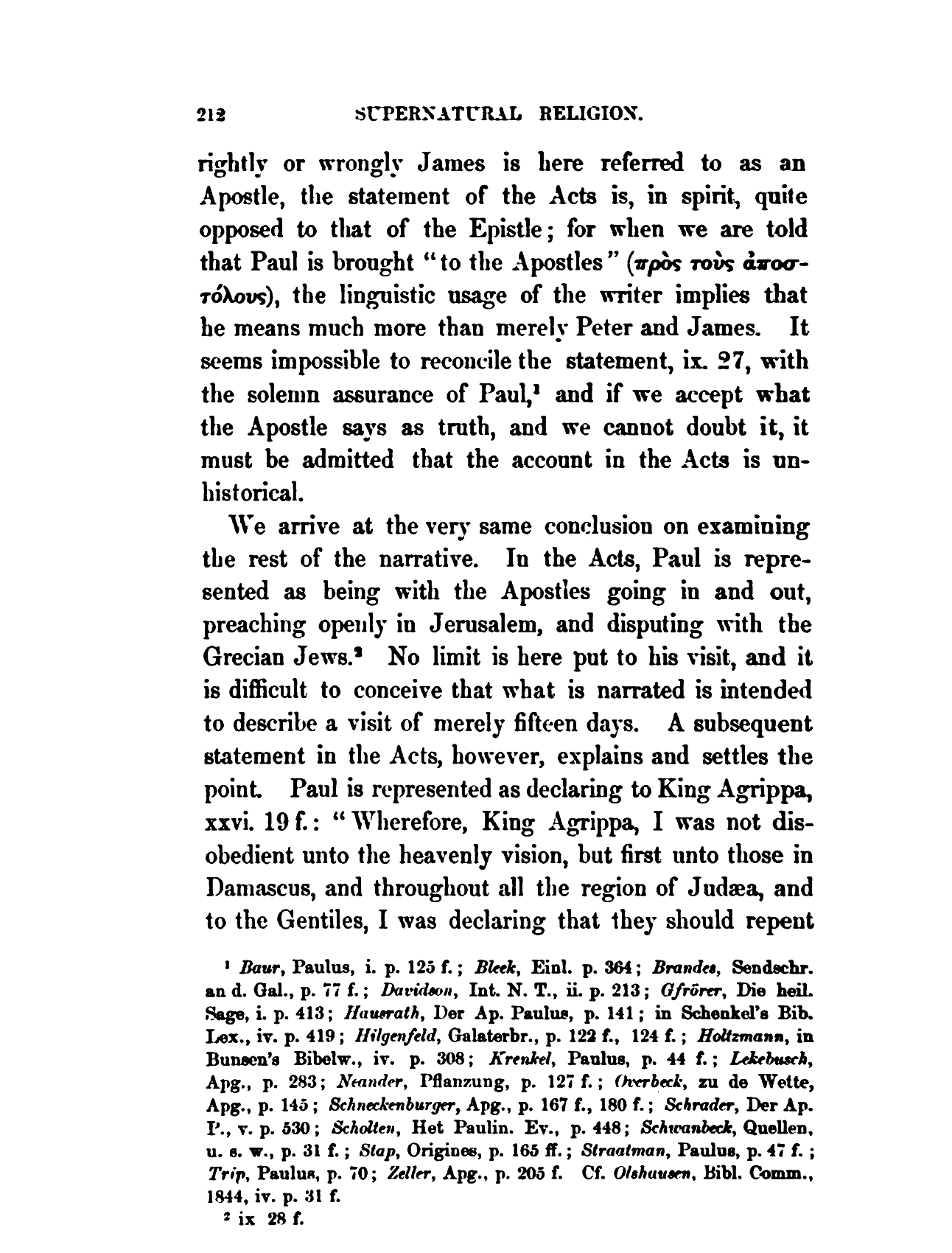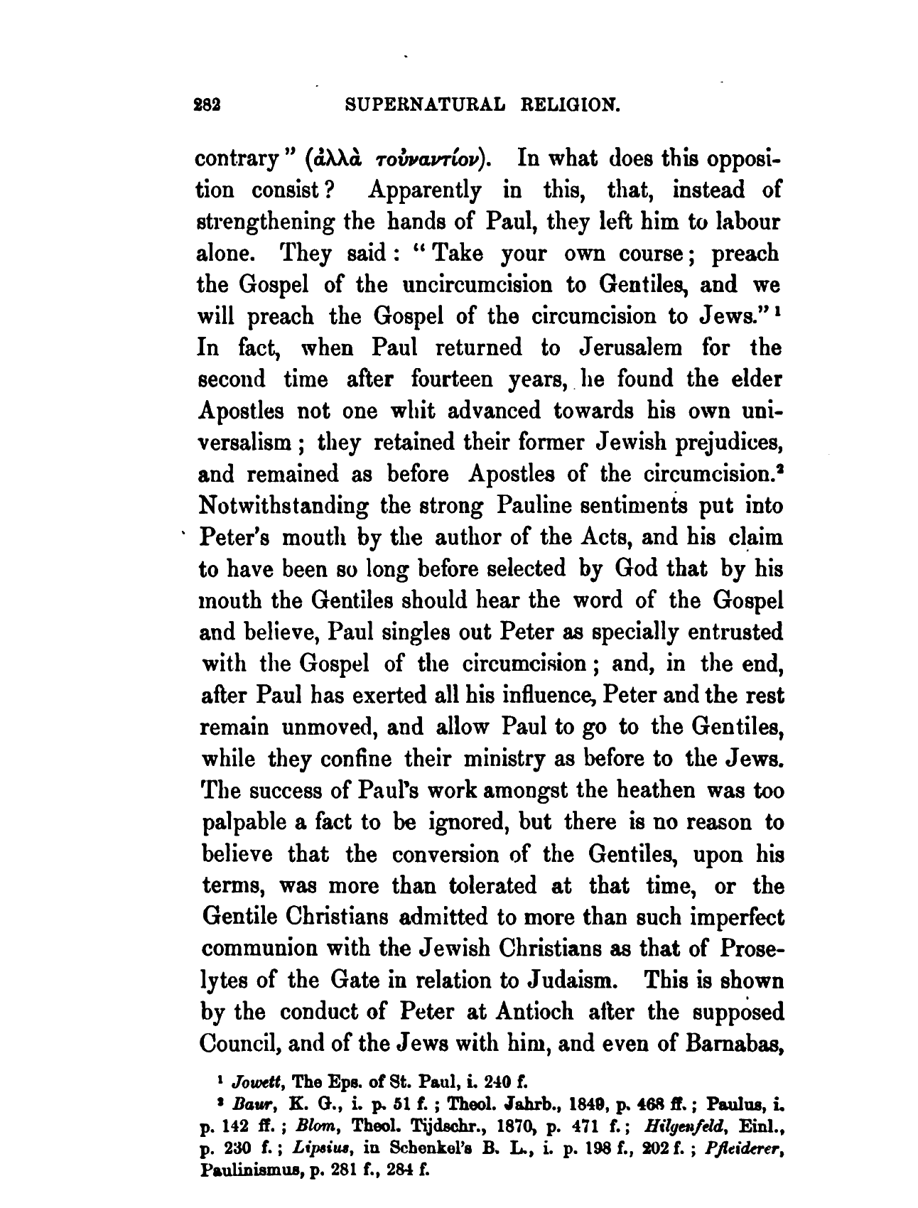 Acts, who further represents Paul as immediately preaching publicly in Damascus and confounding the Jews. Widely different is the statement of Paul. He distinctly affirms that he did not communicate with flesh and blood, nor went he up to Jerusalem to them which were Apostles before him, but that he immediately went away into Arabia. The Fathers delighted in representing this journey to Arabia as an instance of Paul's fervour and eagerness to preach the Gospel in lands over which its sound had not yet gone forth. There can be no doubt, however, we think, that Paul's journey to Arabia and his sojourn there were for the purpose of reflection.(1) It is only in legends that instantaneous spiritual revolutions take place. In sober history the process is more slow and progressive. We repeat that there is no evidence which can at all be accepted that Paul's conversion was effected by a vision, and that it is infinitely more probable that it was, so to say, merely completed and crowned by seeing Jesus; but, at the same time, even if the view be held that this vision was the decisive circumstance which induced Paul at once to resign his course of persecution and embrace Christianity, our argument is not materially affected. In any case, much silent, deep, and almost unconscious preparation for the change must long before have proceeded in the mind of Paul, which was finally matured in the Arabian waste. Upon no view that is taken can this be excluded; upon every ground of common sense, experience, and necessary inference, it must be admitted.