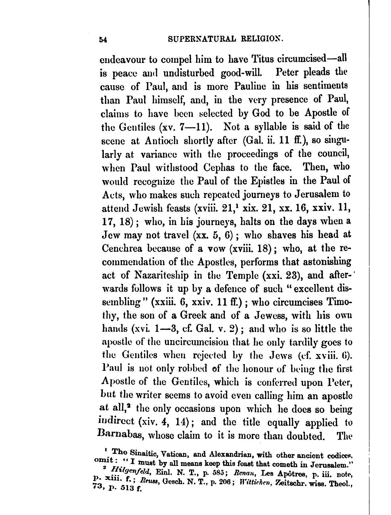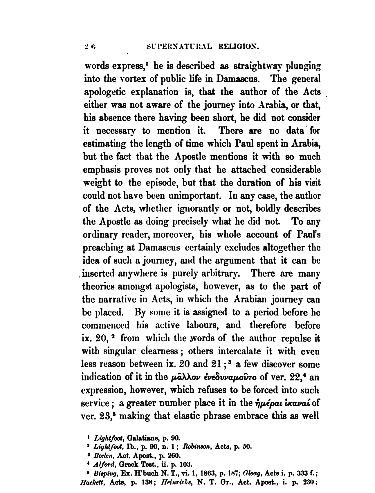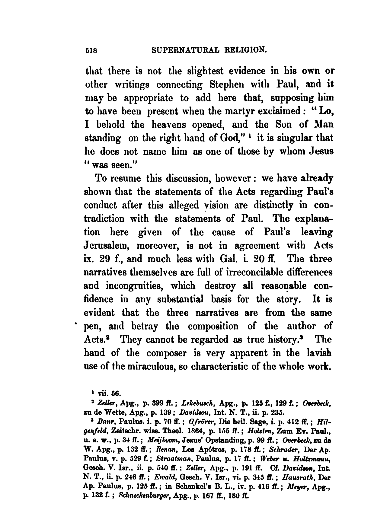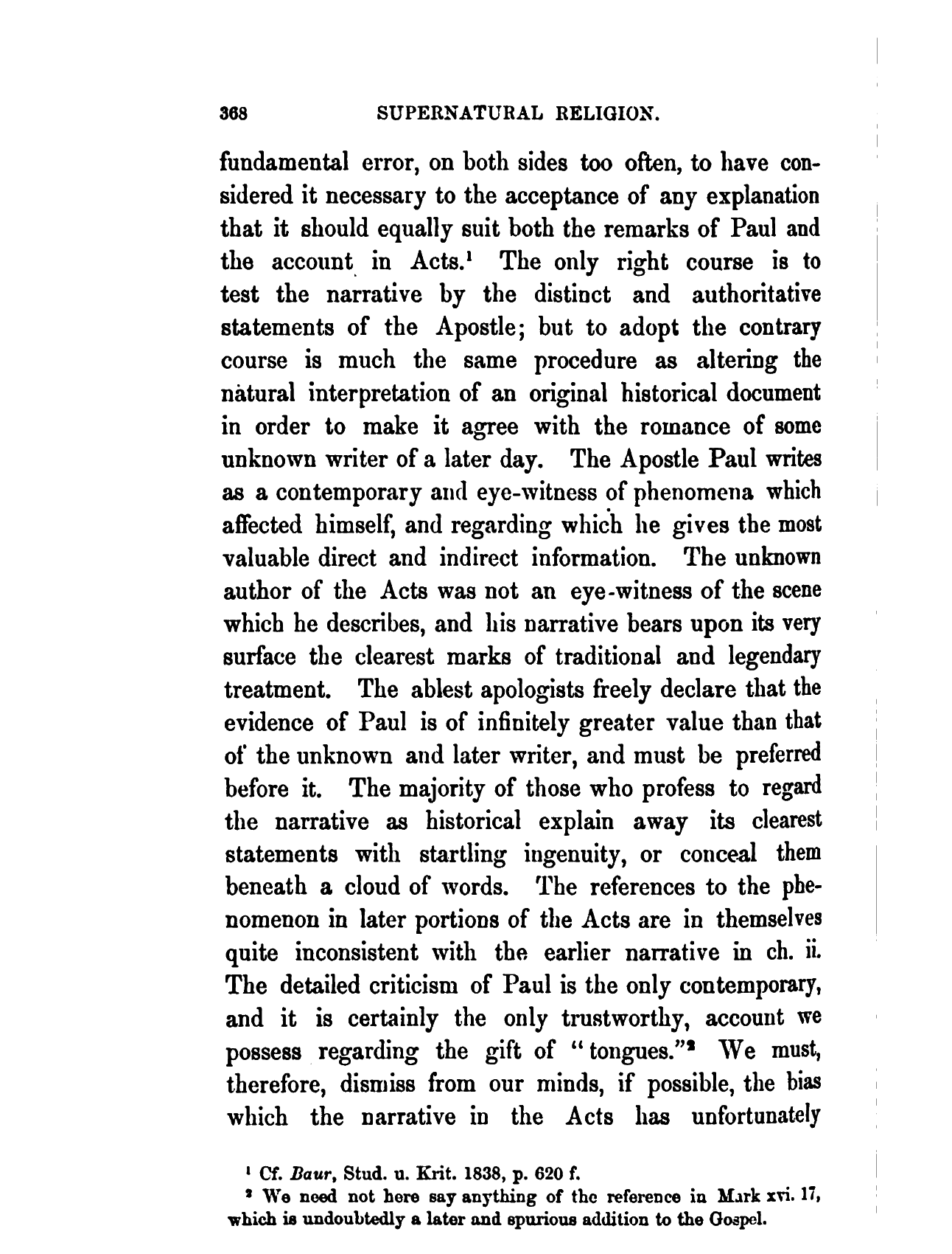 Acts, who further represents Paul as immediately preaching publicly in Damascus and confounding the Jews. Widely different is the statement of Paul. He distinctly affirms that he did not communicate with flesh and blood, nor went he up to Jerusalem to them which were Apostles before him, but that he immediately went away into Arabia. The Fathers delighted in representing this journey to Arabia as an instance of Paul's fervour and eagerness to preach the Gospel in lands over which its sound had not yet gone forth. There can be no doubt, however, we think, that Paul's journey to Arabia and his sojourn there were for the purpose of reflection.(1) It is only in legends that instantaneous spiritual revolutions take place. In sober history the process is more slow and progressive. We repeat that there is no evidence which can at all be accepted that Paul's conversion was effected by a vision, and that it is infinitely more probable that it was, so to say, merely completed and crowned by seeing Jesus; but, at the same time, even if the view be held that this vision was the decisive circumstance which induced Paul at once to resign his course of persecution and embrace Christianity, our argument is not materially affected. In any case, much silent, deep, and almost unconscious preparation for the change must long before have proceeded in the mind of Paul, which was finally matured in the Arabian waste. Upon no view that is taken can this be excluded; upon every ground of common sense, experience, and necessary inference, it must be admitted.