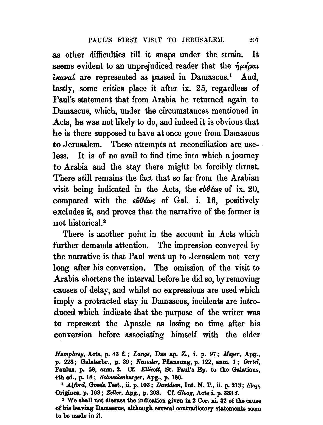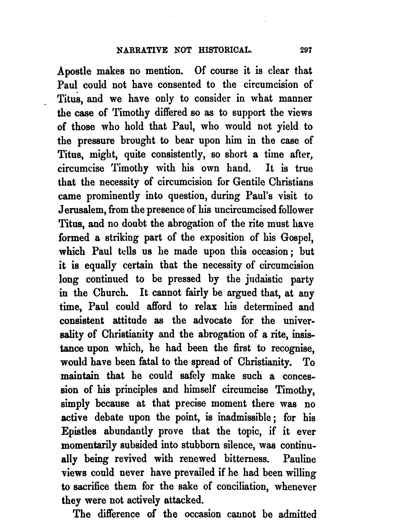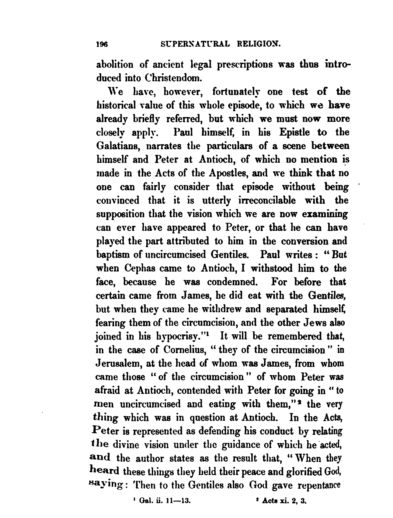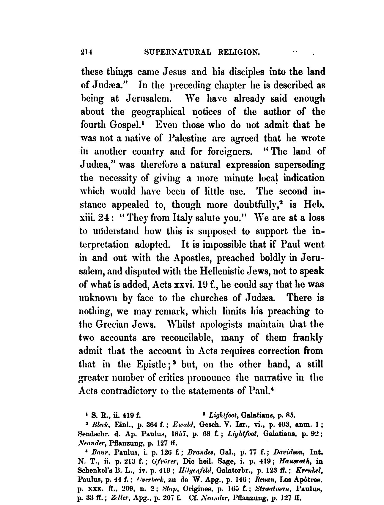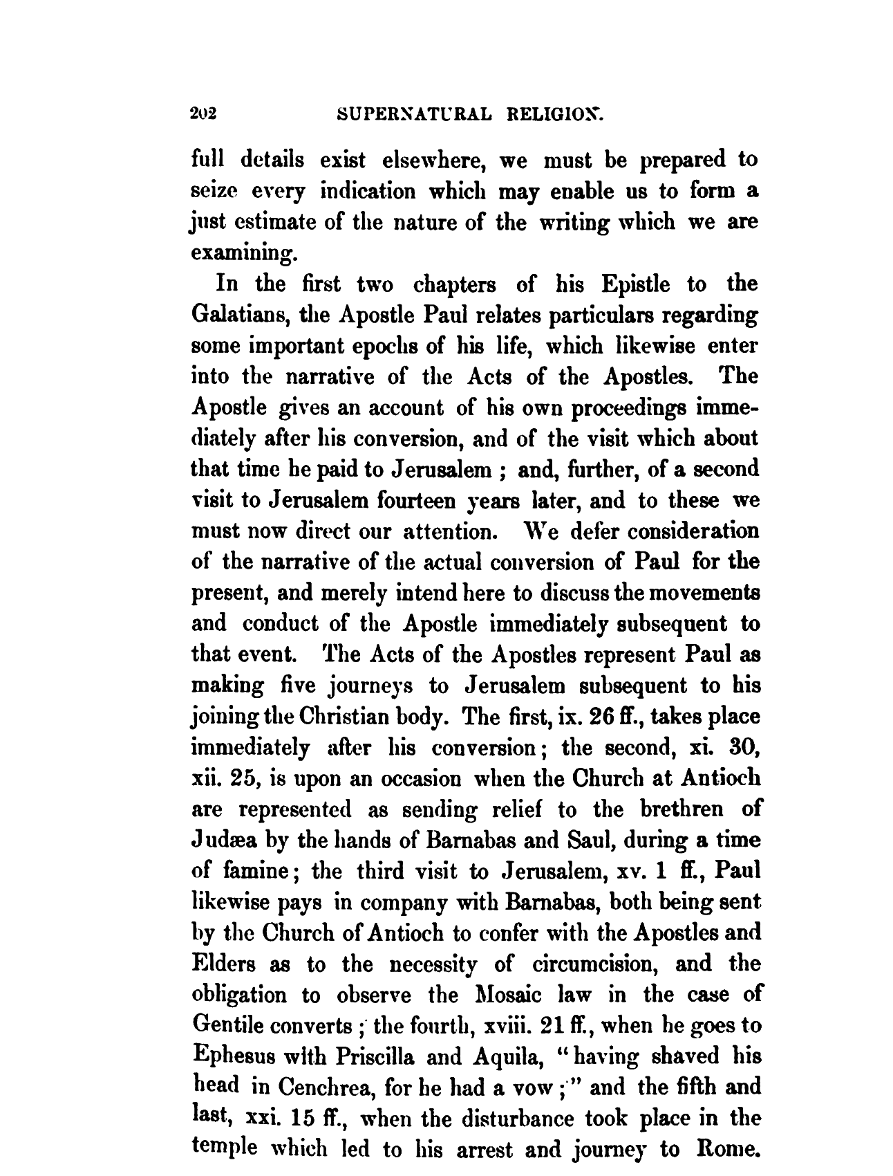 Acts, who further represents Paul as immediately preaching publicly in Damascus and confounding the Jews. Widely different is the statement of Paul. He distinctly affirms that he did not communicate with flesh and blood, nor went he up to Jerusalem to them which were Apostles before him, but that he immediately went away into Arabia. The Fathers delighted in representing this journey to Arabia as an instance of Paul's fervour and eagerness to preach the Gospel in lands over which its sound had not yet gone forth. There can be no doubt, however, we think, that Paul's journey to Arabia and his sojourn there were for the purpose of reflection.(1) It is only in legends that instantaneous spiritual revolutions take place. In sober history the process is more slow and progressive. We repeat that there is no evidence which can at all be accepted that Paul's conversion was effected by a vision, and that it is infinitely more probable that it was, so to say, merely completed and crowned by seeing Jesus; but, at the same time, even if the view be held that this vision was the decisive circumstance which induced Paul at once to resign his course of persecution and embrace Christianity, our argument is not materially affected. In any case, much silent, deep, and almost unconscious preparation for the change must long before have proceeded in the mind of Paul, which was finally matured in the Arabian waste. Upon no view that is taken can this be excluded; upon every ground of common sense, experience, and necessary inference, it must be admitted.