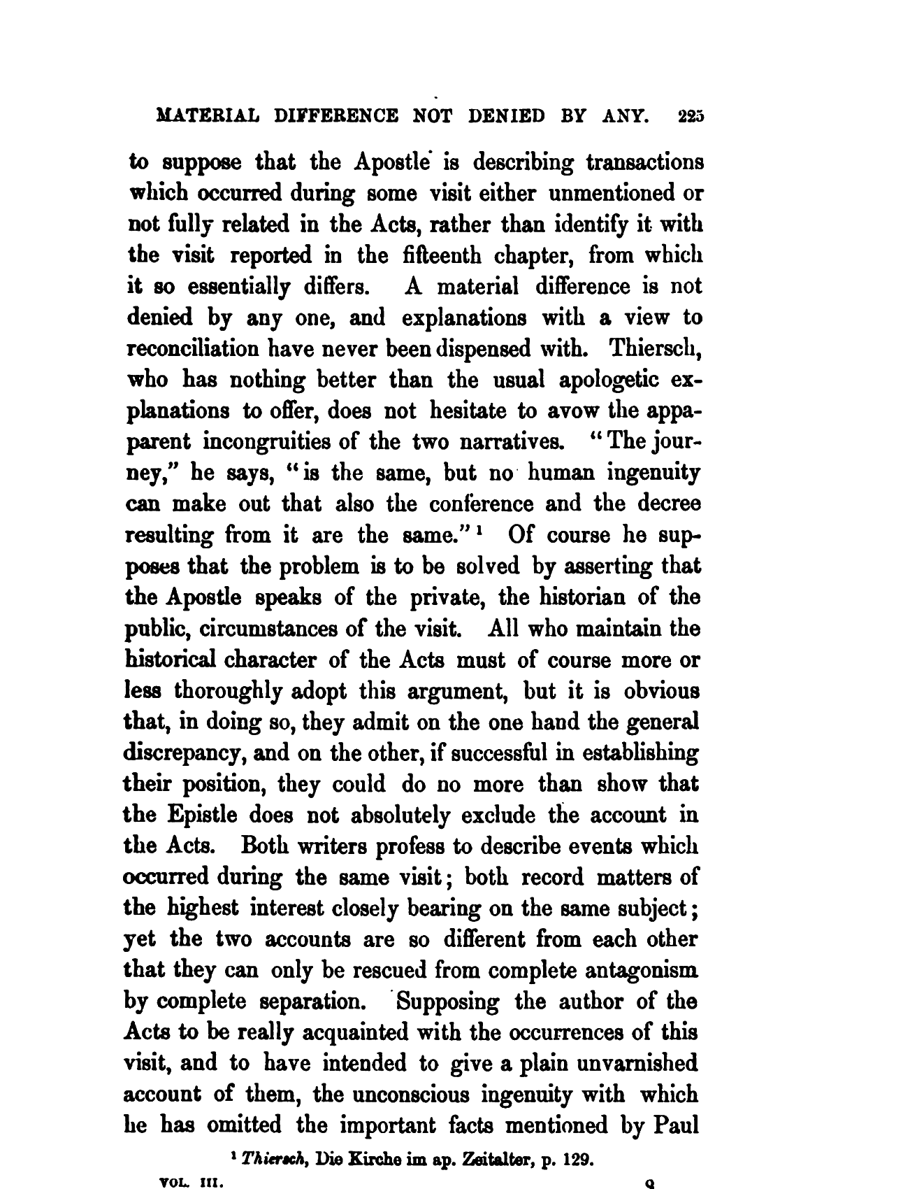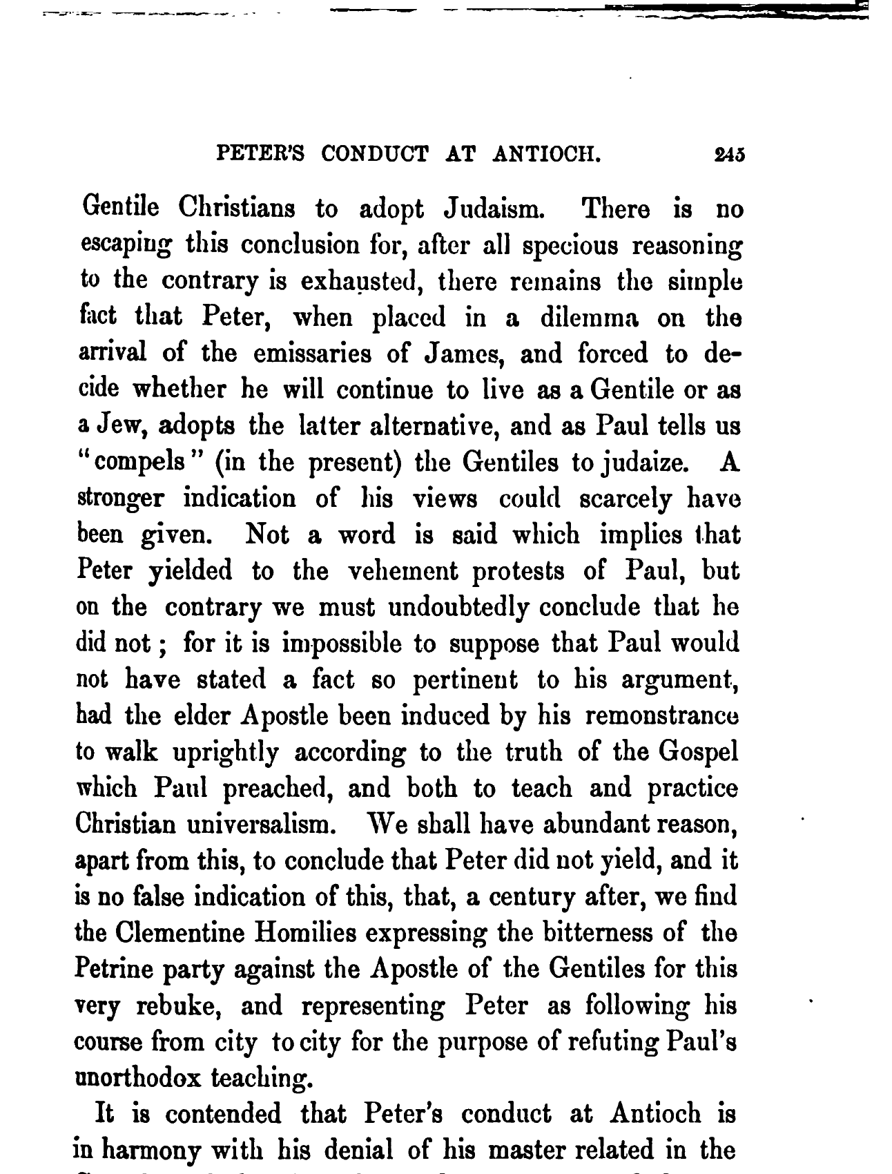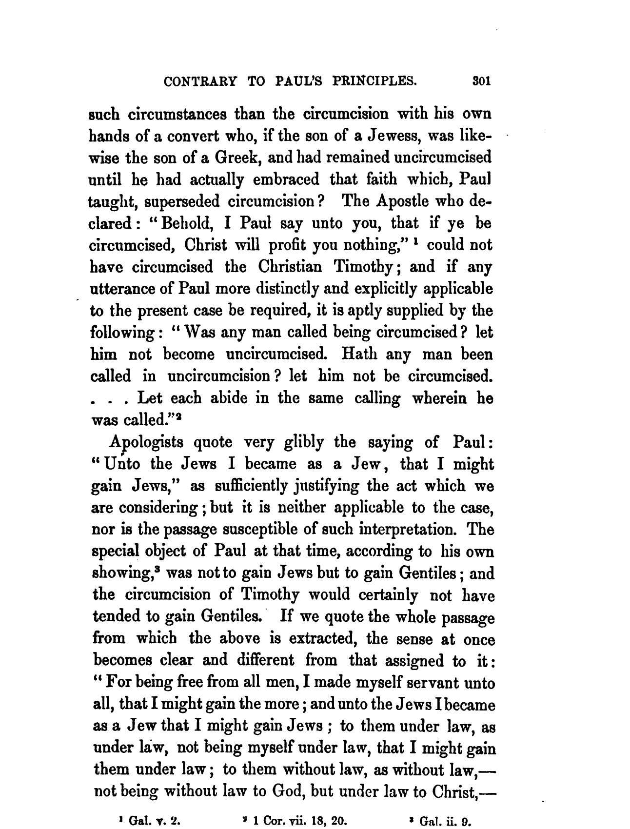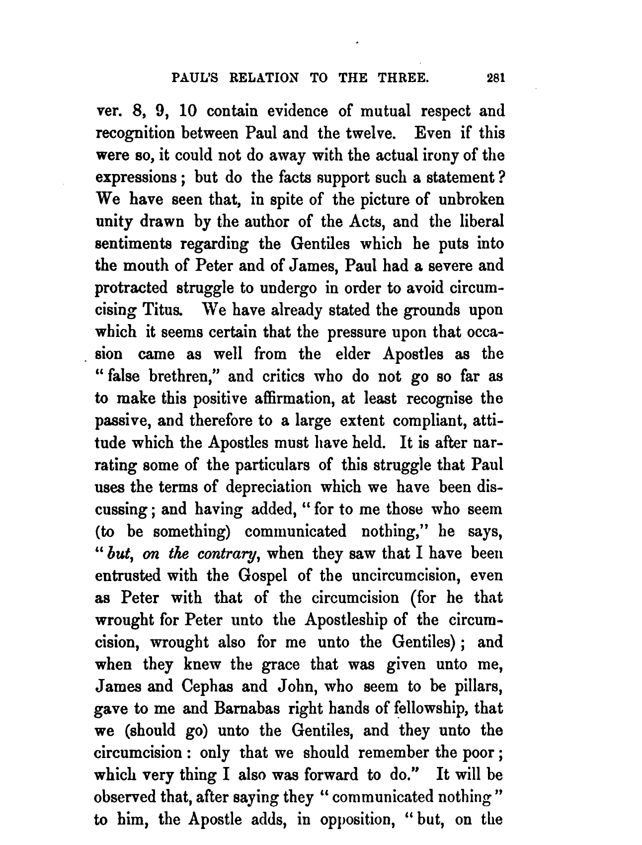 Acts, who further represents Paul as immediately preaching publicly in Damascus and confounding the Jews. Widely different is the statement of Paul. He distinctly affirms that he did not communicate with flesh and blood, nor went he up to Jerusalem to them which were Apostles before him, but that he immediately went away into Arabia. The Fathers delighted in representing this journey to Arabia as an instance of Paul's fervour and eagerness to preach the Gospel in lands over which its sound had not yet gone forth. There can be no doubt, however, we think, that Paul's journey to Arabia and his sojourn there were for the purpose of reflection.(1) It is only in legends that instantaneous spiritual revolutions take place. In sober history the process is more slow and progressive. We repeat that there is no evidence which can at all be accepted that Paul's conversion was effected by a vision, and that it is infinitely more probable that it was, so to say, merely completed and crowned by seeing Jesus; but, at the same time, even if the view be held that this vision was the decisive circumstance which induced Paul at once to resign his course of persecution and embrace Christianity, our argument is not materially affected. In any case, much silent, deep, and almost unconscious preparation for the change must long before have proceeded in the mind of Paul, which was finally matured in the Arabian waste. Upon no view that is taken can this be excluded; upon every ground of common sense, experience, and necessary inference, it must be admitted.