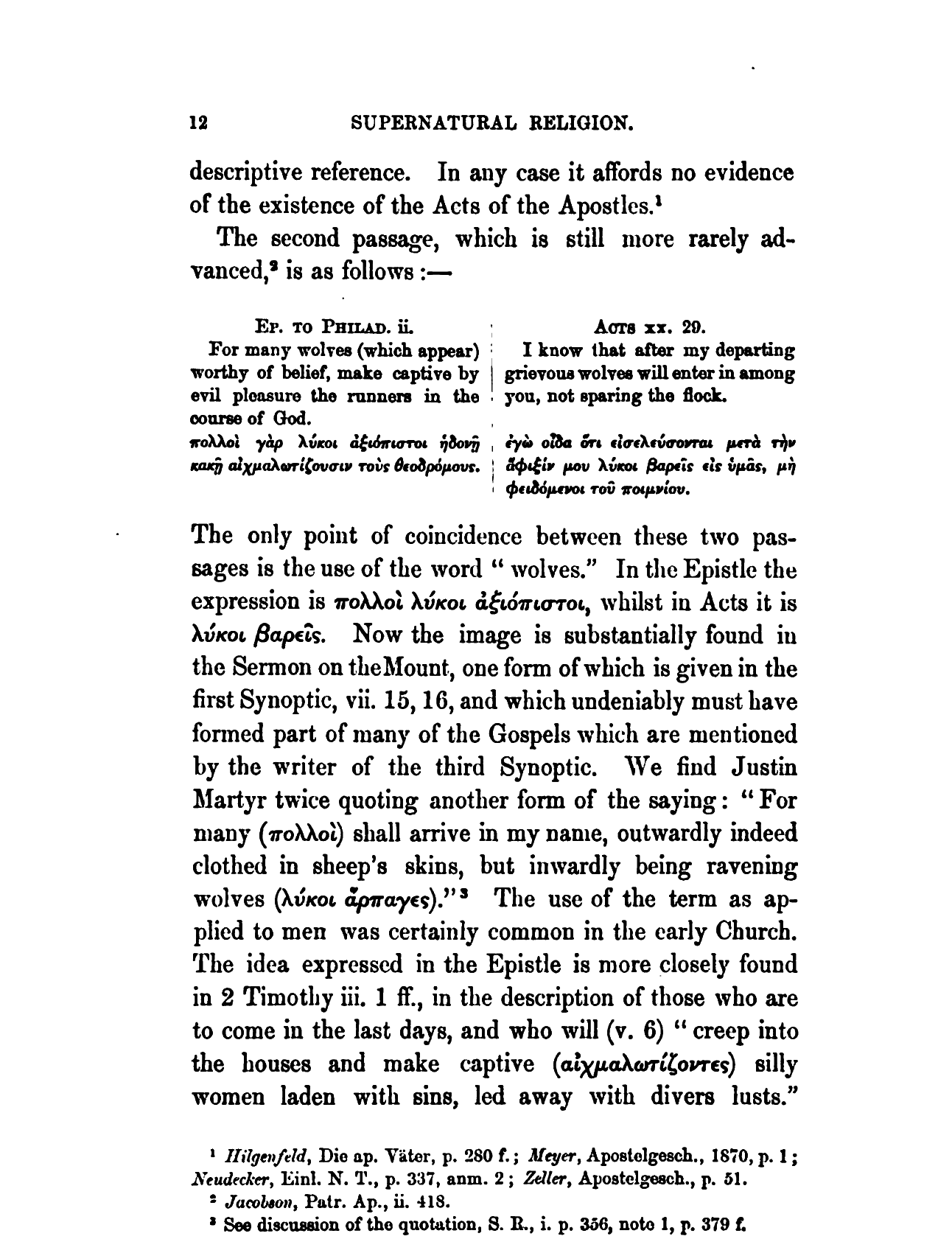The only point of coincidence between these two passages is the use of the word "wolves." In the Epistle the expression is [———], whilst in Acts it is [———]. Now the image is substantially found in the Sermon on the Mount, one form of which is given in the first Synoptic, vii. 15,16, and which undeniably must have formed part of many of the Gospels which are mentioned by the writer of the third Synoptic. We find Justin Martyr twice quoting another form of the saying: "For many [———] shall arrive in my name, outwardly indeed clothed in sheep's skins, but inwardly being ravening wolves [———]."(3) The use of the term as applied to men was certainly common in the early Church. The idea expressed in the Epistle is more closely found in 2 Timothy iii. 1 ff., in the description of those who are to come in the last days, and who will (v. 6) "creep into the houses and make captive [———] silly women laden with sins, led away with divers lusts."
