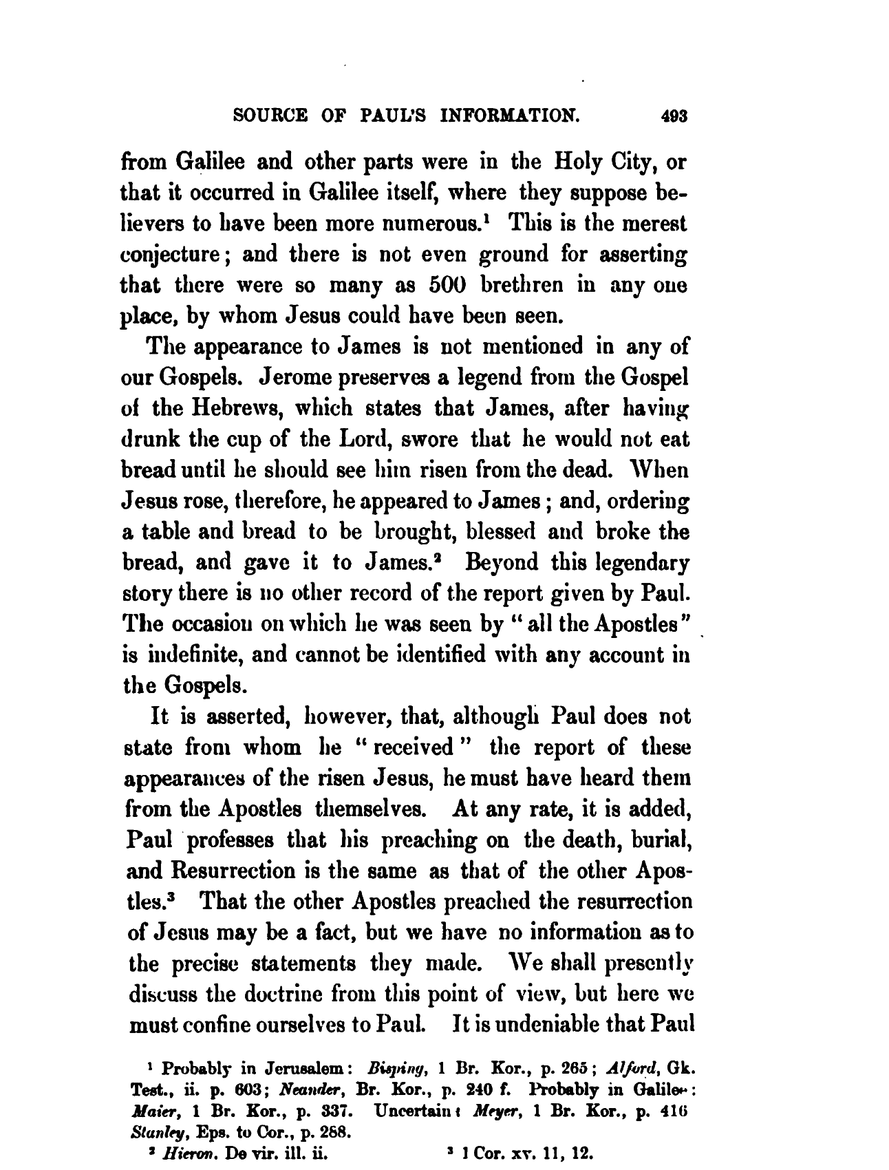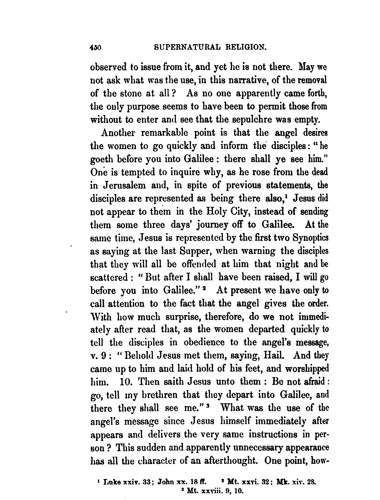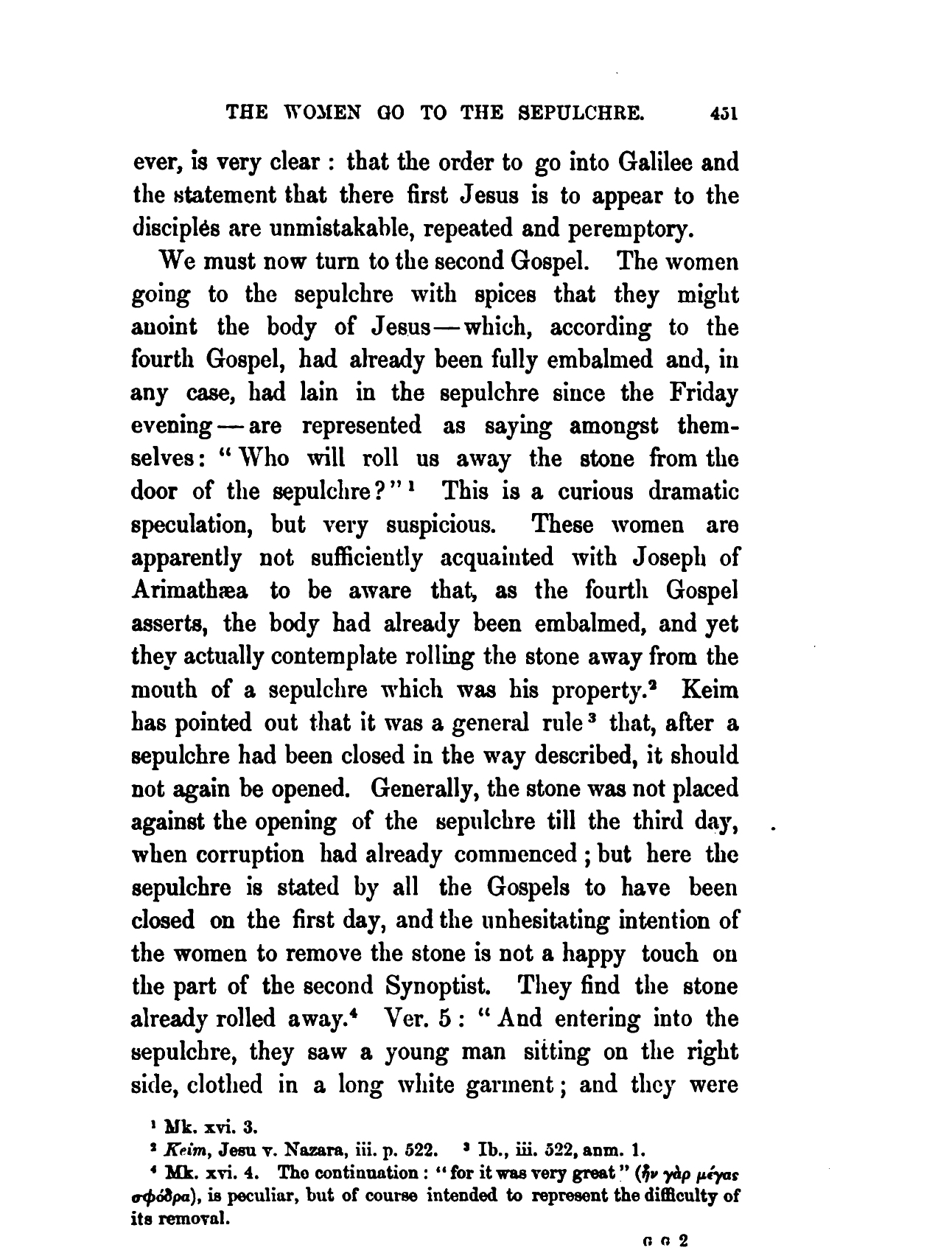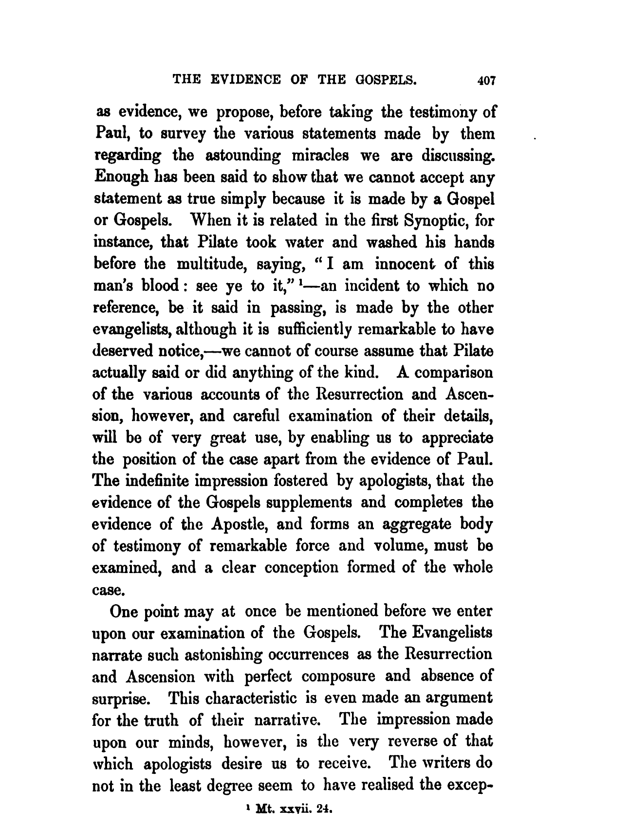 apologists who adopt this argument we might point to many passages in the Gospels, which affirm that the resurrection on the third day was predicted. These, however, we assign of course to a later date. The argument assumes that there was no preparation in the teaching of Jesus, which, as we have endeavoured to suggest, is not the case. If there had been no other, the mere assurance that he was the Messiah must have led to reflections, which demanded some other sequel to his career than the death of a slave. The mere suggestion of such a problem as must have proposed itself to the minds of the disciples: If all is to end here, Jesus was not the Messiah: if he was the Messiah, what will now happen?—must have led to expectant attention. But there was much more than this. In such moments as those of the Passion, thought works feverishly and fast. It is not to be supposed that Peter and the rest did not foresee the end, when Jesus was led away prisoner in the hands of his enemies. It is still less to be imagined that their minds were not ceaselessly revolving that problem, on the solution of which depended their fondest hopes and highest aspirations.1 It is most probable, indeed, that no time could have found the disciples in a state so ripe for strong impressions as that immediately succeeding the death of their Master. There are, however, other aspects in which this point may be placed. What evidence is there that Jesus was seen, or supposed to have been seen, on the third day? Absolutely none worthy of the name. Paul does not say that he was, and as for the Gospels their