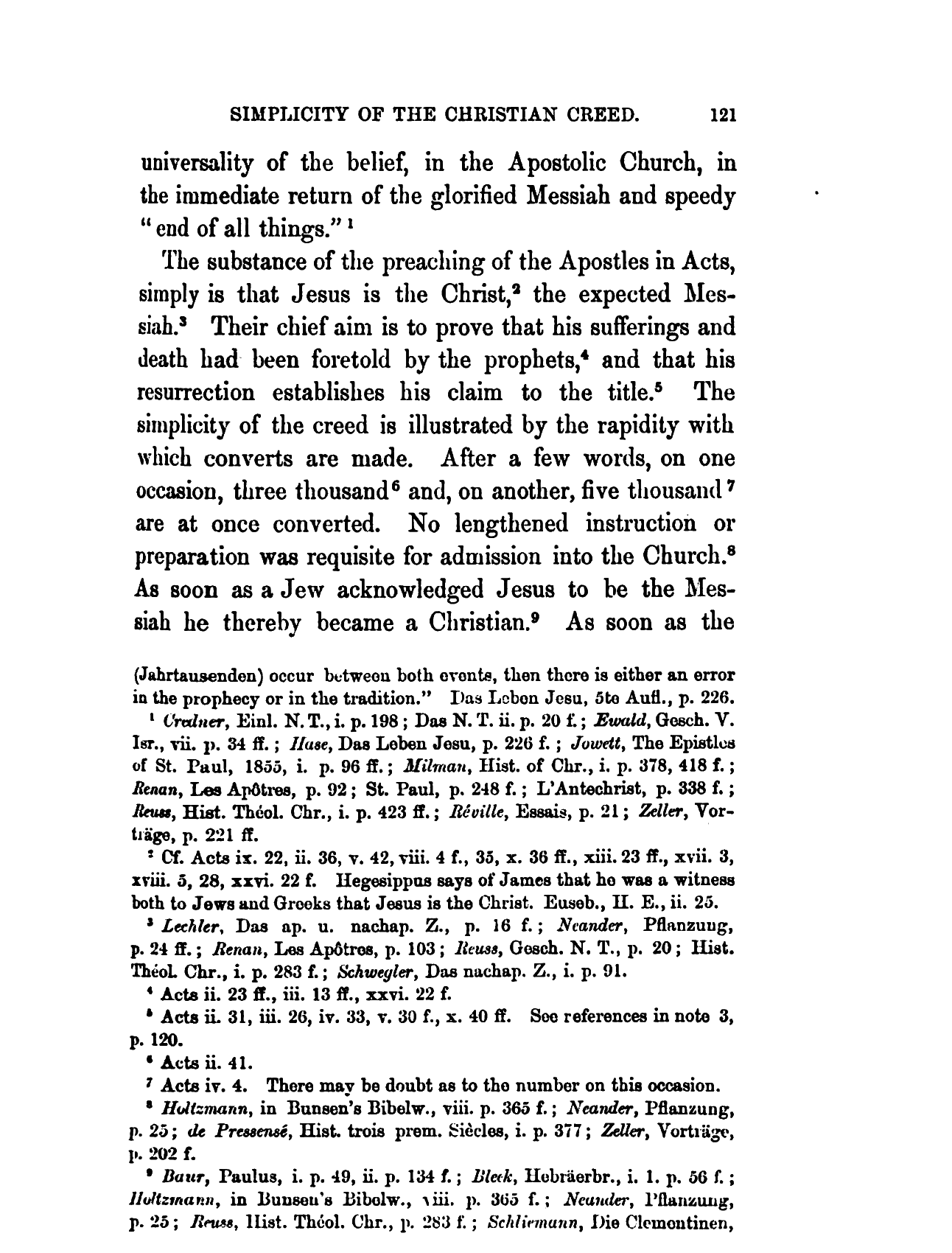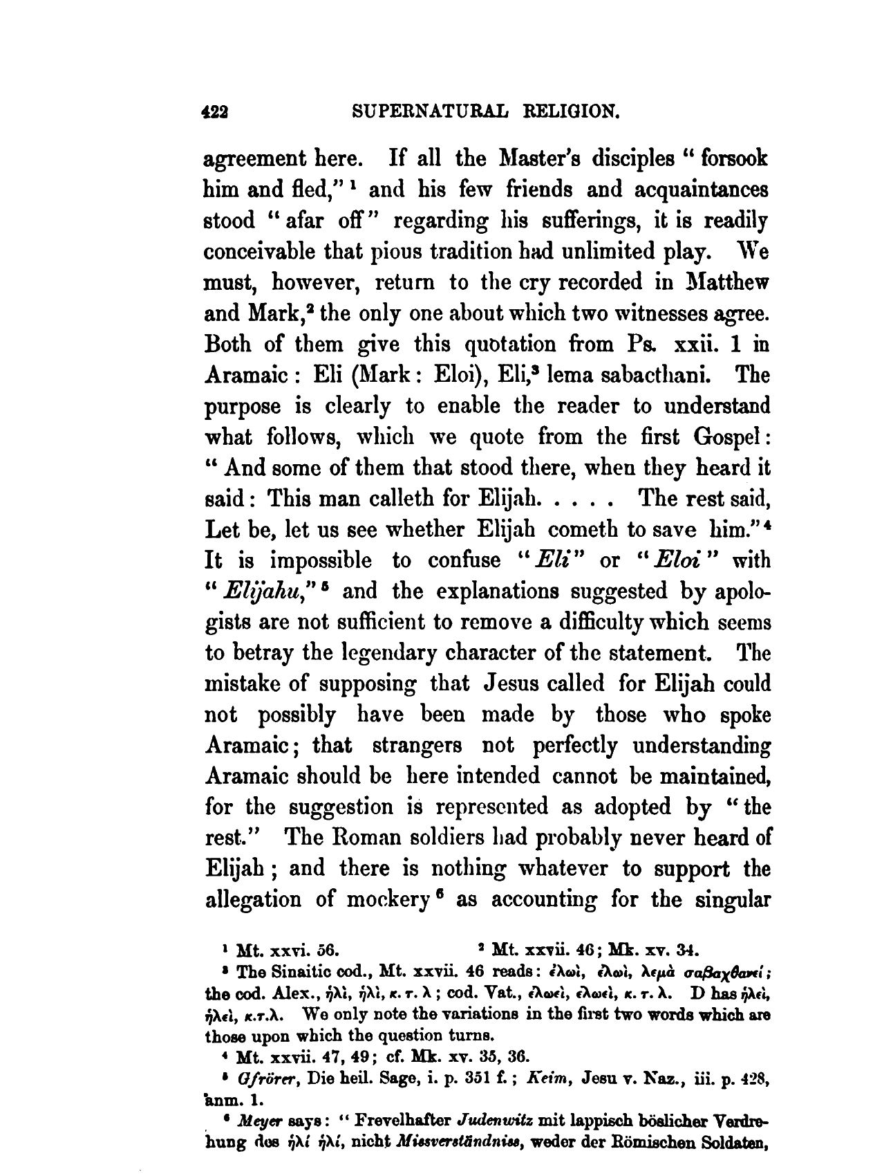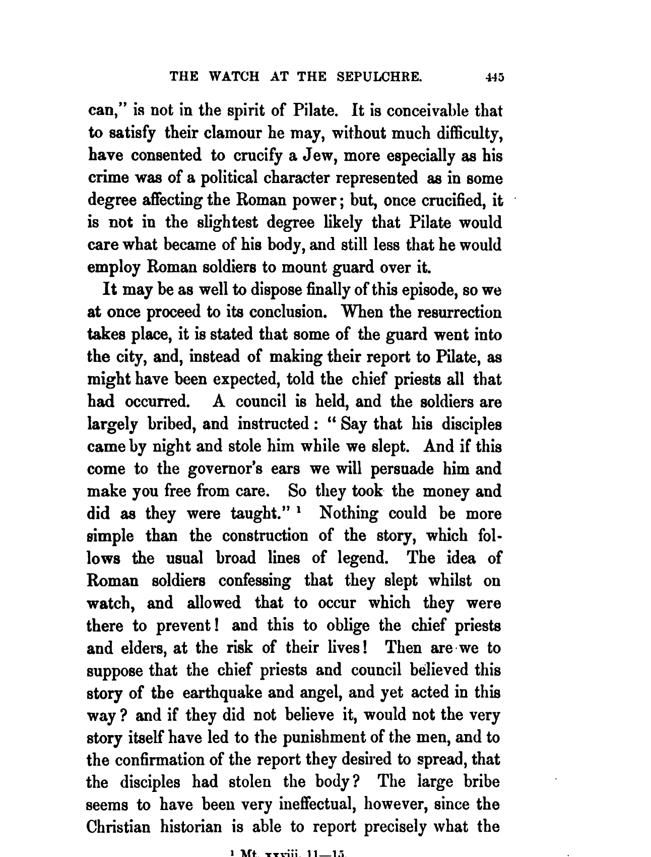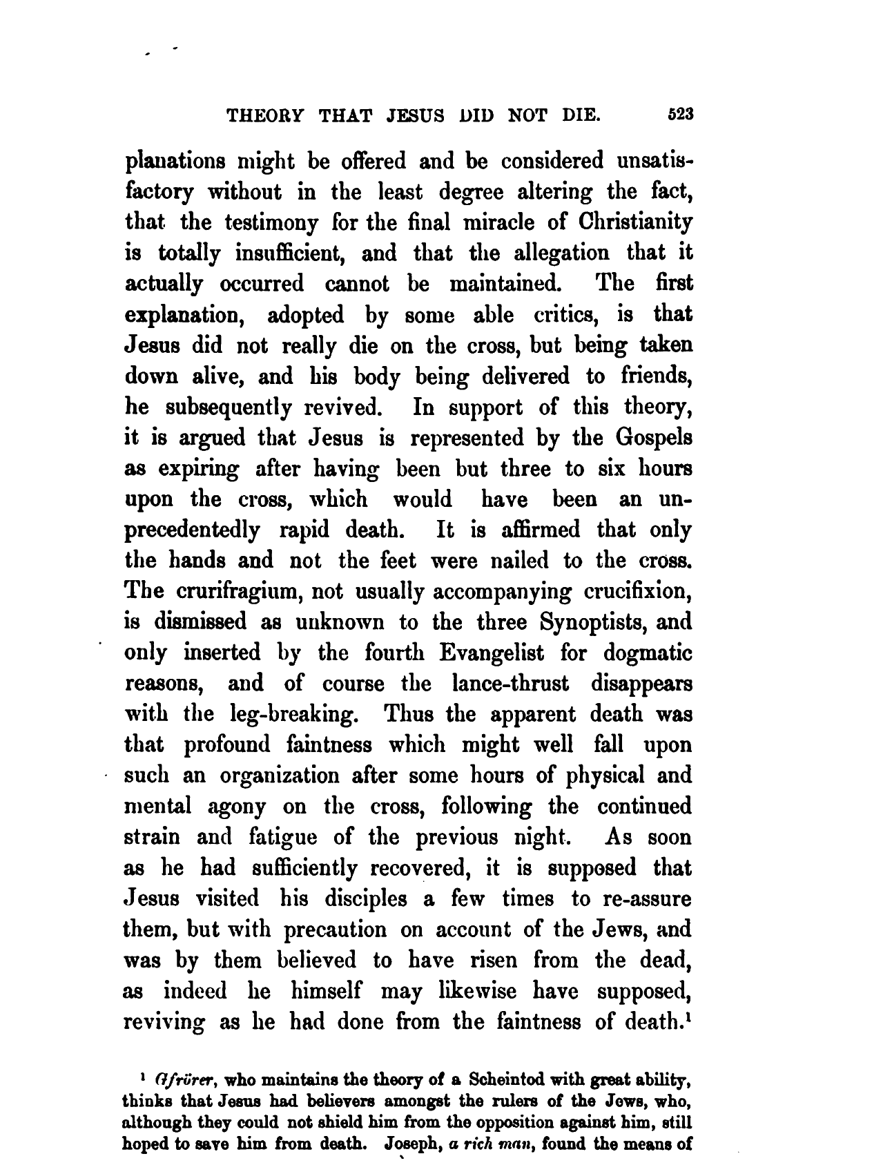 apologists who adopt this argument we might point to many passages in the Gospels, which affirm that the resurrection on the third day was predicted. These, however, we assign of course to a later date. The argument assumes that there was no preparation in the teaching of Jesus, which, as we have endeavoured to suggest, is not the case. If there had been no other, the mere assurance that he was the Messiah must have led to reflections, which demanded some other sequel to his career than the death of a slave. The mere suggestion of such a problem as must have proposed itself to the minds of the disciples: If all is to end here, Jesus was not the Messiah: if he was the Messiah, what will now happen?—must have led to expectant attention. But there was much more than this. In such moments as those of the Passion, thought works feverishly and fast. It is not to be supposed that Peter and the rest did not foresee the end, when Jesus was led away prisoner in the hands of his enemies. It is still less to be imagined that their minds were not ceaselessly revolving that problem, on the solution of which depended their fondest hopes and highest aspirations.1 It is most probable, indeed, that no time could have found the disciples in a state so ripe for strong impressions as that immediately succeeding the death of their Master. There are, however, other aspects in which this point may be placed. What evidence is there that Jesus was seen, or supposed to have been seen, on the third day? Absolutely none worthy of the name. Paul does not say that he was, and as for the Gospels their