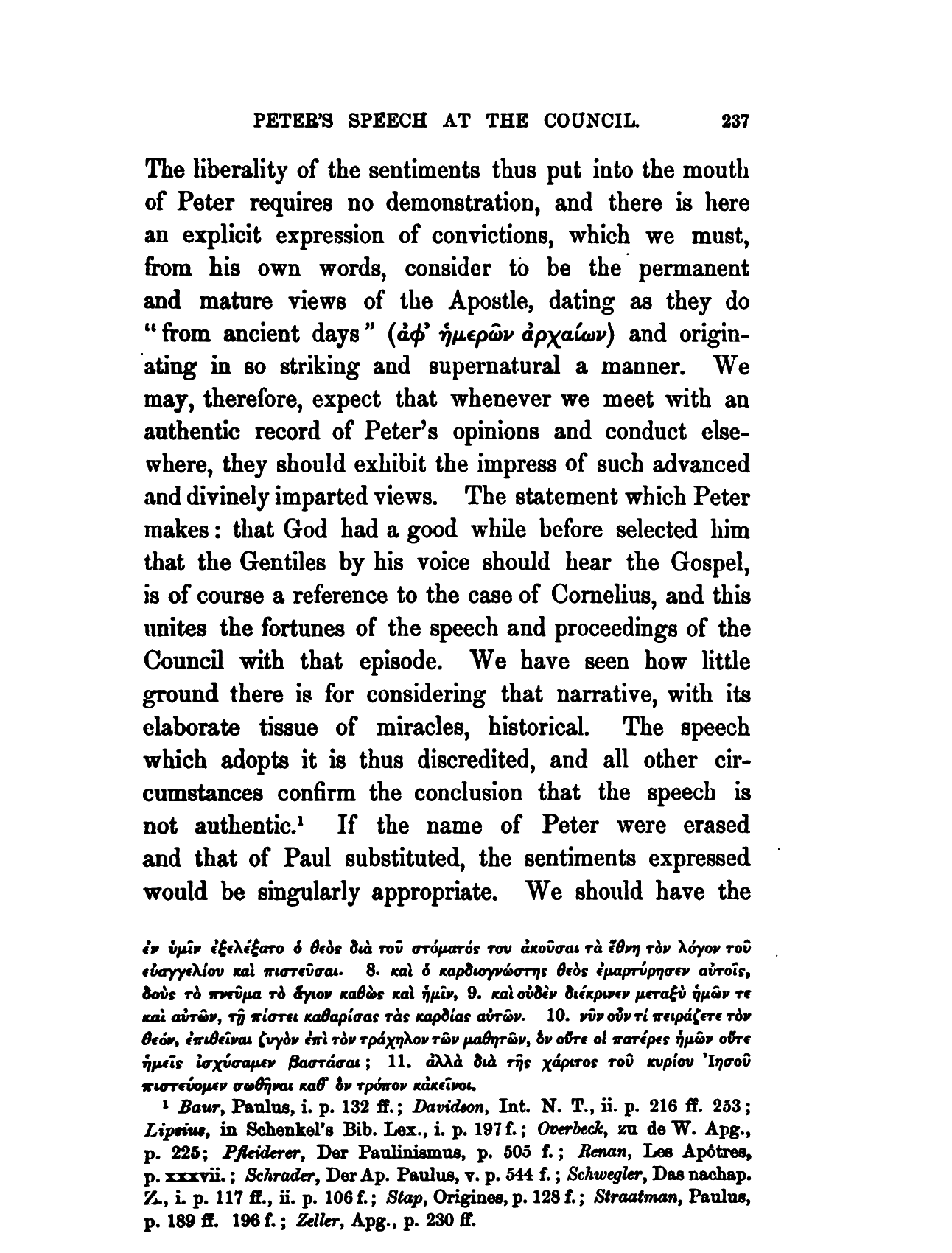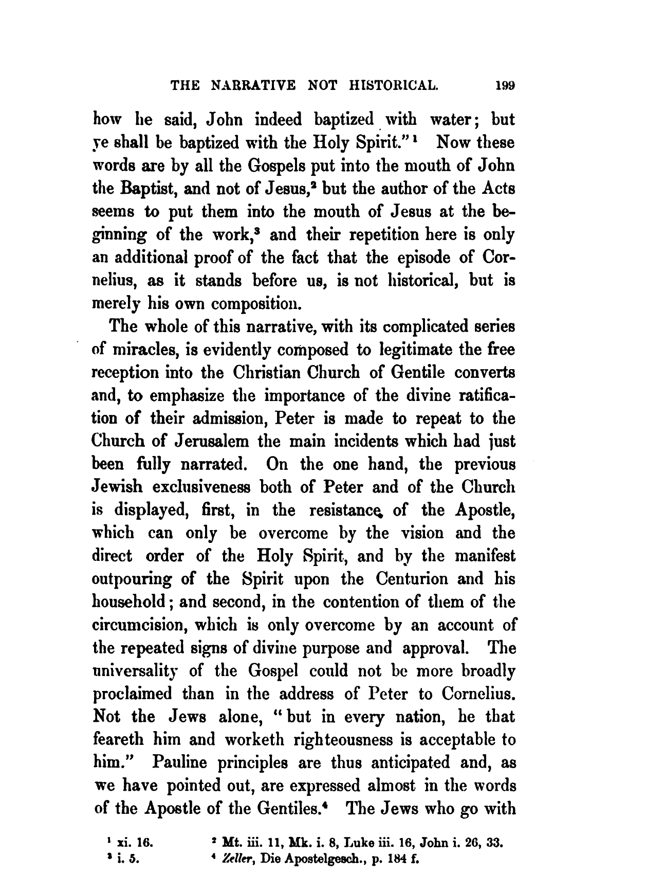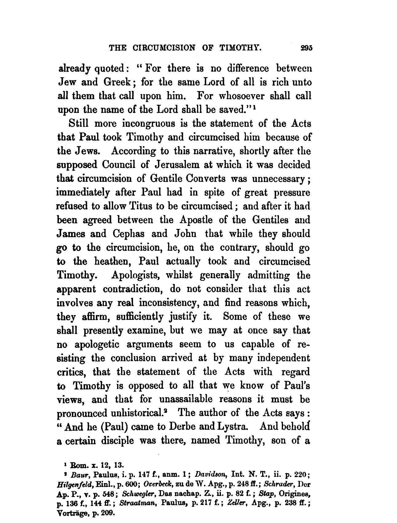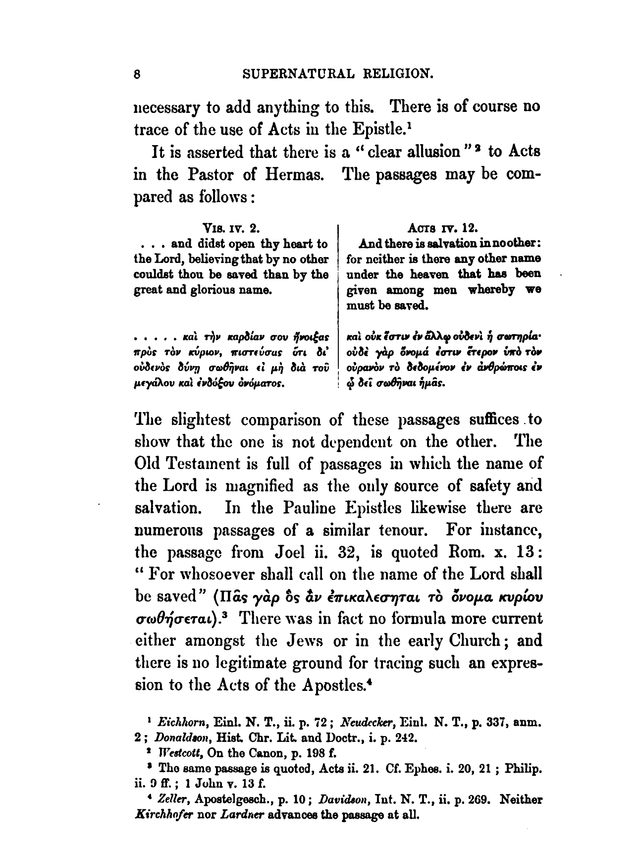 The slightest comparison of these passages suffices to show that the one is not dependent on the other. The Old Testament is full of passages in which the name of the Lord is magnified as the only source of safety and salvation. In the Pauline Epistles likewise there are numerous passages of a similar tenour. For instance, the passage from Joel ii. 32, is quoted Rom. x. 13: "For whosoever shall call on the name of the Lord shall be saved" [———](3) There was in fact no formula more current either amongst the Jews or in the early Church; and there is no legitimate ground for tracing such an expression to the Acts of the Apostles.(4)