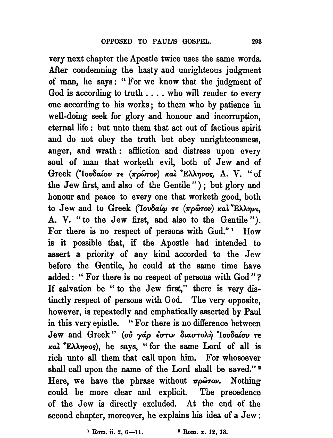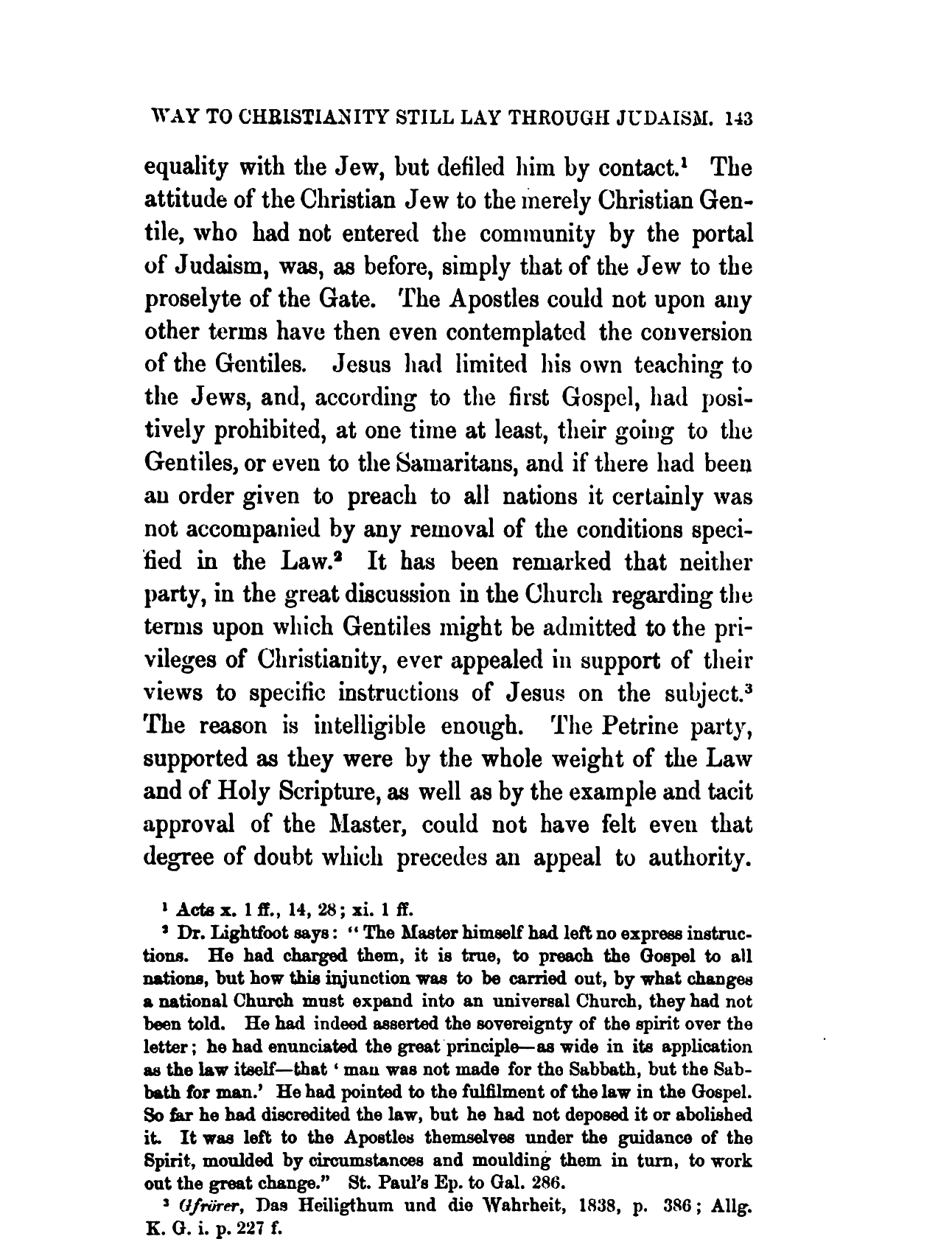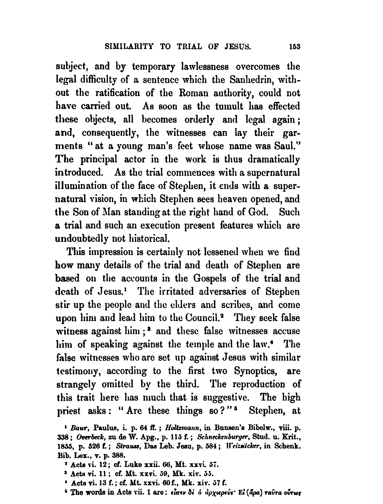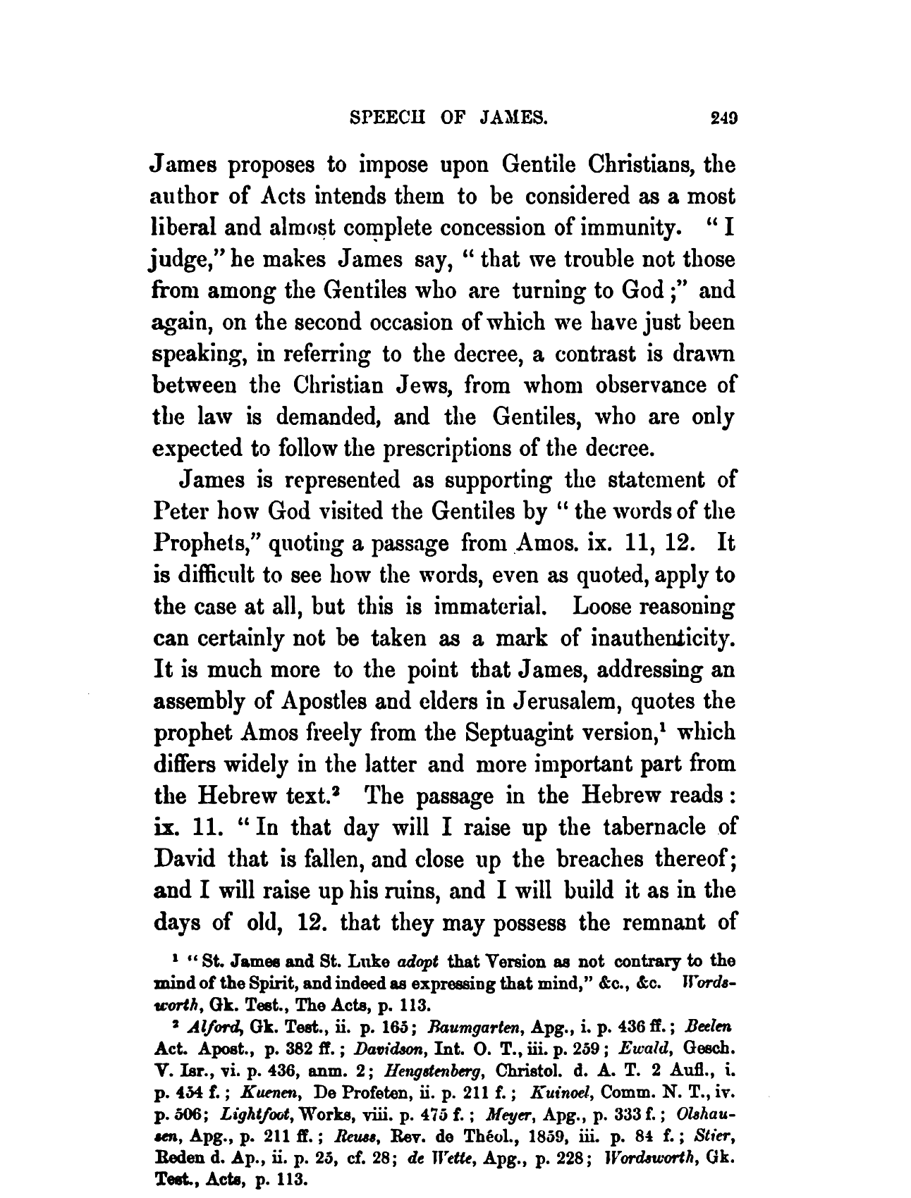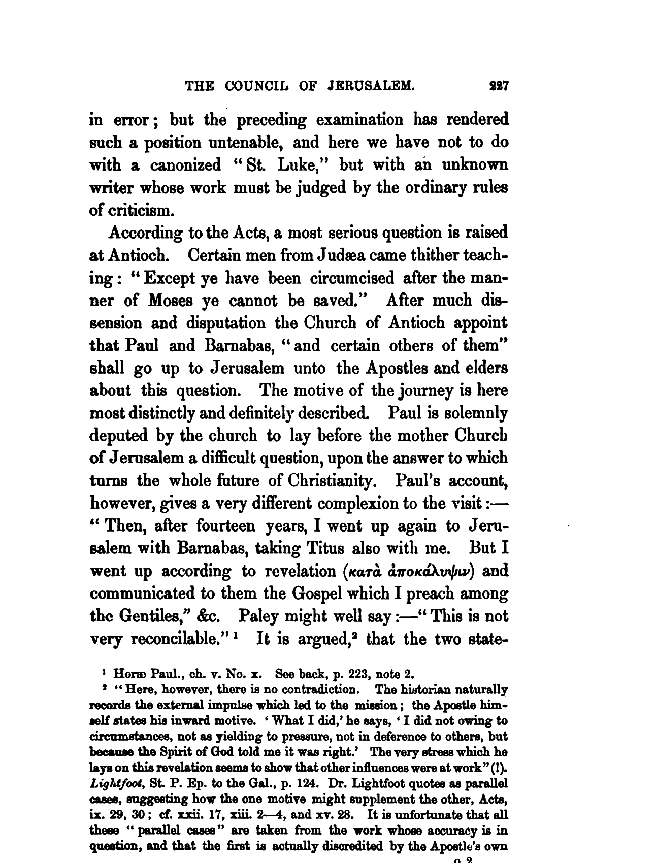 The slightest comparison of these passages suffices to show that the one is not dependent on the other. The Old Testament is full of passages in which the name of the Lord is magnified as the only source of safety and salvation. In the Pauline Epistles likewise there are numerous passages of a similar tenour. For instance, the passage from Joel ii. 32, is quoted Rom. x. 13: "For whosoever shall call on the name of the Lord shall be saved" [———](3) There was in fact no formula more current either amongst the Jews or in the early Church; and there is no legitimate ground for tracing such an expression to the Acts of the Apostles.(4)
