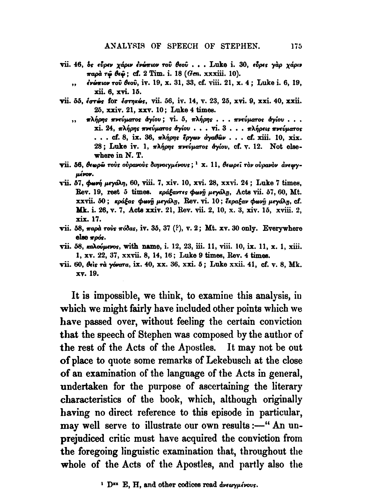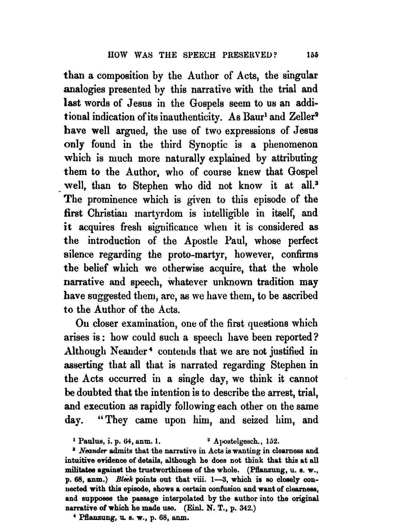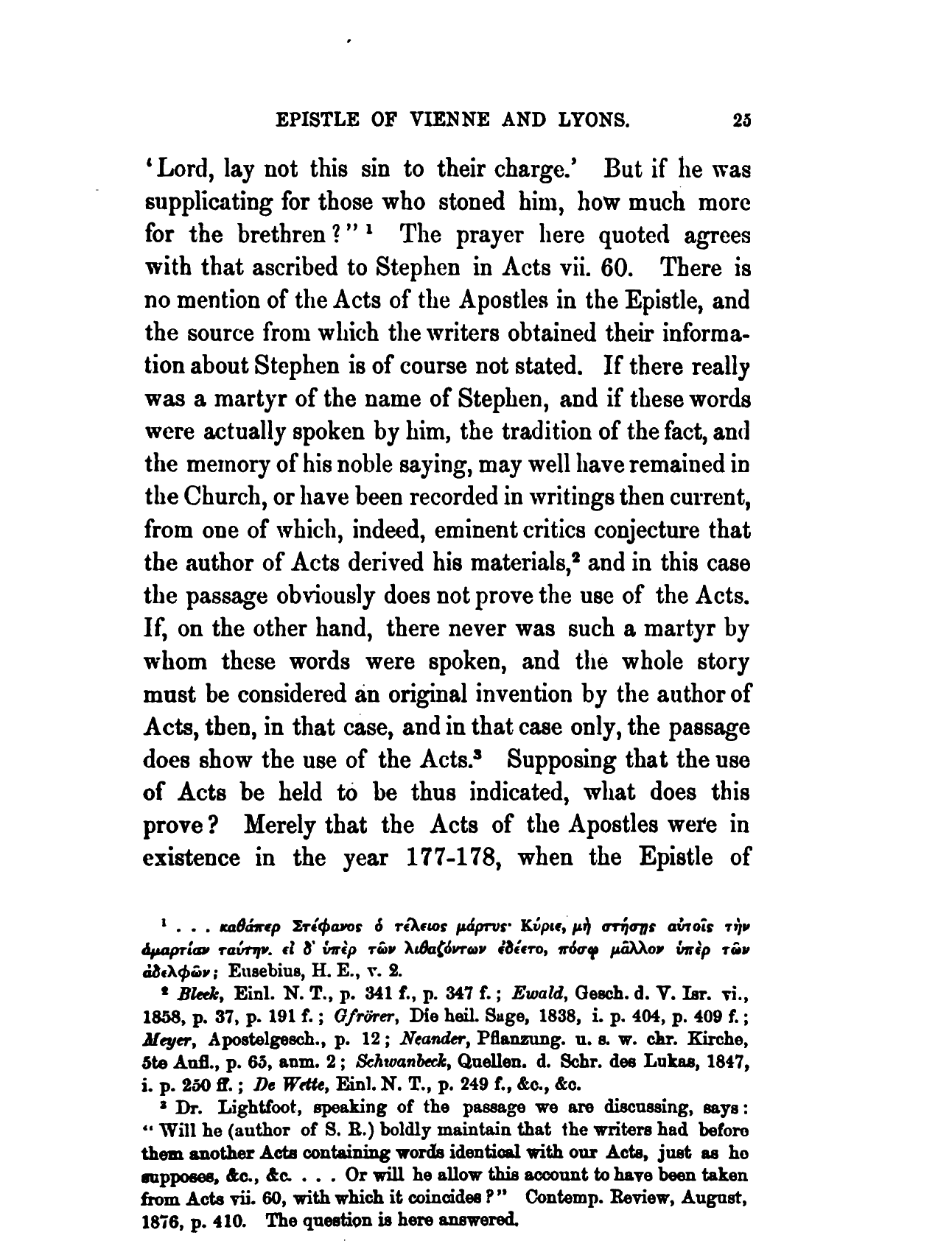 'Lord, lay not this sin to their charge.' But if he was supplicating for those who stoned him, how much more for the brethren?"(l) The prayer here quoted agrees with that ascribed to Stephen in Acts vii. 60. There is no mention of the Acts of the Apostles in the Epistle, and the source from which the writers obtained their information about Stephen is of course not stated. If there really was a martyr of the name of Stephen, and if these words were actually spoken by him, the tradition of the fact, and the memory of his noble saying, may well have remained in the Church, or have been recorded in writings then current, from one of which, indeed, eminent critics conjecture that the author of Acts derived his materials,2 and in this case the passage obviously does not prove the use of the Acts. If, on the other hand, there never was such a martyr by whom these words were spoken, and the whole story must be considered an original invention by the author of Acts, then, in that case, and in that case only, the passage does show the use of the Acts.(3) Supposing that the use of Acts be held to be thus indicated, what does this prove? Merely that the Acts of the Apostles were in existence in the year 177-178, when the Epistle of