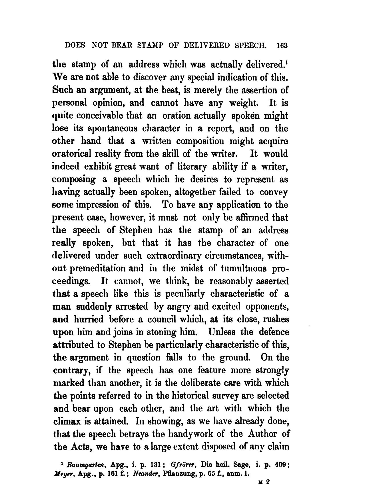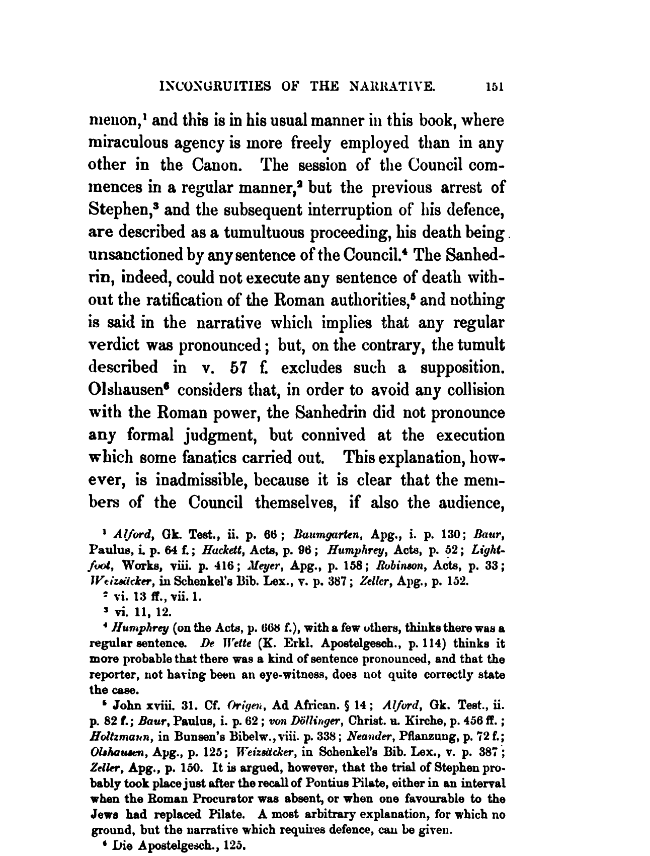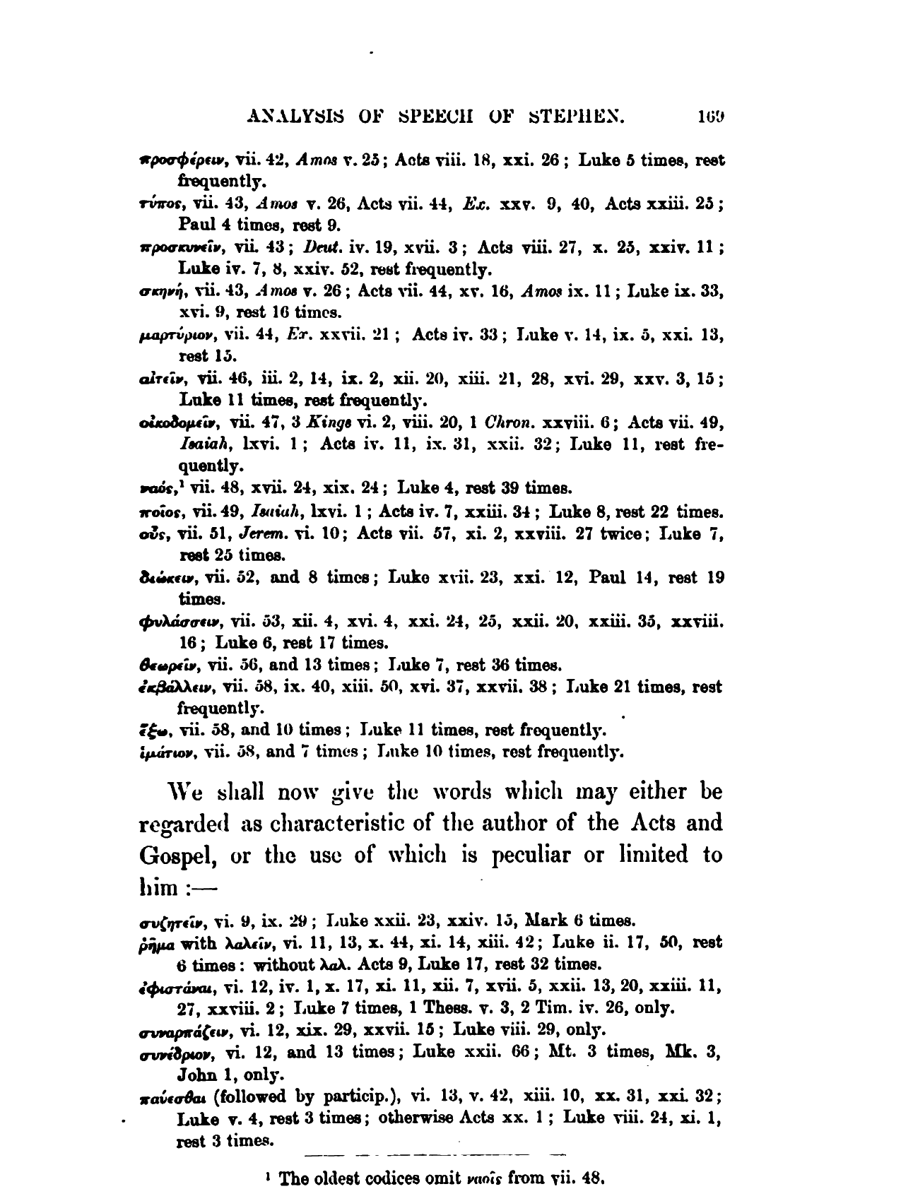 'Lord, lay not this sin to their charge.' But if he was supplicating for those who stoned him, how much more for the brethren?"(l) The prayer here quoted agrees with that ascribed to Stephen in Acts vii. 60. There is no mention of the Acts of the Apostles in the Epistle, and the source from which the writers obtained their information about Stephen is of course not stated. If there really was a martyr of the name of Stephen, and if these words were actually spoken by him, the tradition of the fact, and the memory of his noble saying, may well have remained in the Church, or have been recorded in writings then current, from one of which, indeed, eminent critics conjecture that the author of Acts derived his materials,2 and in this case the passage obviously does not prove the use of the Acts. If, on the other hand, there never was such a martyr by whom these words were spoken, and the whole story must be considered an original invention by the author of Acts, then, in that case, and in that case only, the passage does show the use of the Acts.(3) Supposing that the use of Acts be held to be thus indicated, what does this prove? Merely that the Acts of the Apostles were in existence in the year 177-178, when the Epistle of