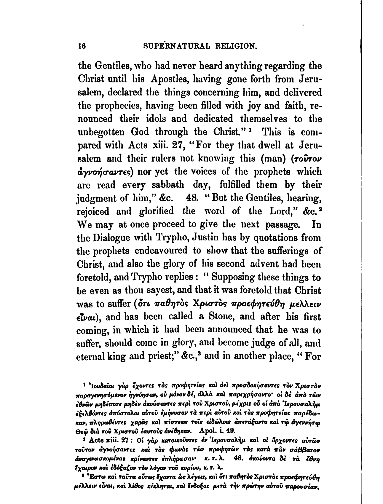 the Gentiles, who had never heard any thing regarding the Christ until his Apostles, having gone forth from Jerusalem, declared the things concerning him, and delivered the prophecies, having been filled with joy and faith, renounced their idols and dedicated themselves to the unbegotten God through the Christ"(1) This is compared with Acts xiii. 27, "For they that dwell at Jerusalem and their rulers not knowing this (man) [———] nor