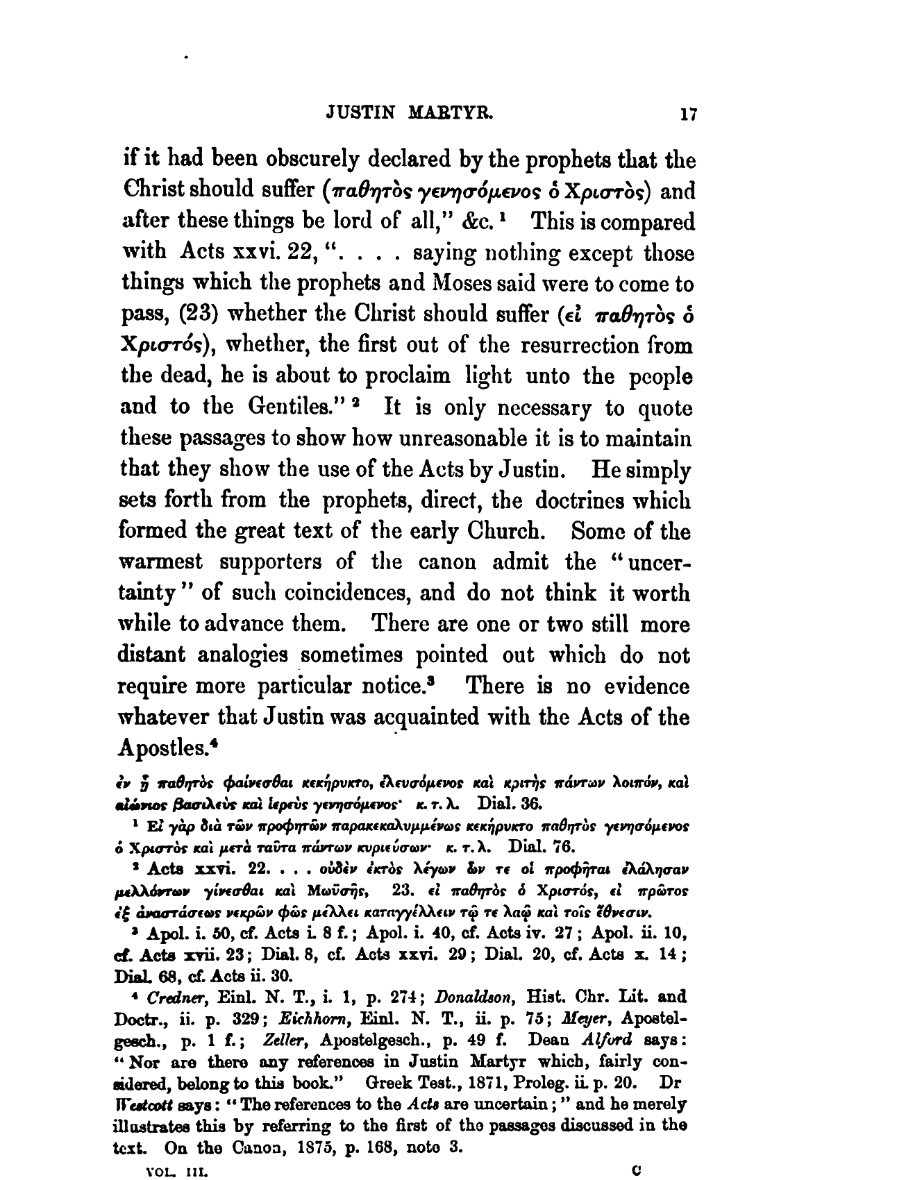 if it had been obscurely declared by the prophets that the Christ should suffer [———] and after these things be lord of all," &c.(1) This is compared with Acts xxvi. 22, ".... saying nothing except those things which the prophets and Moses said were to come to pass, (23) whether the Christ should suffer [———], whether, the first out of the resurrection from the dead, he is about to proclaim light unto the people and to the Gentiles."(2) It is only necessary to quote these passages to show how unreasonable it is to maintain that they show the use of the Acts by Justin. He simply sets forth from the prophets, direct, the doctrines which formed the great text of the early Church. Some of the warmest supporters of the canon admit the "uncertainty" of such coincidences, and do not think it worth while to advance them. There are one or two still more distant analogies sometimes pointed out which do not require more particular notice.(3) There is no evidence whatever that Justin was acquainted with the Acts of the Apostles.(4)
