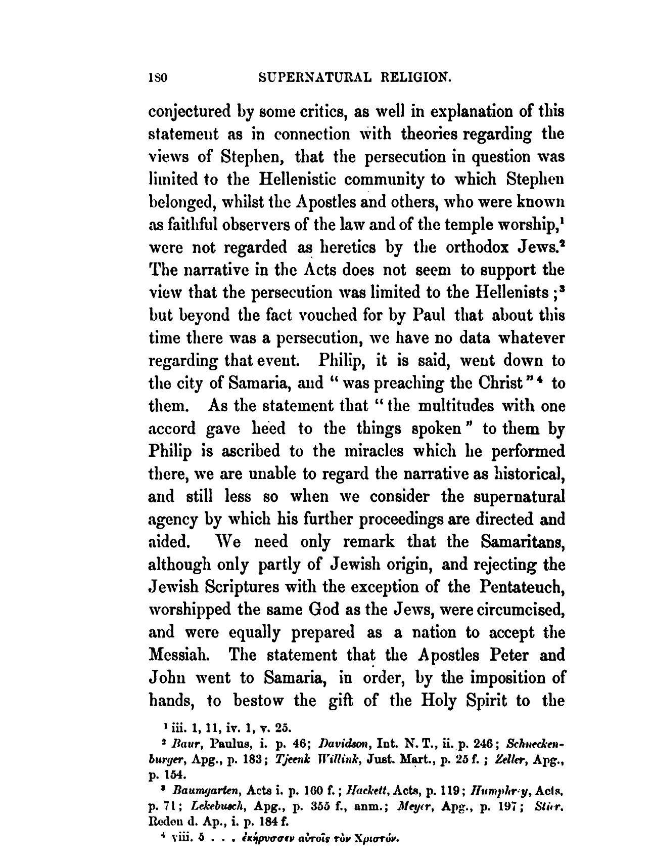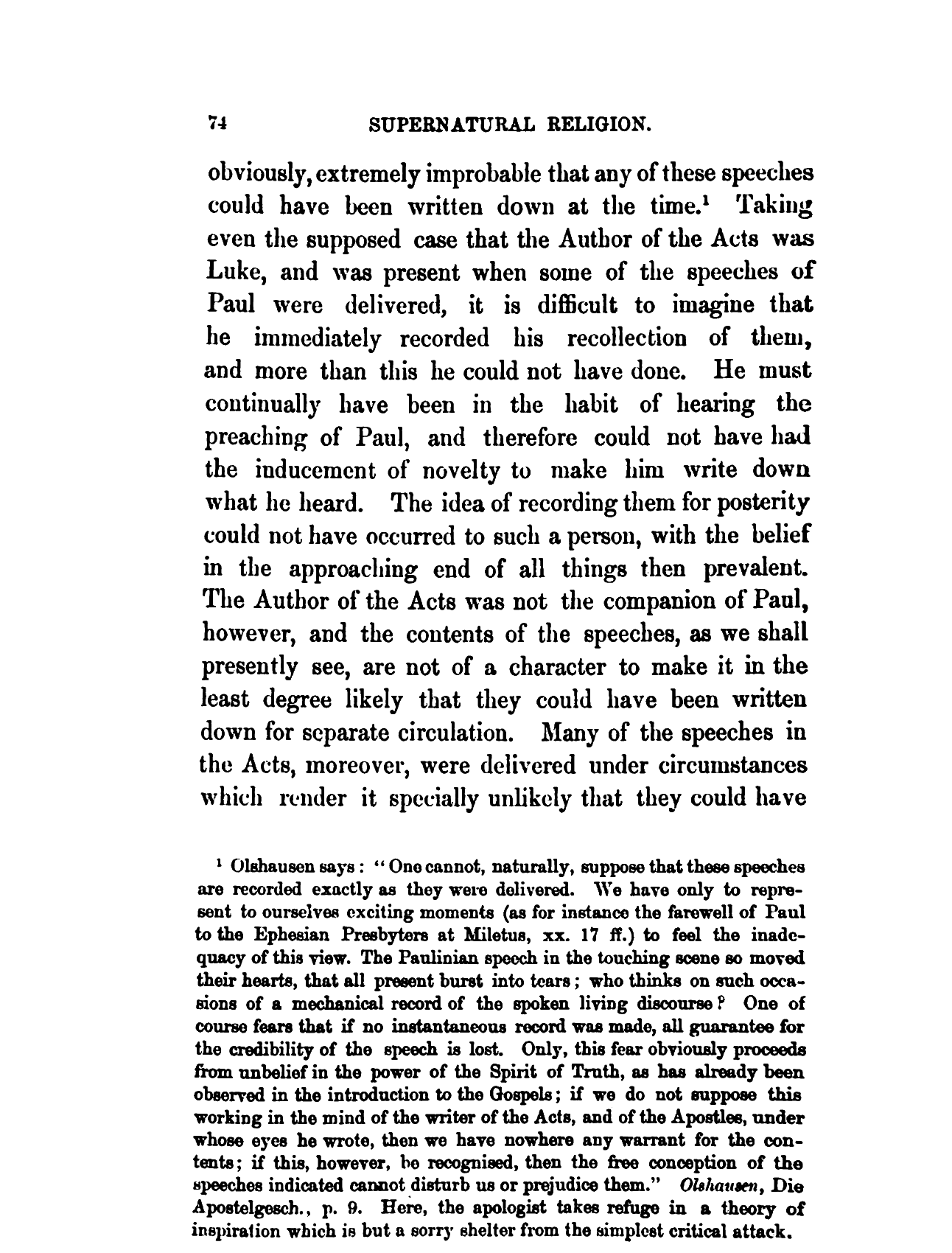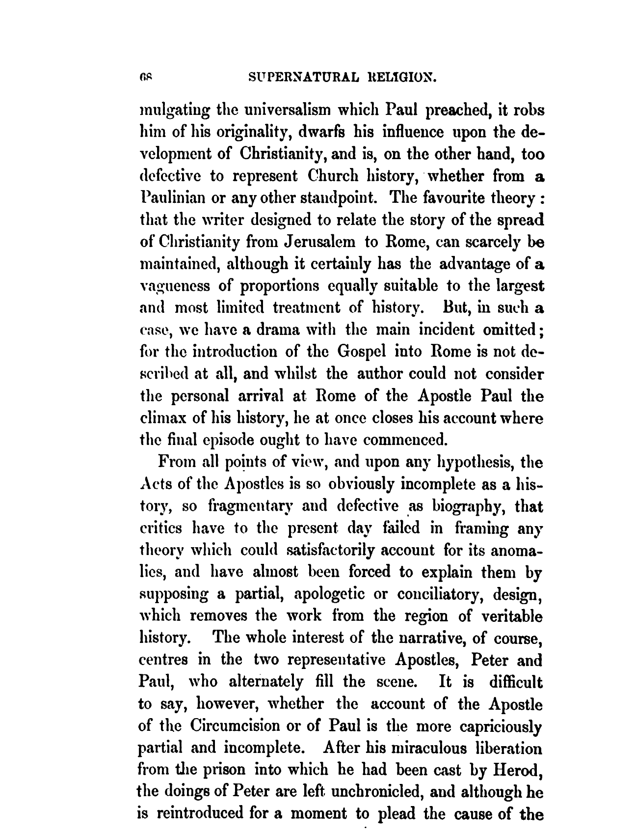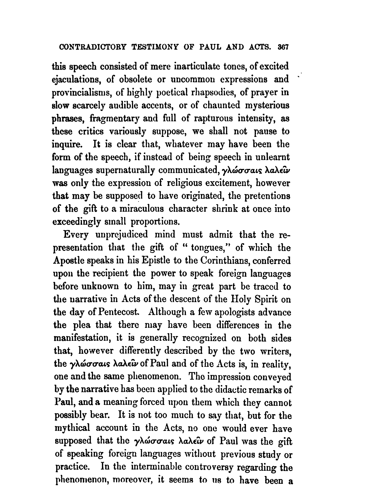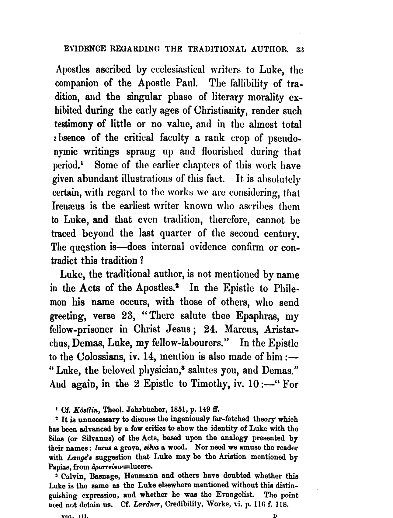 occurrences which, obviously, are antecedently incredible, upon the assurance of an anonymous work of whose existence there is no distinct evidence till more than a century after the events narrated, and to which an author's name—against which there are strong objections—is first ascribed by tradition towards the end of the second century. Of the writer to whom the work is thus attributed we know nothing beyond the casual mention of his name in some Pauline Epistles. If it were admitted that this Luke did actually write the book, we should not be justified in believing the reality of such stupendous miracles upon his bare statement As the case stands, however, even taking it in its most favourable aspect, the question scarcely demands serious attention, and our discussion might at once be ended by the unhesitating rejection of the Acts of the Apostles as sufficient, or even plausible, evidence for the miracles which it narrates.