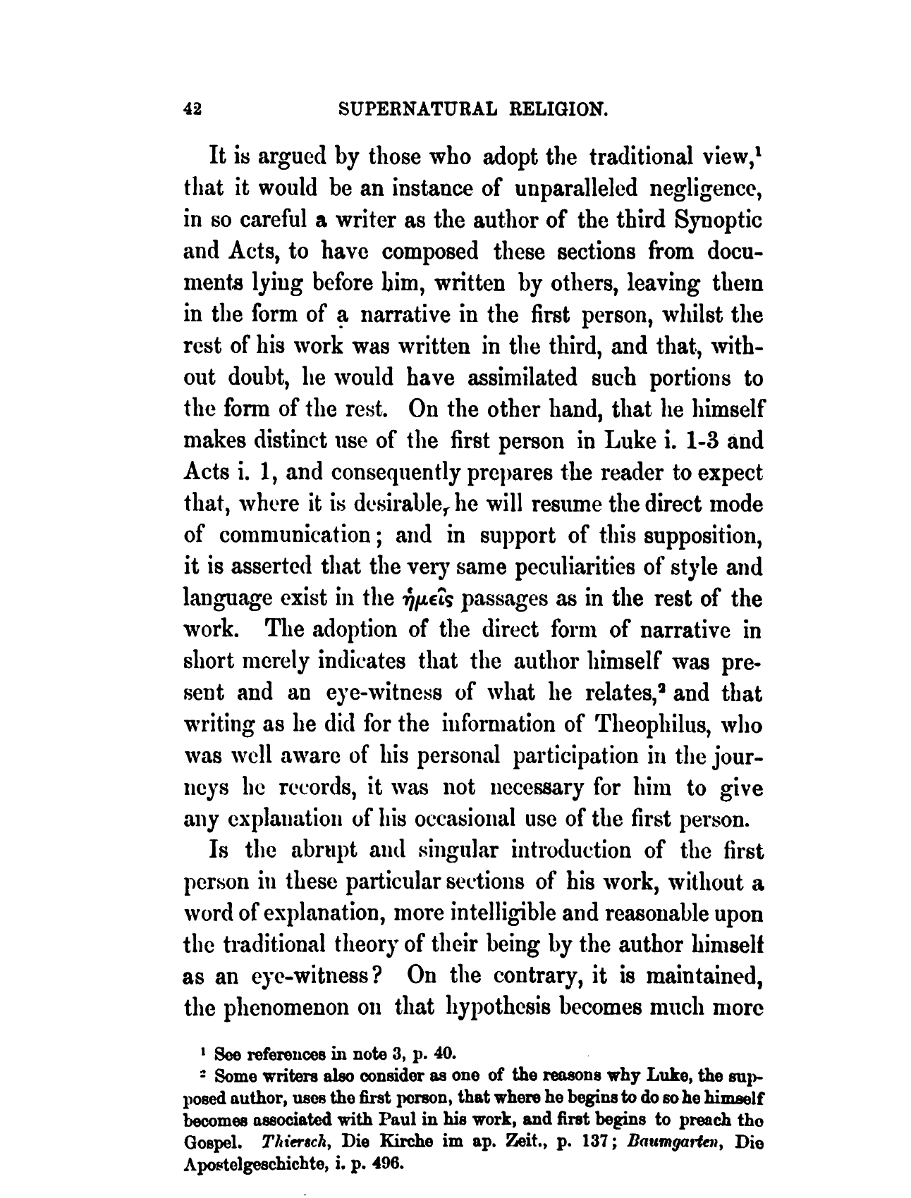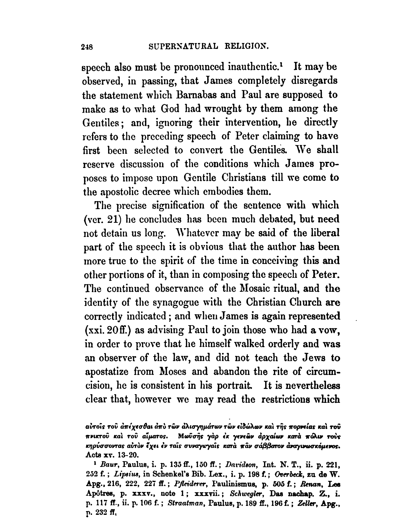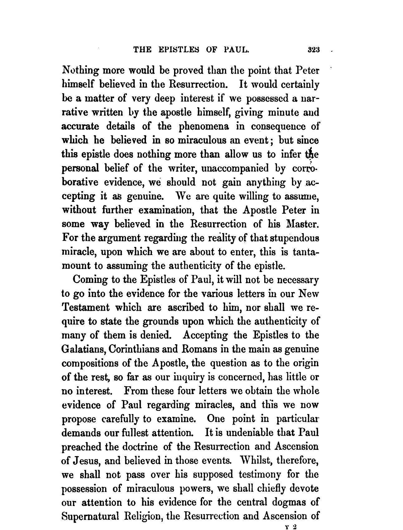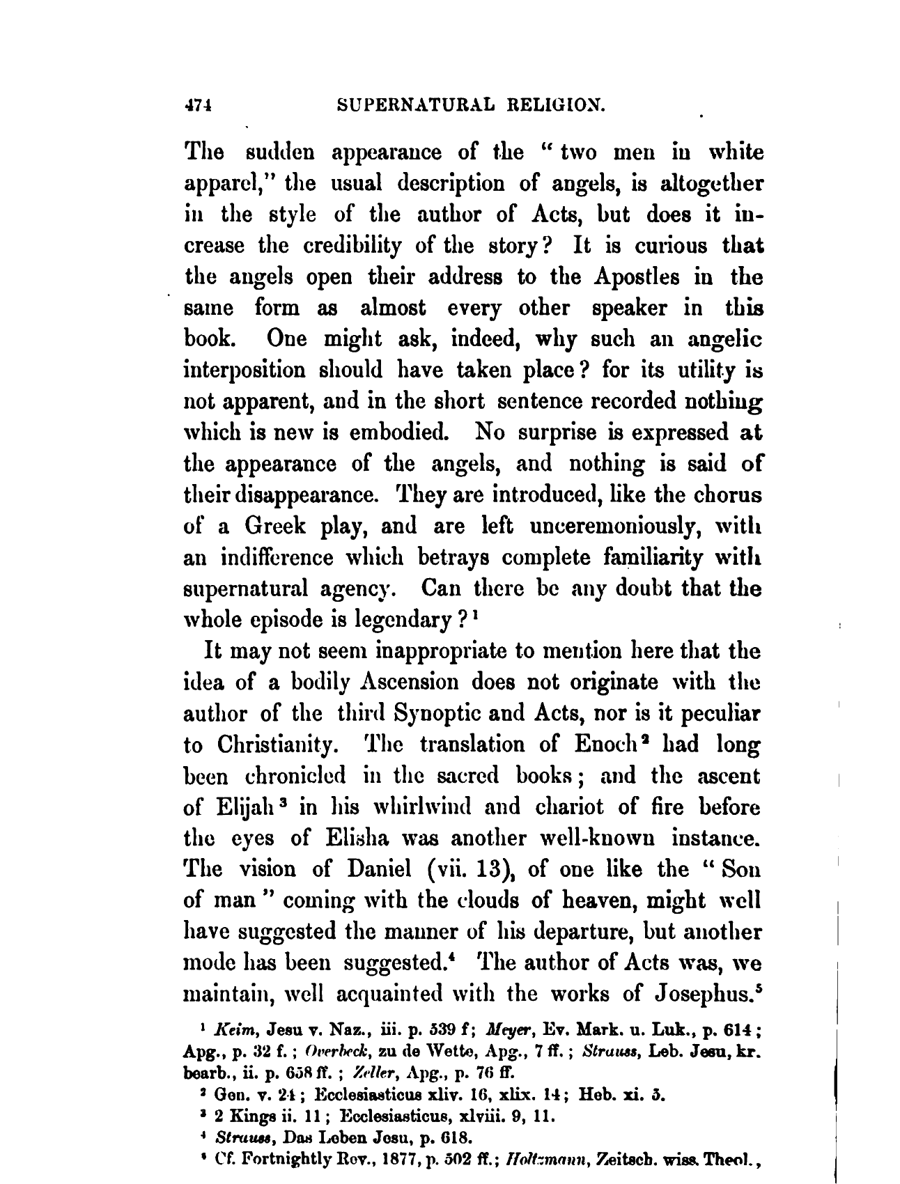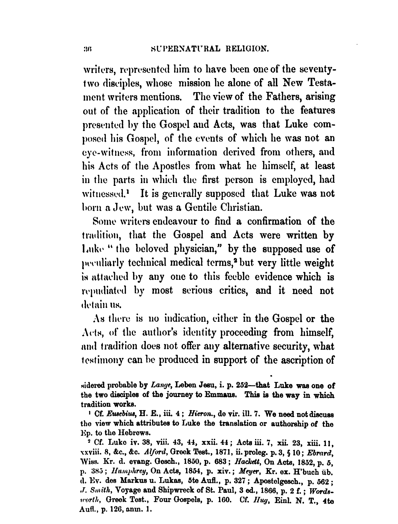occurrences which, obviously, are antecedently incredible, upon the assurance of an anonymous work of whose existence there is no distinct evidence till more than a century after the events narrated, and to which an author's name—against which there are strong objections—is first ascribed by tradition towards the end of the second century. Of the writer to whom the work is thus attributed we know nothing beyond the casual mention of his name in some Pauline Epistles. If it were admitted that this Luke did actually write the book, we should not be justified in believing the reality of such stupendous miracles upon his bare statement As the case stands, however, even taking it in its most favourable aspect, the question scarcely demands serious attention, and our discussion might at once be ended by the unhesitating rejection of the Acts of the Apostles as sufficient, or even plausible, evidence for the miracles which it narrates.