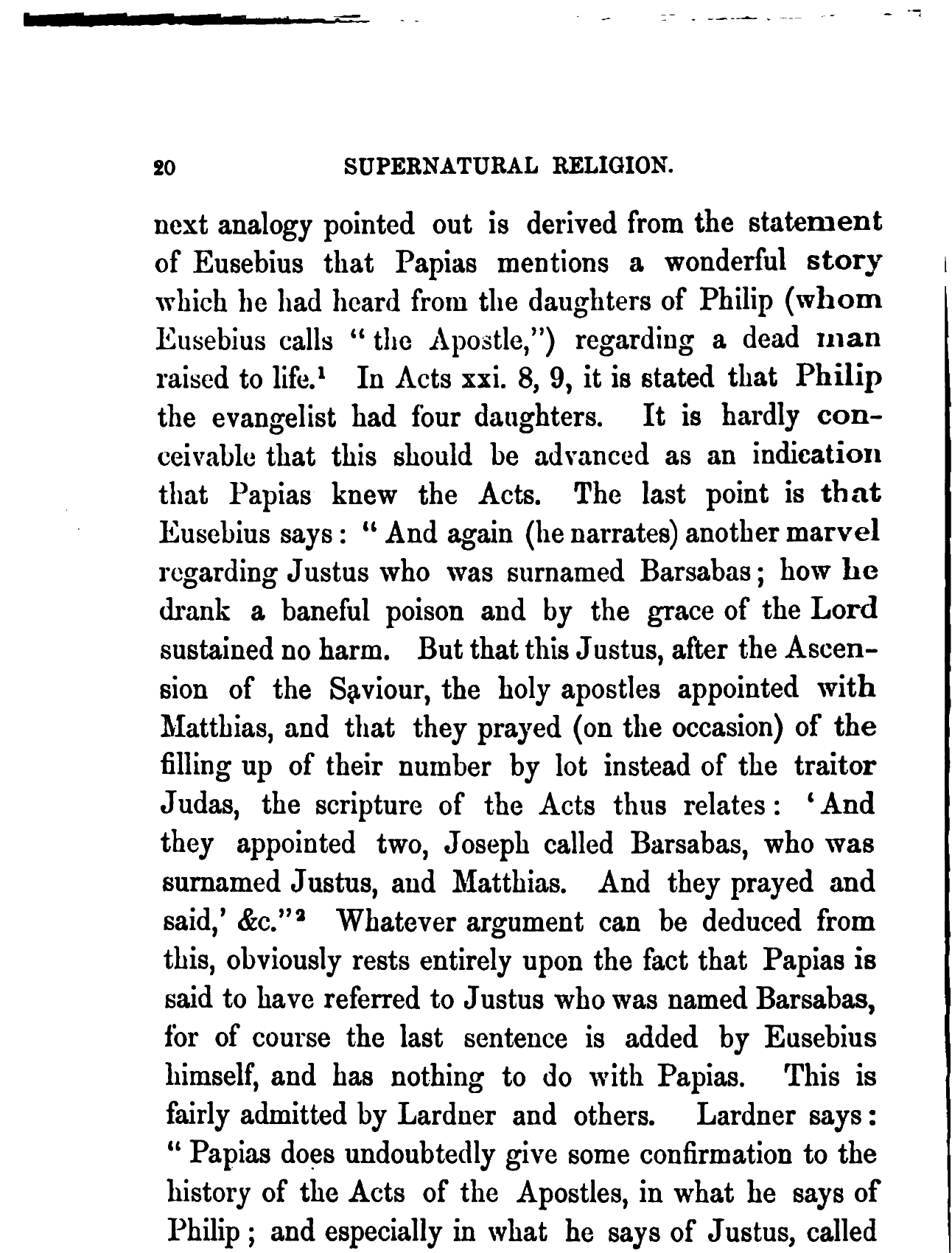next analogy pointed out is derived from the statement of Eusebius that Papias mentions a wonderful story which he had heard from the daughters of Philip (whom Eusebius calls "the Apostle,") regarding a dead man raised to life.(1) In Acts xxi. 8, 9, it is stated that Philip the evangelist had four daughters. It is hardly conceivable that this should be advanced as an indication that Papias knew the Acts. The last point is that Eusebius says: "And again (he narrates) another marvel regarding Justus who was surnamed Barsabas; how he drank a baneful poison and by the grace of the Lord sustained no harm. But that this Justus, after the Ascension of the Saviour, the holy apostles appointed with Matthias, and that they prayed (on the occasion) of the filling up of their number by lot instead of the traitor Judas, the scripture of the Acts thus relates: 'And they appointed two, Joseph called Barsabas, who was surnamed Justus, and Matthias. And they prayed and said,' &c."(2) Whatever argument can be deduced from this, obviously rests entirely upon the fact that Papias is said to have referred to Justus who was named Barsabas, for of course the last sentence is added by Eusebius himself, and has nothing to do with Papias. This is fairly admitted by Lardner and others. Lardner says: "Papias does undoubtedly give some confirmation to the history of the Acts of the Apostles, in what he says of Philip; and especially in what he says of Justus, called