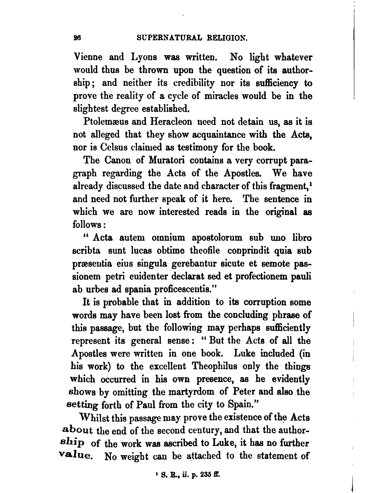 The Canon of Muratori contains a very corrupt paragraph regarding the Acts of the Apostles. We have already discussed the date and character of this fragment,(1) and need not further speak of it here. The sentence in which we are now interested reads in the original as follows: