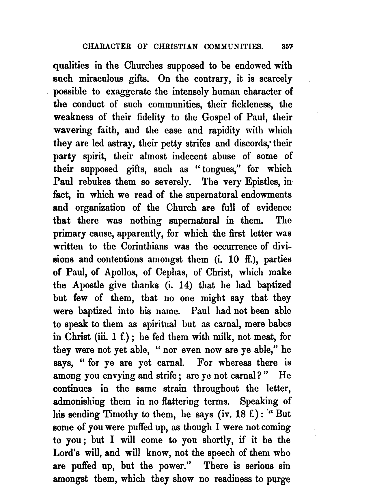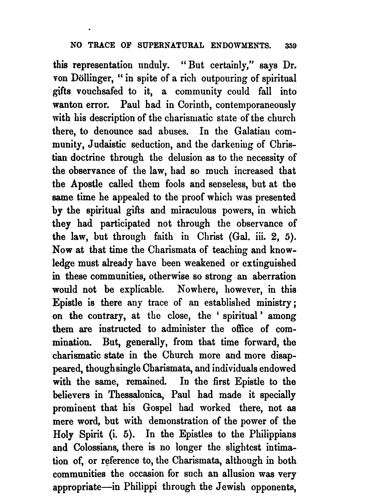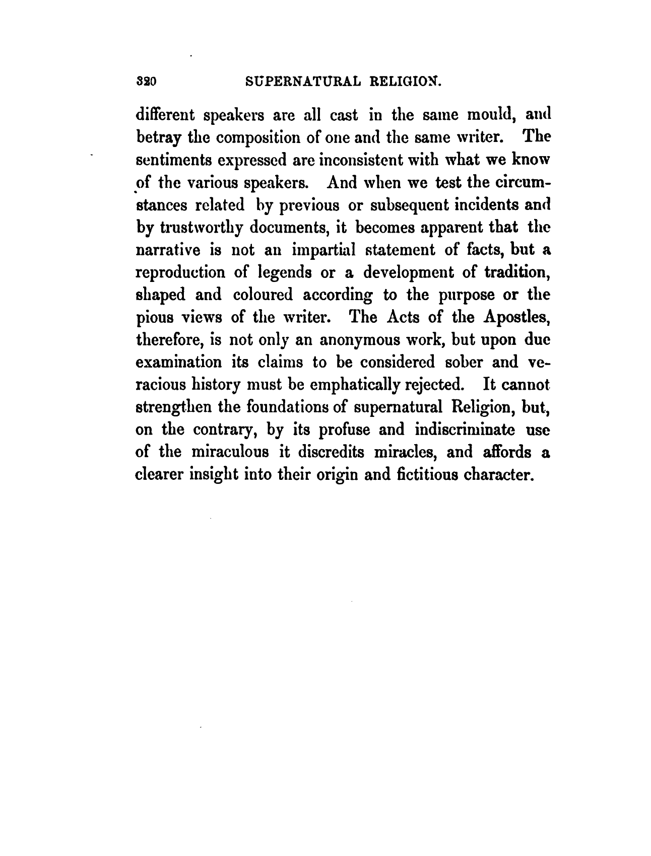 Applying similar tests to the Acts of the Apostles, we arrived at similar results. Acknowledged to be composed by the same author who produced the third Synoptic, that author's identity is not thereby made more clear. There is no evidence of the slightest value regarding its character, but, on the other hand, the work itself teems to such an extent with miraculous incidents and supernatural agency, that the credibility of the narrative requires an extraordinary amount of attestation to secure for it any serious consideration. When the statements of the author are compared with the emphatic declarations of the Apostle Paul, and with authentic accounts of the development of the early Christian Church, it becomes evident that the Acts of the Apostles, as might have been supposed, is a legendary composition of a later day, which cannot be regarded as sober and credible history, and rather discredits than tends to establish the reality of the miracles with which its pages so suspiciously abound.