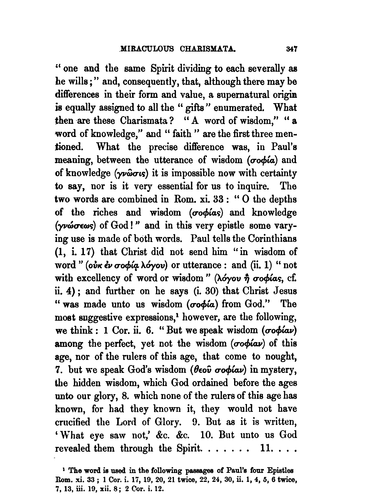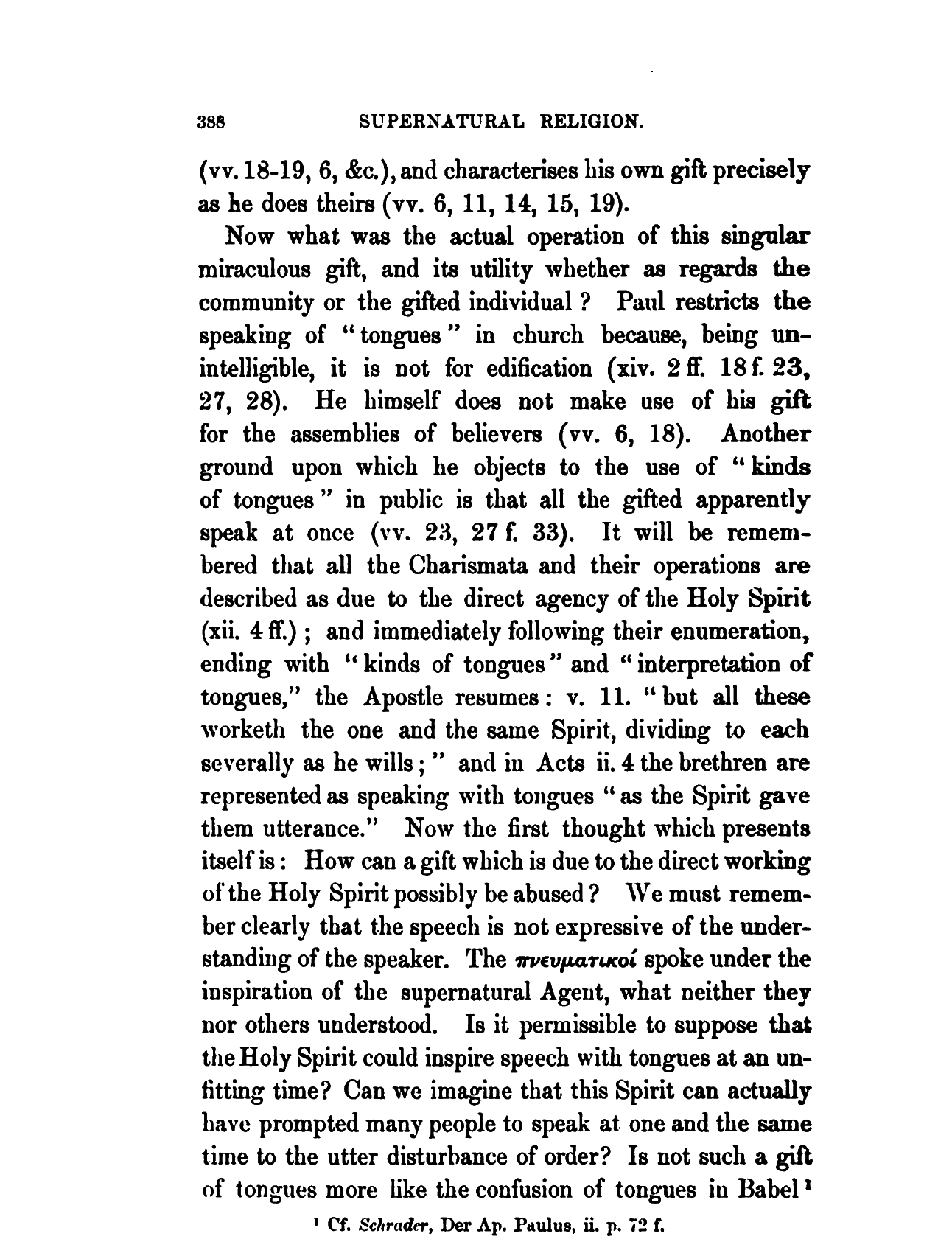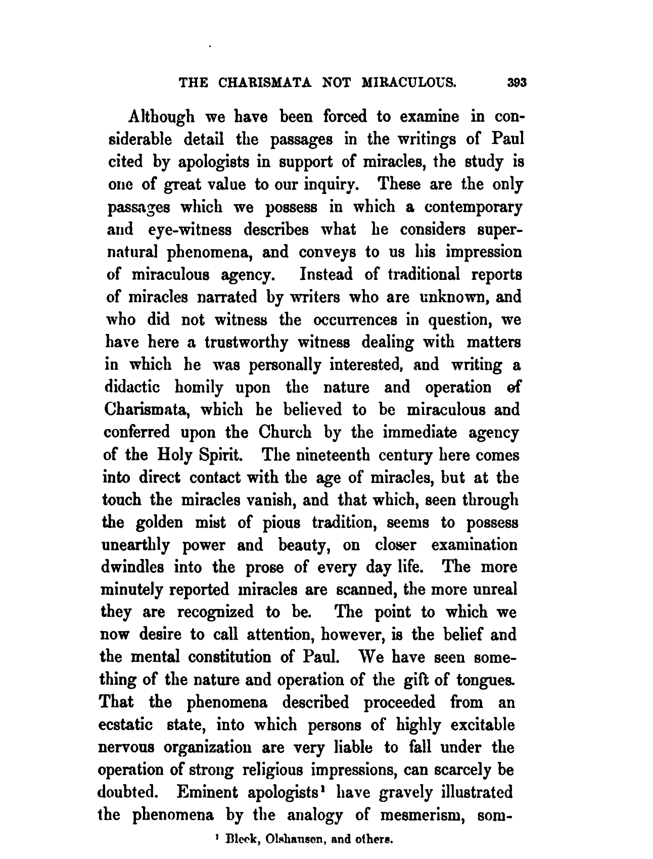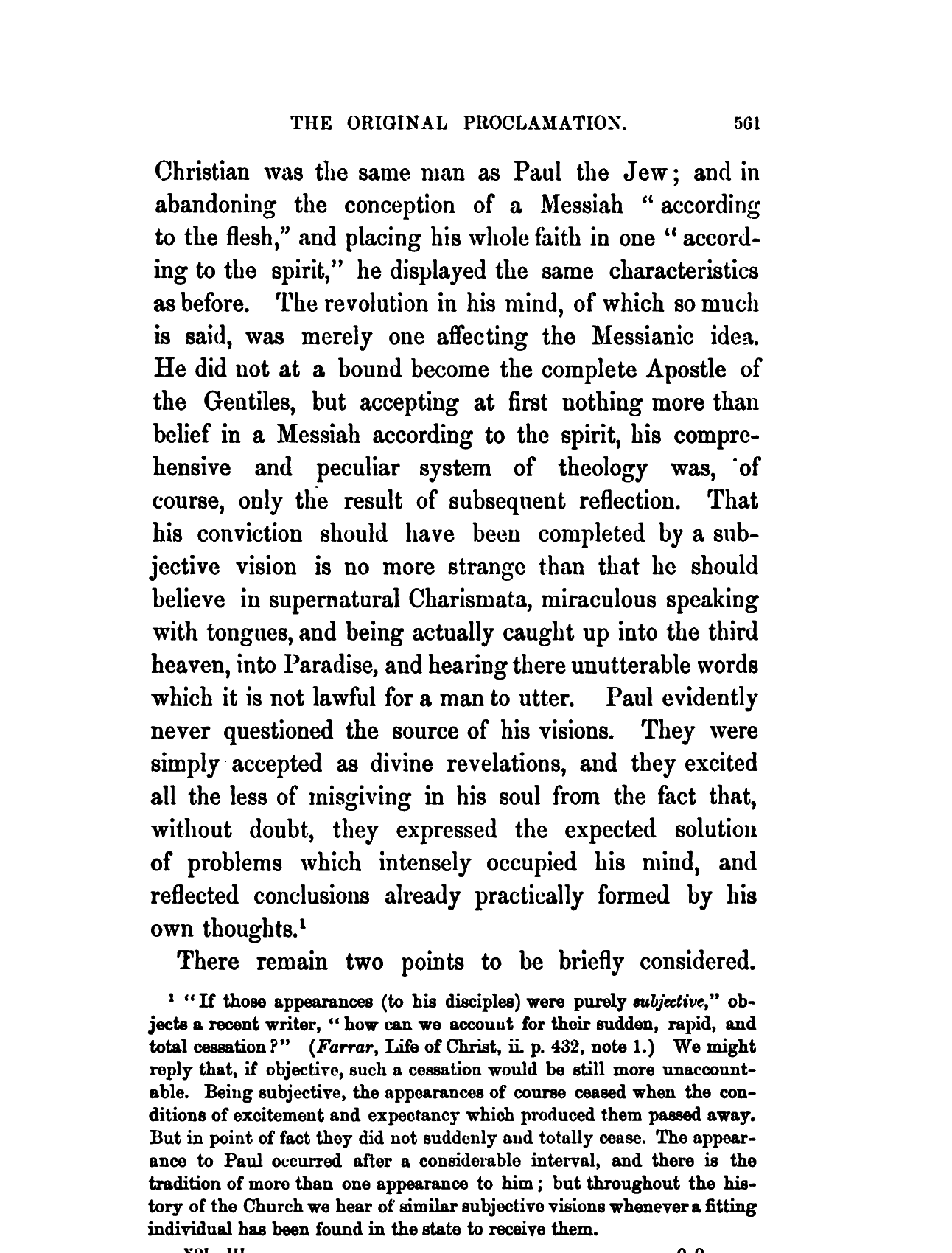 Christian was the same man as Paul the Jew; and in abandoning the conception of a Messiah "according to the flesh," and placing his whole faith in one "according to the spirit," he displayed the same characteristics as before. The revolution in his mind, of which so much is said, was merely one affecting the Messianic idea. He did not at a bound become the complete Apostle of the Gentiles, but accepting at first nothing more than belief in a Messiah according to the spirit, his comprehensive and peculiar system of theology was, "of course, only the result of subsequent reflection. That his conviction should have been completed by a subjective vision is no more strange than that he should believe in supernatural Charismata, miraculous speaking with tongues, and being actually caught up into the third heaven, into Paradise, and hearing there unutterable words which it is not lawful for a man to utter. Paul evidently never questioned the source of his visions. They were simply accepted as divine revelations, and they excited all the less of misgiving in his soul from the fact that, without doubt, they expressed the expected solution of problems which intensely occupied his mind, and reflected conclusions already practically formed by his own thoughts.(1)