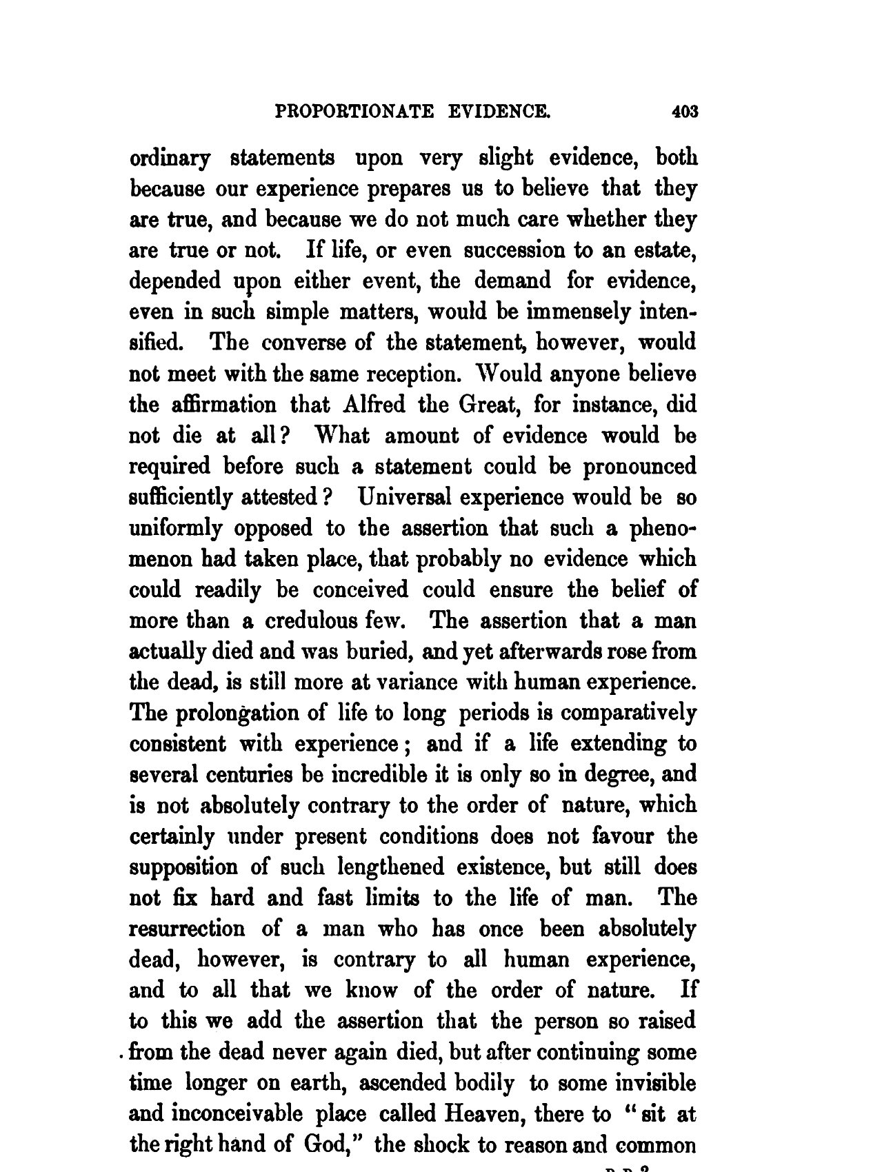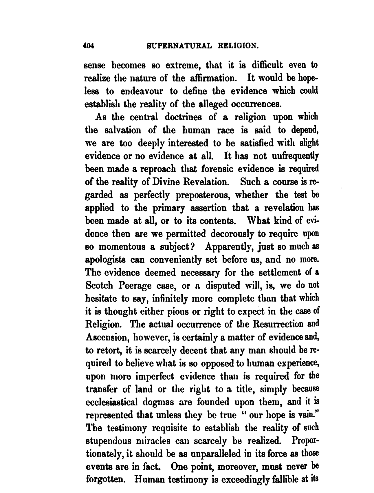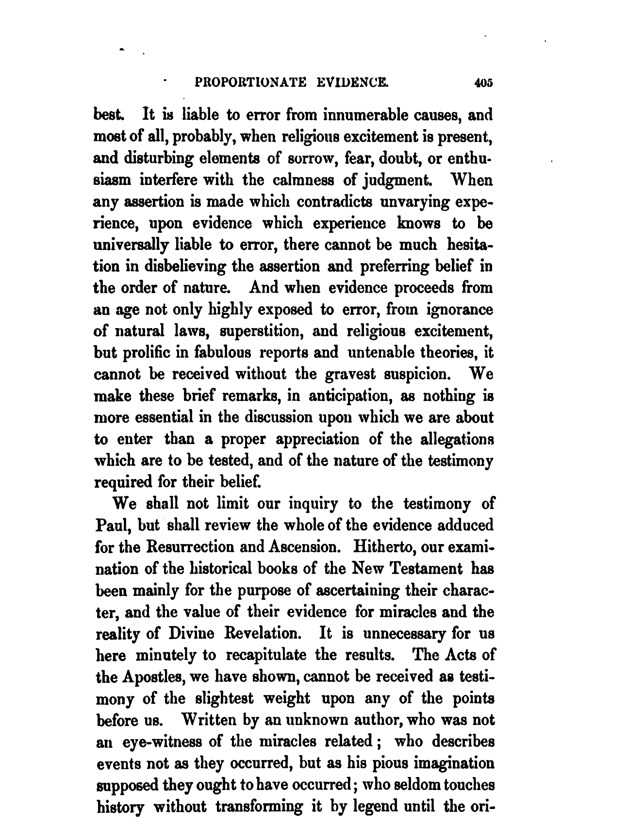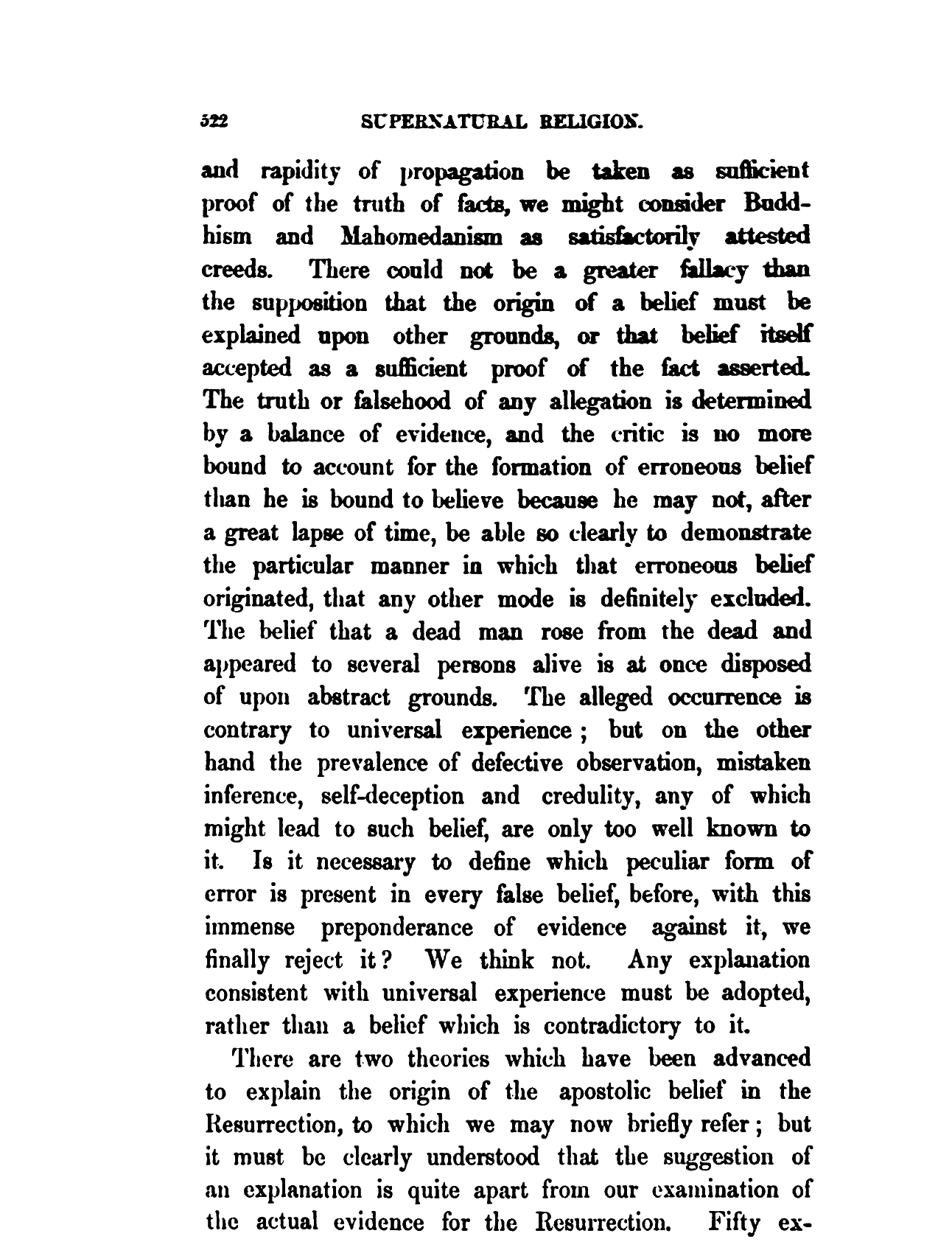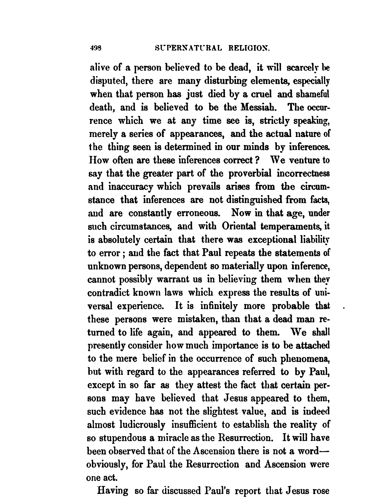 of any of the supposed appearances of the risen Jesus which he so briefly catalogues. Paul's own personal testimony to the Resurrection is limited to a vision of Jesus, of which we have no authentic details, seen many years after the alleged miracle. Considering the peculiar and highly nervous temperament of Paul, of which he himself supplies abundant evidence, there can be no hesitation in deciding that this vision was purely subjective, as were likewise, in all probability, the appearances to the excited disciples of Jesus. The testimony of Paul himself, before his imagination was stimulated to ecstatic fervour by the beauty of a spiritualized religion, was an earnest denial of the great Christian dogma emphasized by the active persecution of those who affirmed it, and a vision, especially in the case of one so constituted, supposed to be seen many years after the fact of the Resurrection had ceased to be capable of verification, is not an argument of convincing force. We were compelled to pronounce the evidence for the Resurrection and Ascension absolutely and hopelessly inadequate to prove the reality of such stupendous miracles, which must consequently be unhesitatingly rejected. There is no reason given, or even conceivable, why allegations such as these, and dogmas affecting the religion and even the salvation of the human race, should be accepted upon evidence which would be declared totally insufficient in the case of any common question of property or title before a legal tribunal On the contrary, the more momentous the point to be established, the more complete must be the proof required.