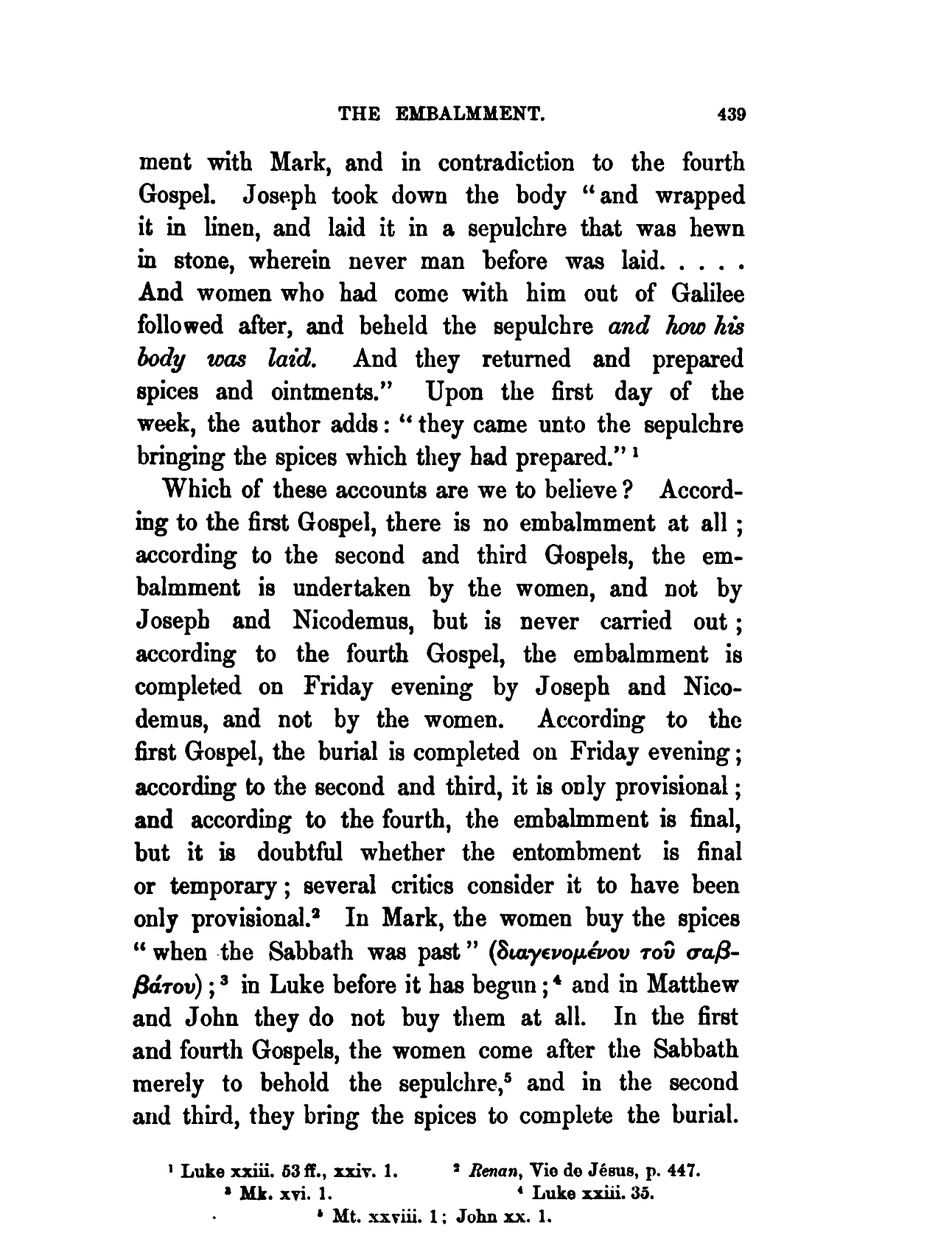 themselves to the fate of Jesus by rushing into the highways and asserting the Resurrection. Beyond the statement of the Gospels, the value of which we have seen, and a statement accompanied by so many confused circumstances, there is no evidence whatever that the sepulchre was found empty. There is no evidence that the sepulchre was really known to the disciples, none of whom, probably, was present at the crucifixion; and it might well be inferred that the women, who are represented as ignorant that the body had already been embalmed, yet who are the chief supposed witnesses for the empty sepulchre and the informants of the disciples, were equally ignorant of the sepulchre in which the body was laid. We might ask whether the 500 brethren who are said to have seen Jesus at the same time came from Galilee, or wherever they were, and examined the state of the sepulchre? We have already said, however, that if the sepulchre had been shown to be empty, the very last thing which could be proved by that circumstance would be the correctness of the assertion that it had become so in consequence of a stupendous miracle. On the other hand, if it had been shown that it was occupied by a body, it is exceedingly doubtful whether the fact would have convinced any one not previously sure that Jesus could not have risen from the dead, and he would not have required such evidence. When the Resurrection was publicly proclaimed as a fact, the body could no longer have been recognizable, and the idea that any of those in authority could have thought such demonstration necessary to refute a story whispered about amongst an obscure sect in Jerusalem, or even more courageously asserted, is a product of later times. When Jesus of Nazareth, the head of the nascent sect, was suppressed